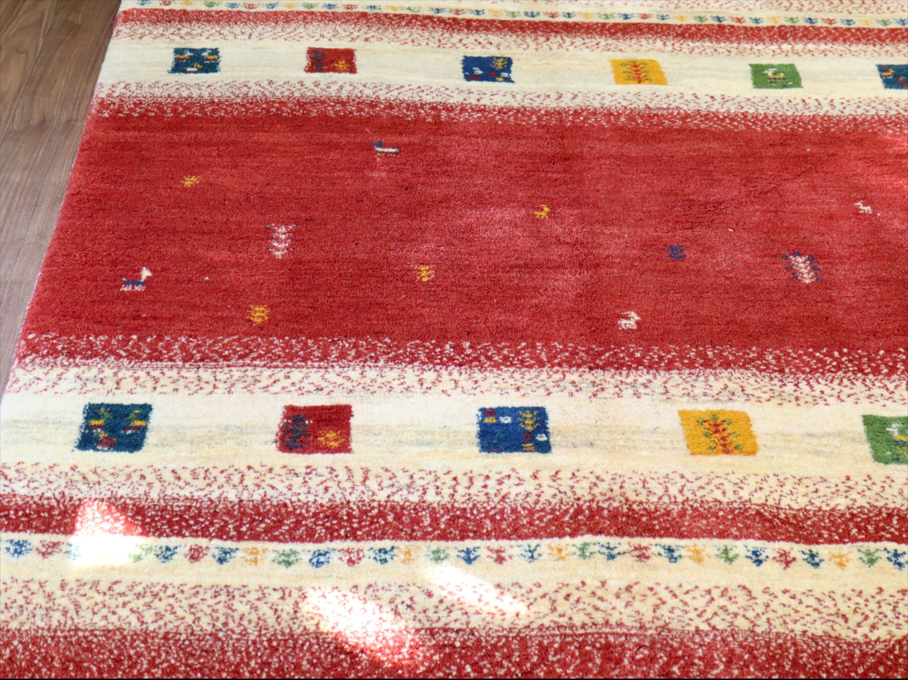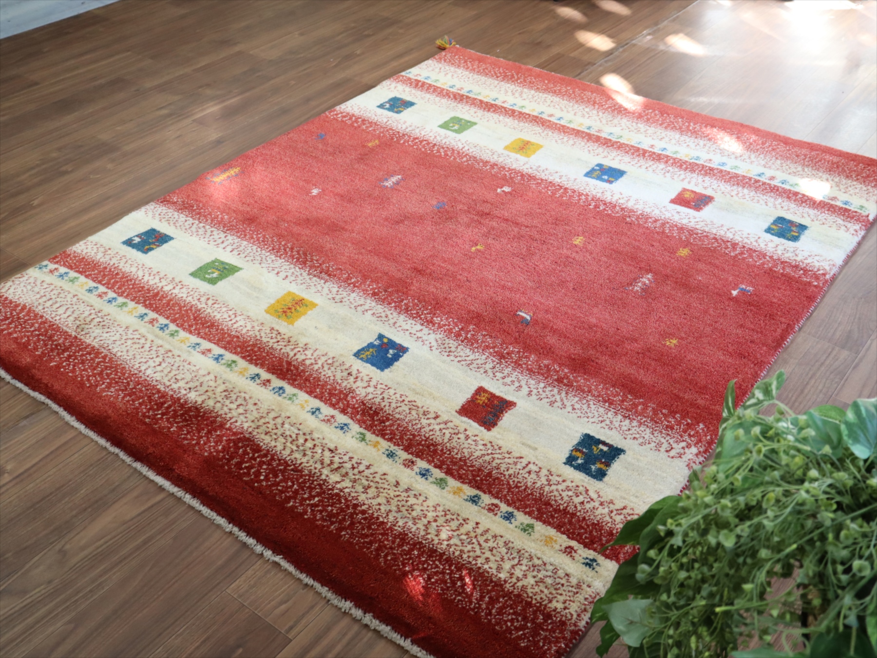 ギャッベ カシュカイ族の手織りラグ 189x154cm レッド&ナチュラルアイボリー