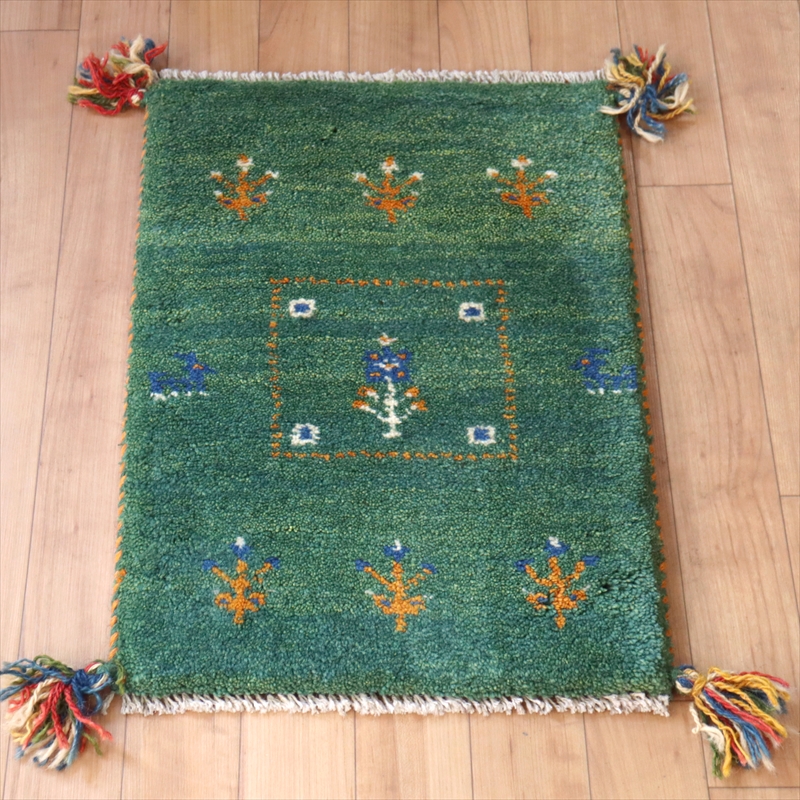 - ギャッベ イラン産 手織り 54x38cm ふかふか グリーン