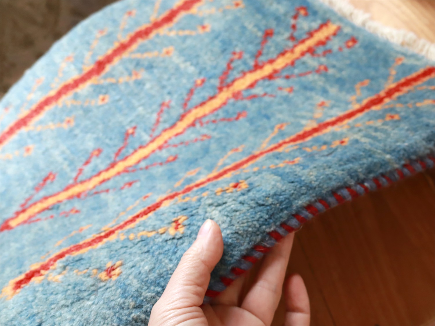 | 毛足(パイル)が長く、ふかふかとしたボリュームのある織りのギャッベです。ベースを含めたラグ全体の厚みは2cm前後。 |
