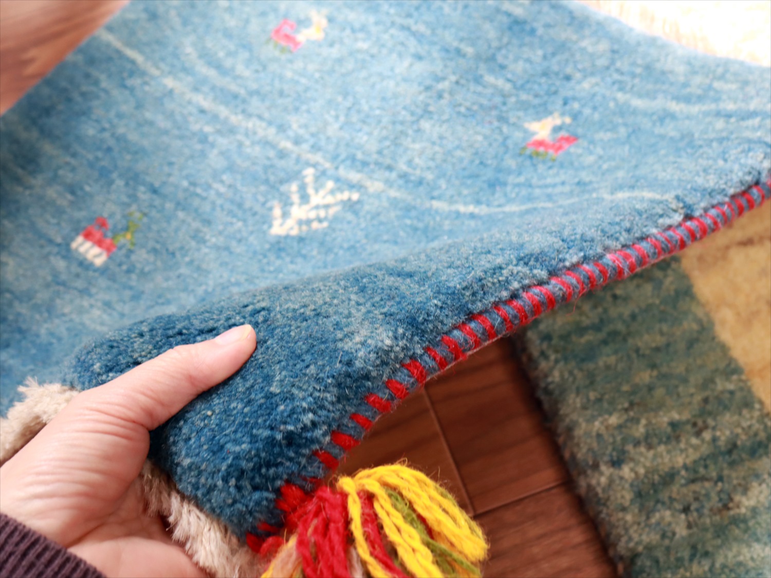| 毛足が長く、パイルを含めたギャッベ全体の厚みは2.2-2.3cm程度。ボリューム感たっぷりのふかふかギャッベです。 |
