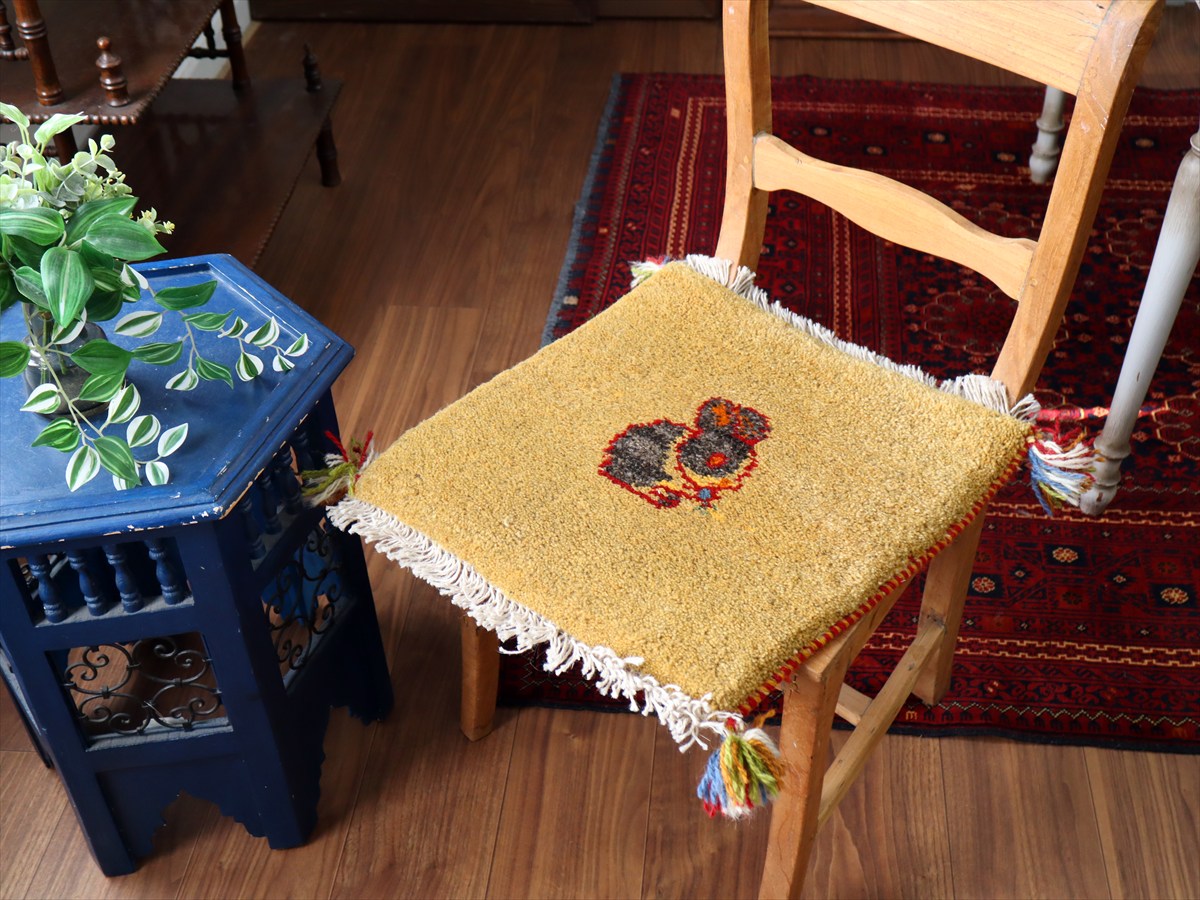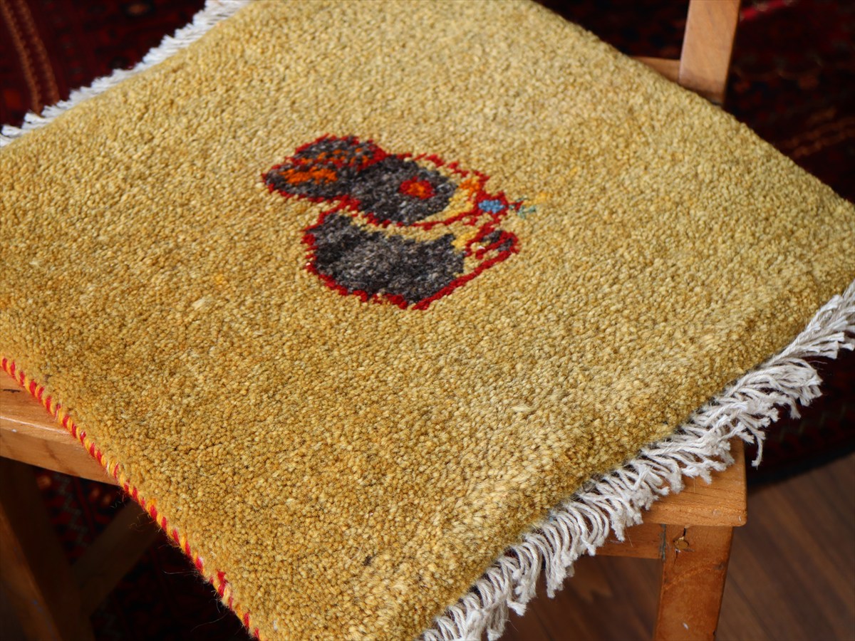 ギャッベ イラン産手織り 座布団サイズ44×42cm ゴールデンイエロー 草をはむうさぎ