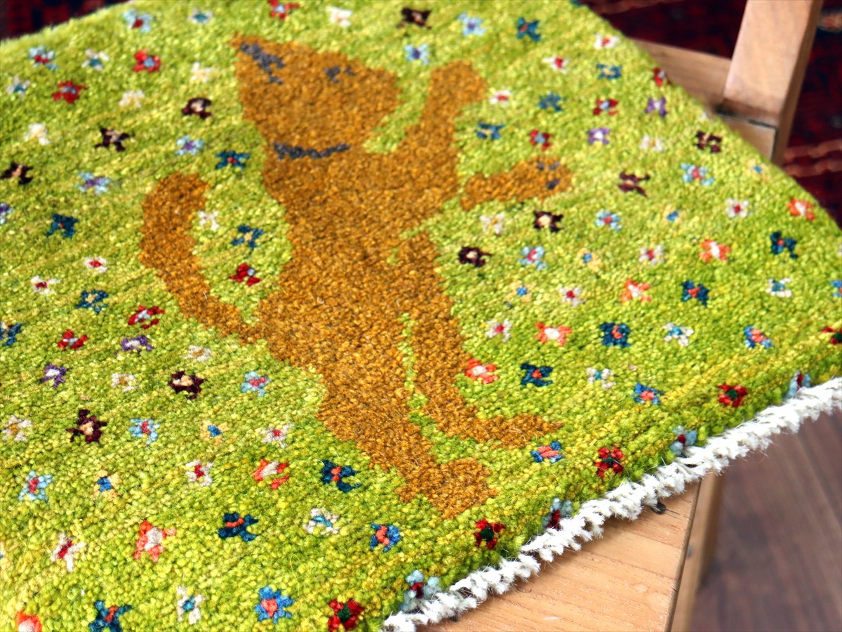 ギャッベ イラン産手織り 座布団サイズ39×41cm グリーン 猫とドット