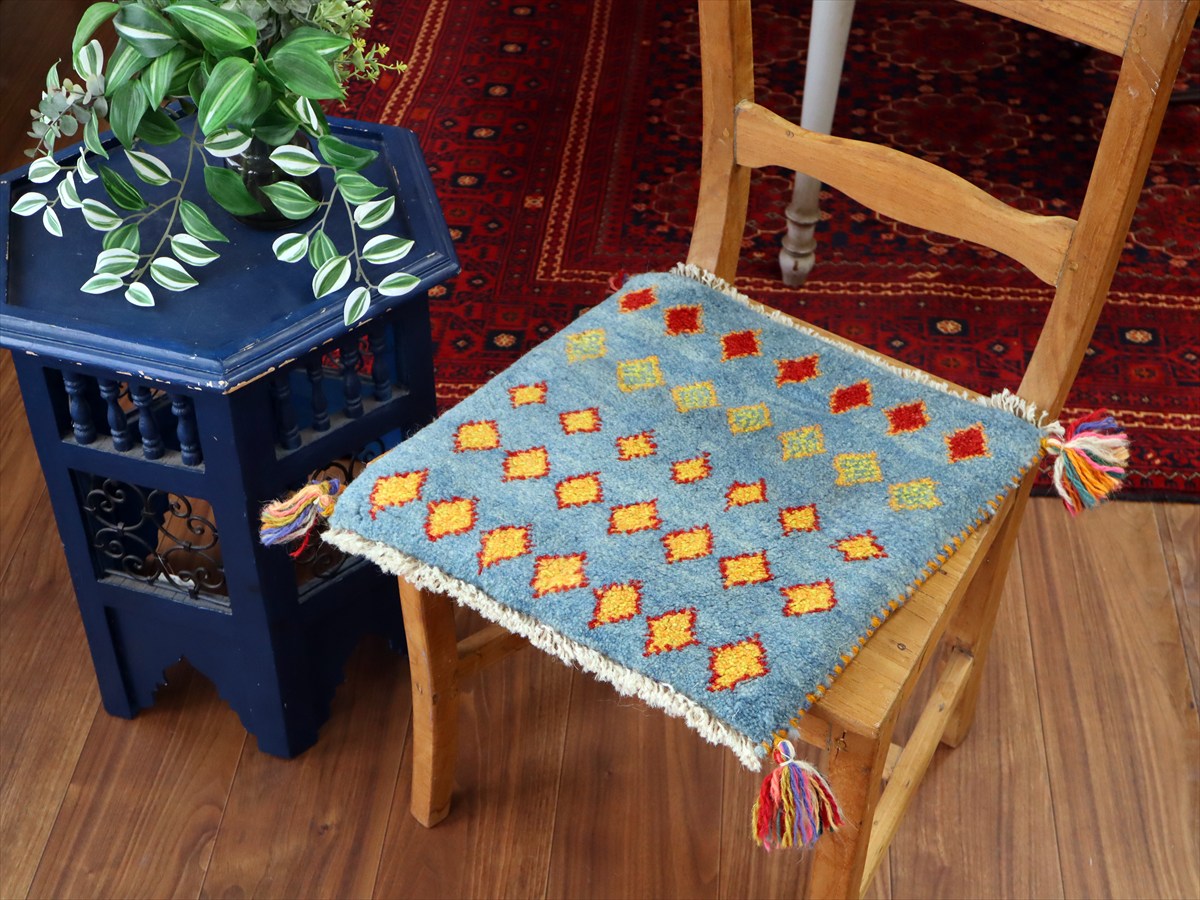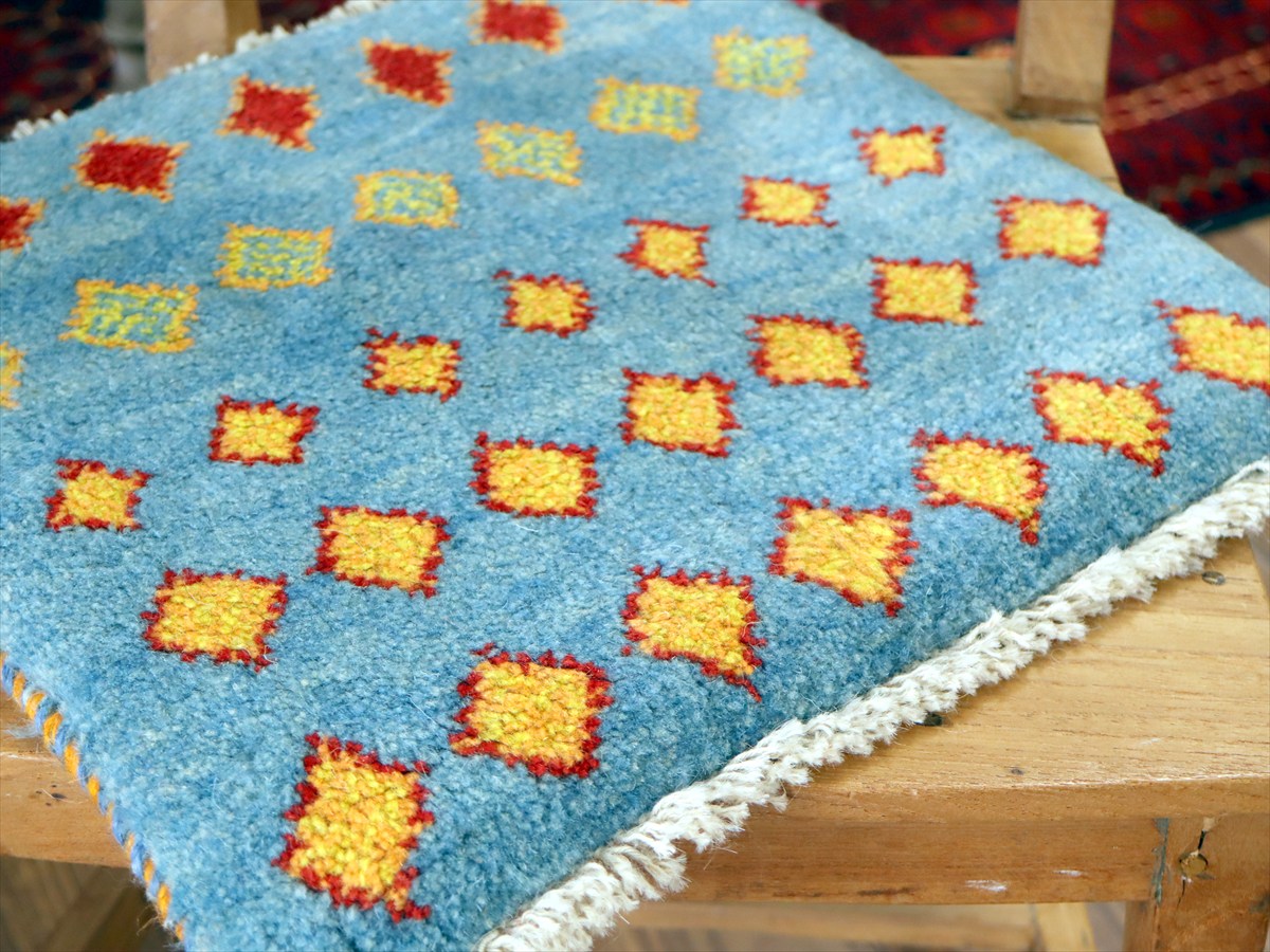 ギャッベ イラン産手織り 座布団サイズ39×39cm ブルー カラフルなひし形モチーフ