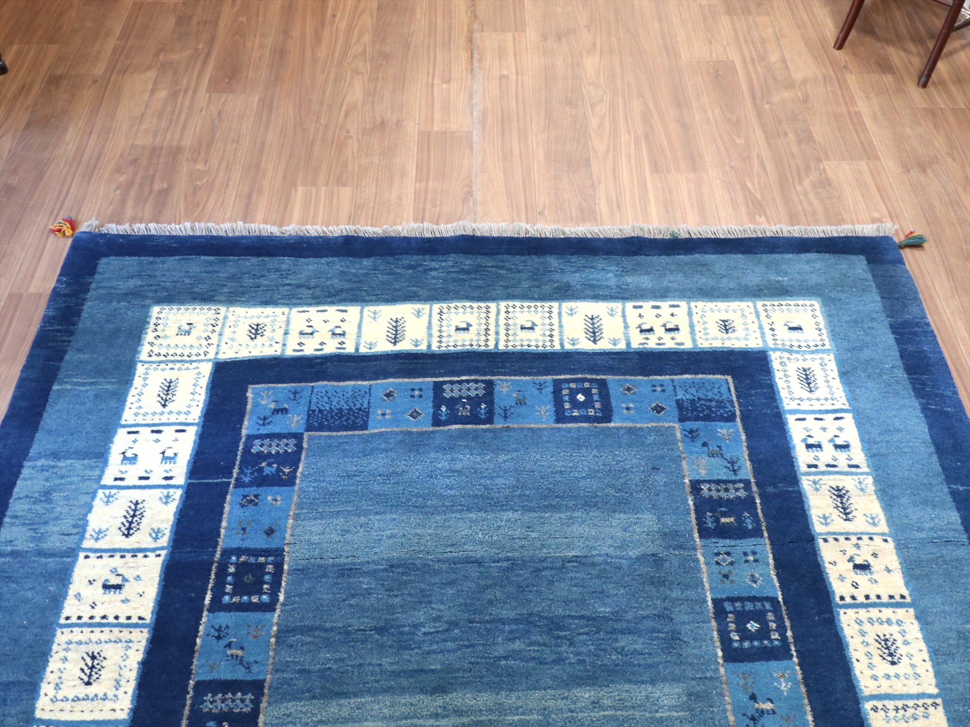 | 爽やかなブルー、ネイビーに、羊毛のアイボリーのボーダー(額縁)の入ったデザイン。タイルのようなデザインの中には、小さな動物や生命の木が織り込まれ、ひとつひとつにストーリーがあるような、楽しいデザインです。ベースのブルーは、染めのトーンが違う色が使われてグラデーションができています。 横幅が広く正方形に近い形で、リビングに合わせやすいサイズです。 |