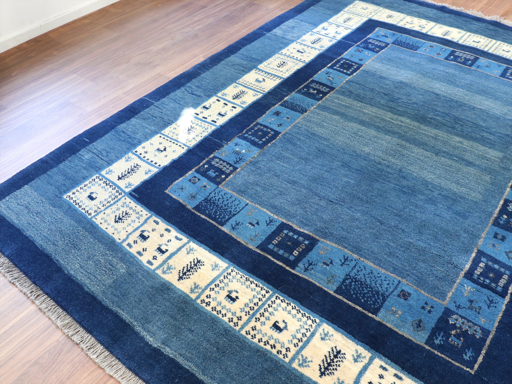 ギャベ カシュカイ族の手織りラグ 246x198cm 明るいブルー 二重のボーダー イラン 手織り
