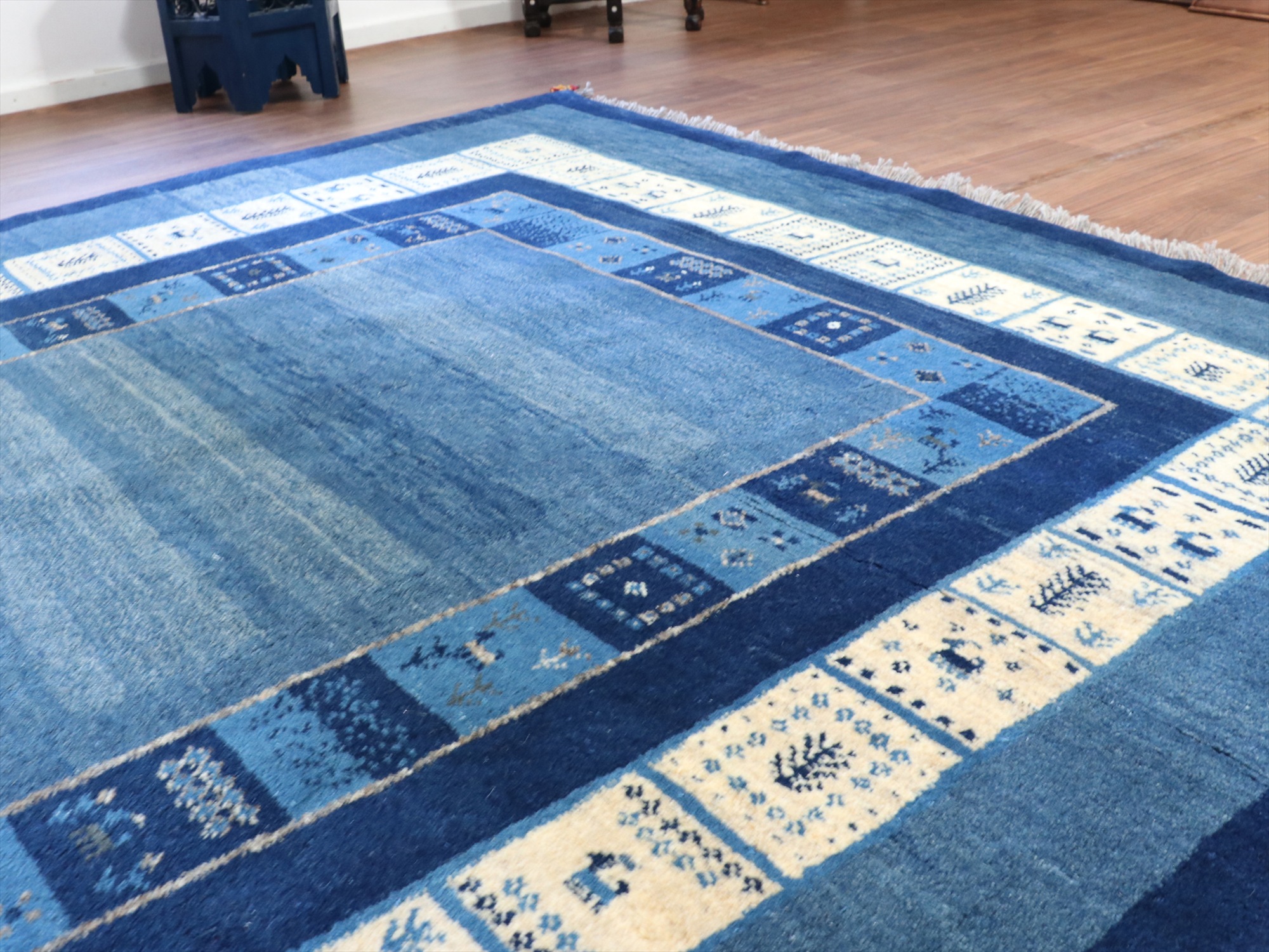 - ギャベ カシュカイ族の手織りラグ 246x198cm 明るいブルー 二重のボーダー イラン 手織り