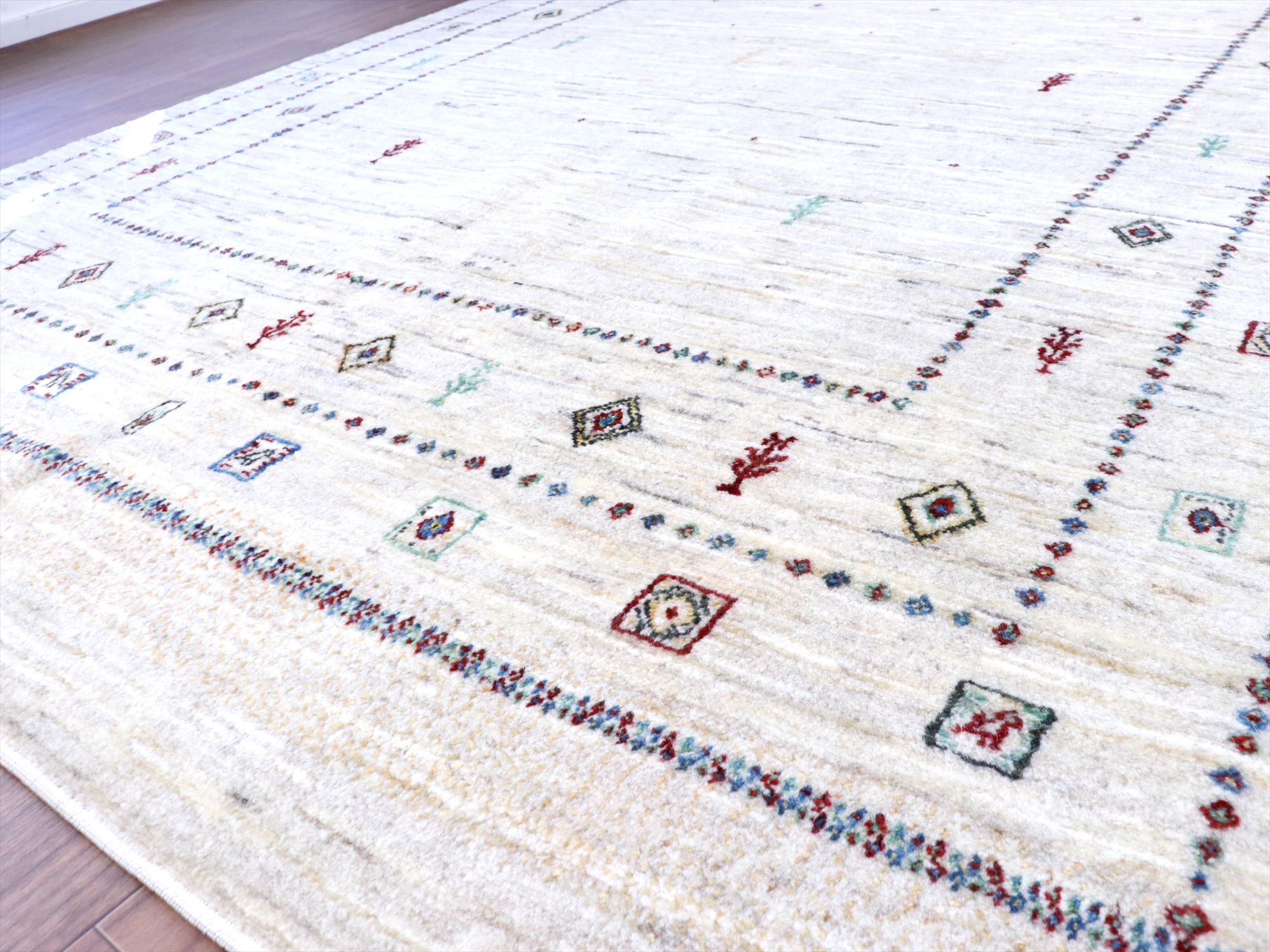 | 染めていない羊の毛のアイボリーの地に、カラフルな小さなモチーフを細かく織った細かい織りならではのデザイン。小さな花やスクエア、植物モチーフなど時間と手間をかけて丁寧に仕上がっています。 |
