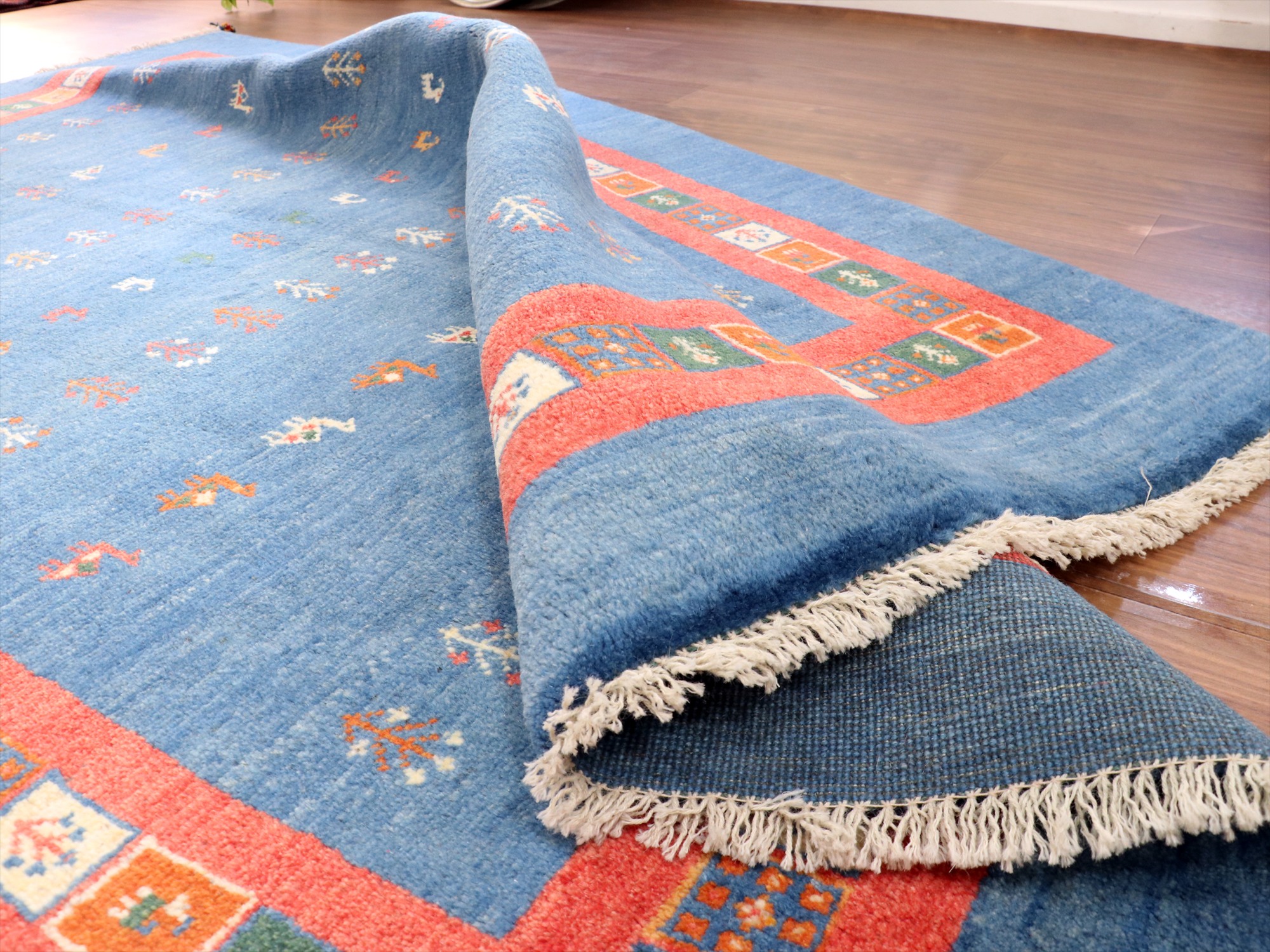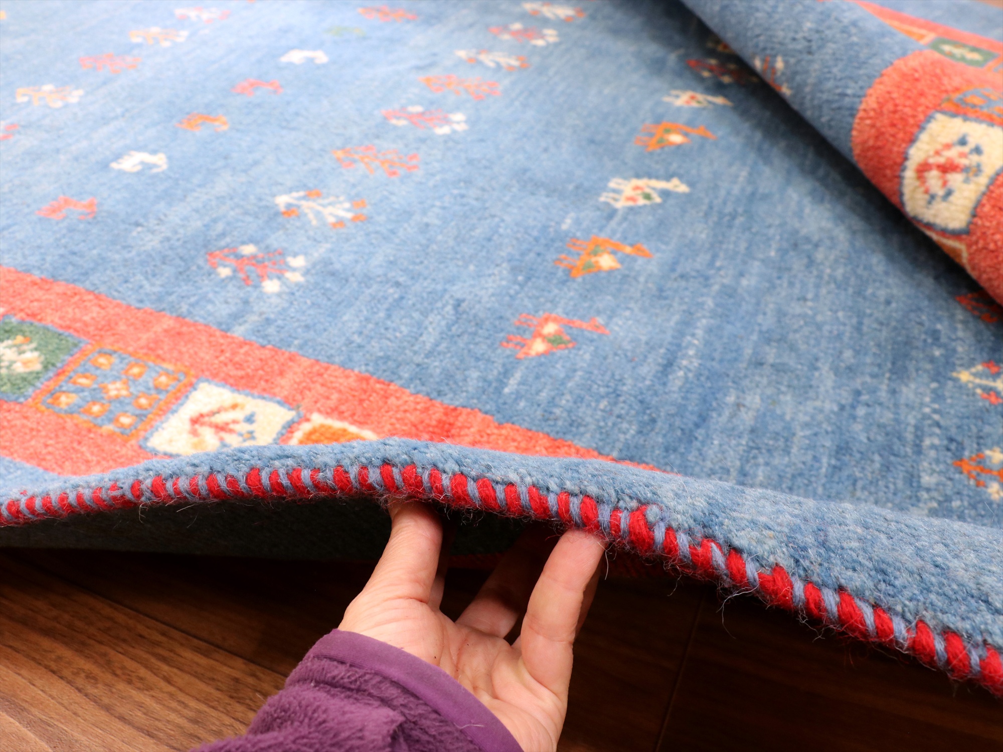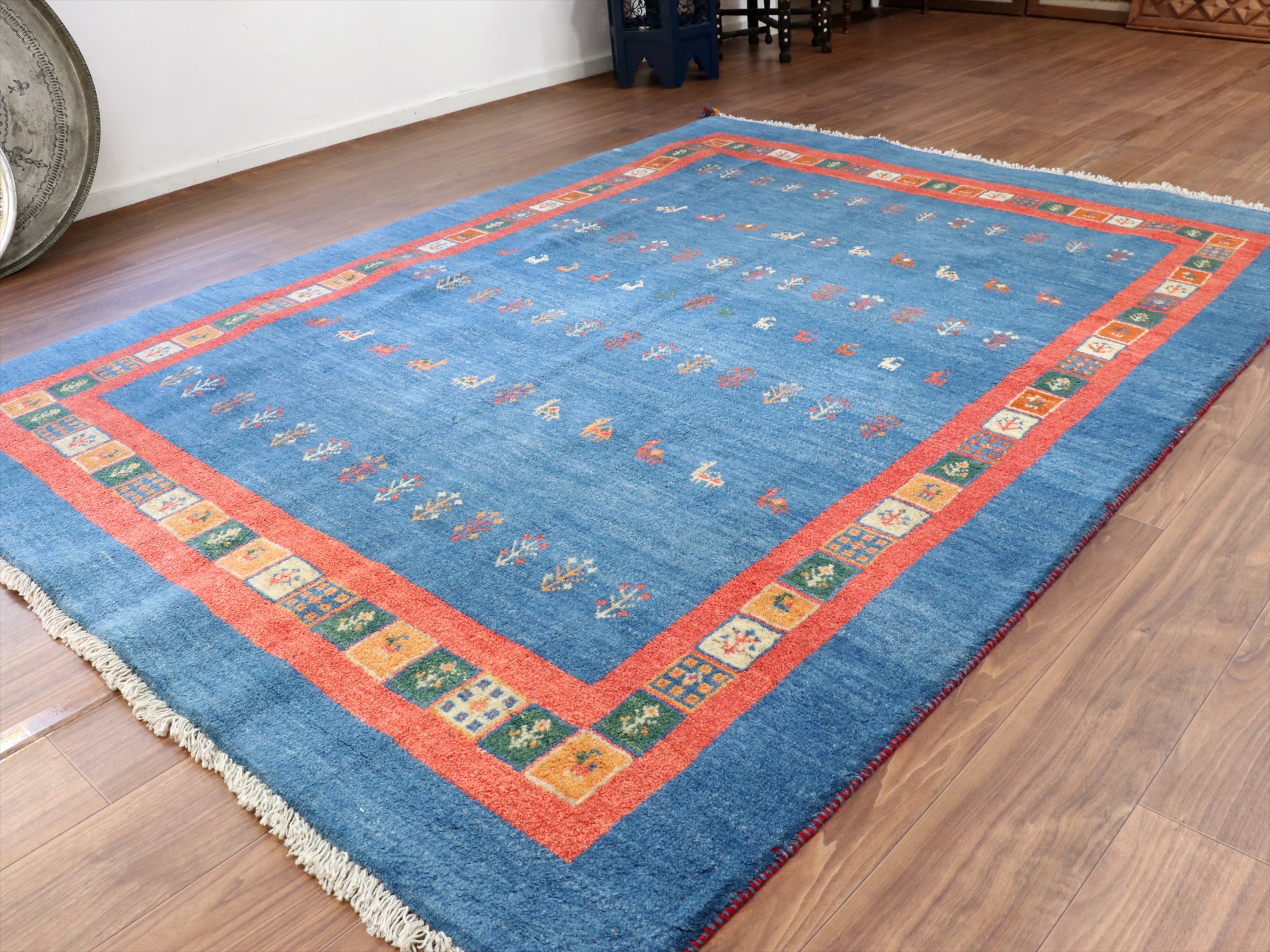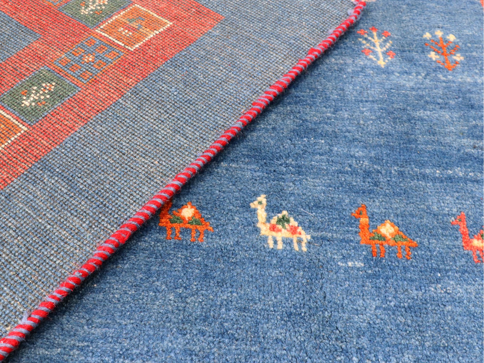 | 明るいブルーとレッドのコンビネーションでやさしい印象のギャッベ。同じく明るめのフローリングに合わせると、カジュアルな雰囲気で楽しめそうです。デザインは、動物やラクダなどのモチーフが全面に織り込まれた定番の人気デザイン。昔ながらの素朴な織りです。 |