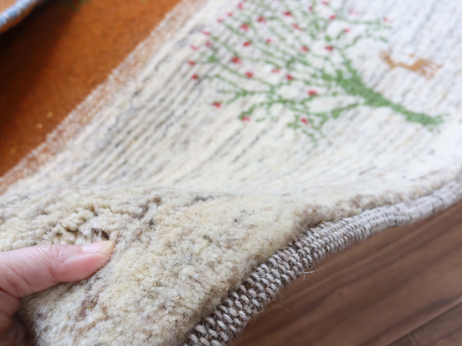 | 毛足が長く、パイルを含めたギャッベ全体の厚みは2.2-2.3cm程度。ボリューム感たっぷりのふかふかギャッベです。 【ギャッベ・ノマド - Gabbeh Nomad -】遊牧民を意味するノマドと名付けられたギャッベ・コレクション。元来、ギャッベとは、毛足の長いラグを意味し、このクラスの織りの織物のことをいいます。ふかふかした厚みがあります。じゅうたんの結び目は10cmの間に20~25目ほどで、ギャッベの中で最もベーシックな織りのグレードです。デザインは、遊牧民本来の自由な感性や、長く織り継がれてきた伝統を生かしたものが多く、シンプルな単色のものからカラフルなタイル柄など、様々なデザインが織られています。ヤギやヒツジなどの動物、生命の樹などの定番モチーフが織り込まれていることが多く、一般的にイメージされる「ギャッベらしさ」が一番感じられるスタンダードなクラスです。 |