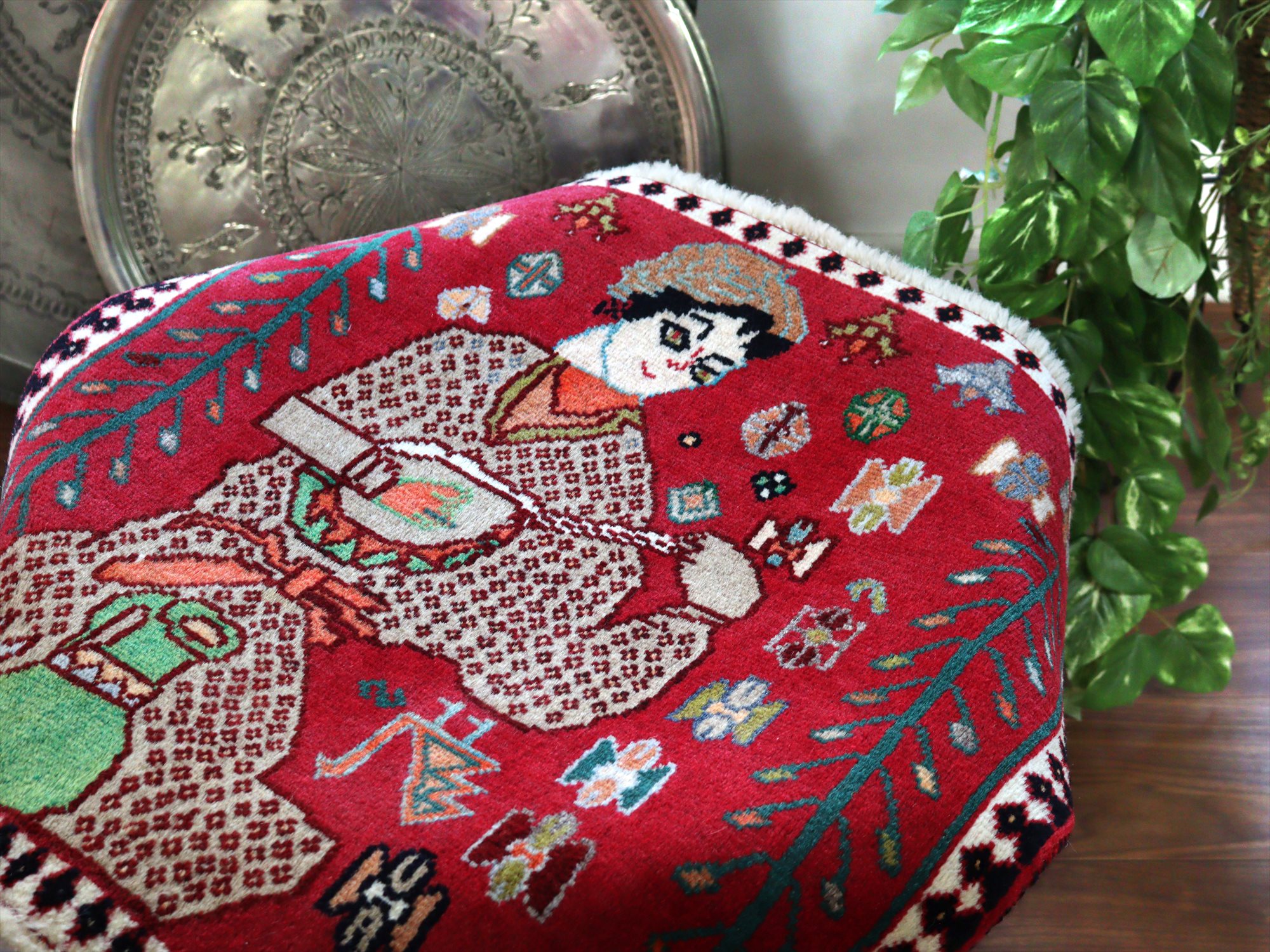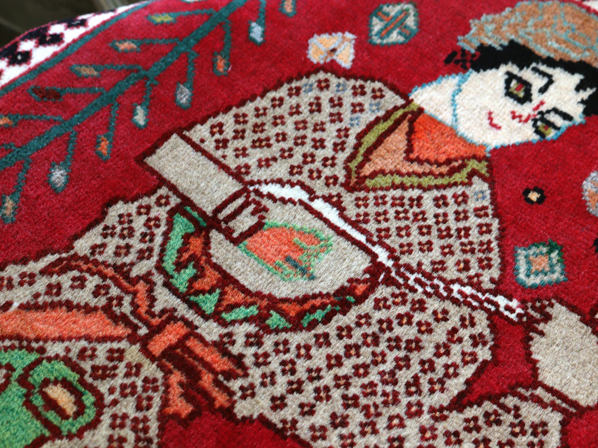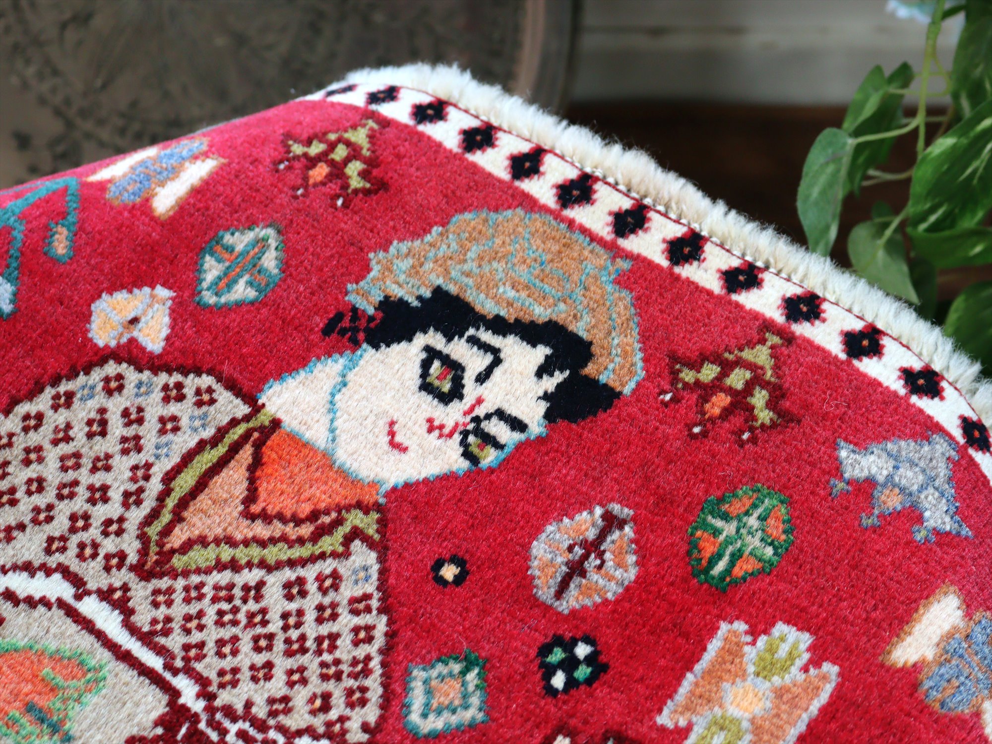 | 楽器(恐らくイランに古くから伝わるセタール)を弾く女性の姿がデザインされた正方形サイズの絨毯です。目の前には壺があります。チップを受け取るためのものでしょうか。そのほかにも、鳥が逆さまに織られたりと想像力を掻き立てるユニークな1枚です。 |