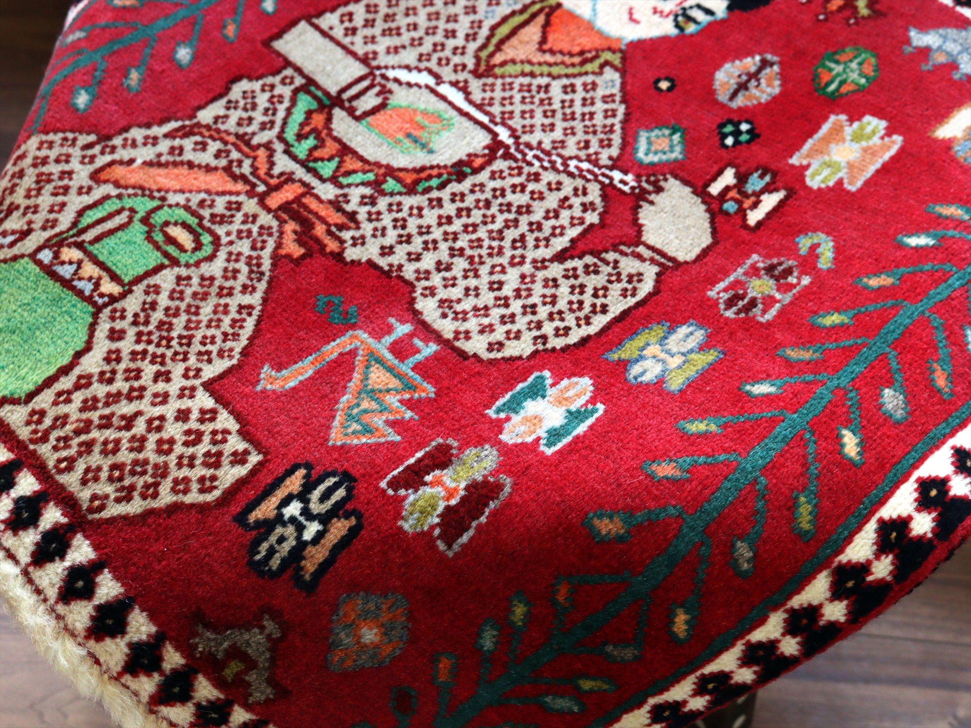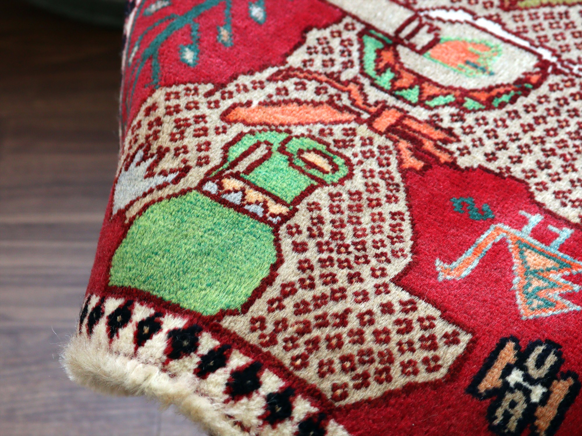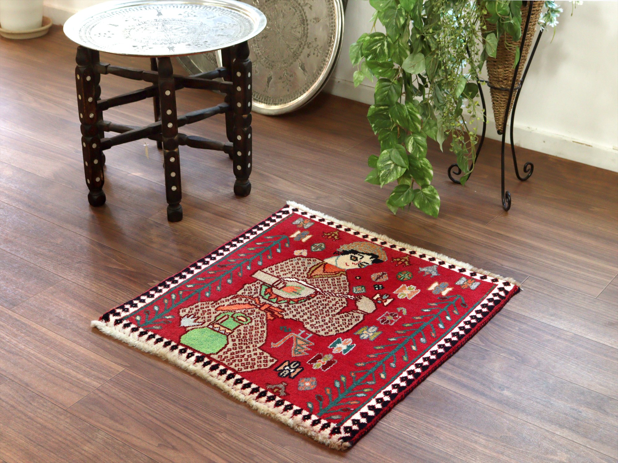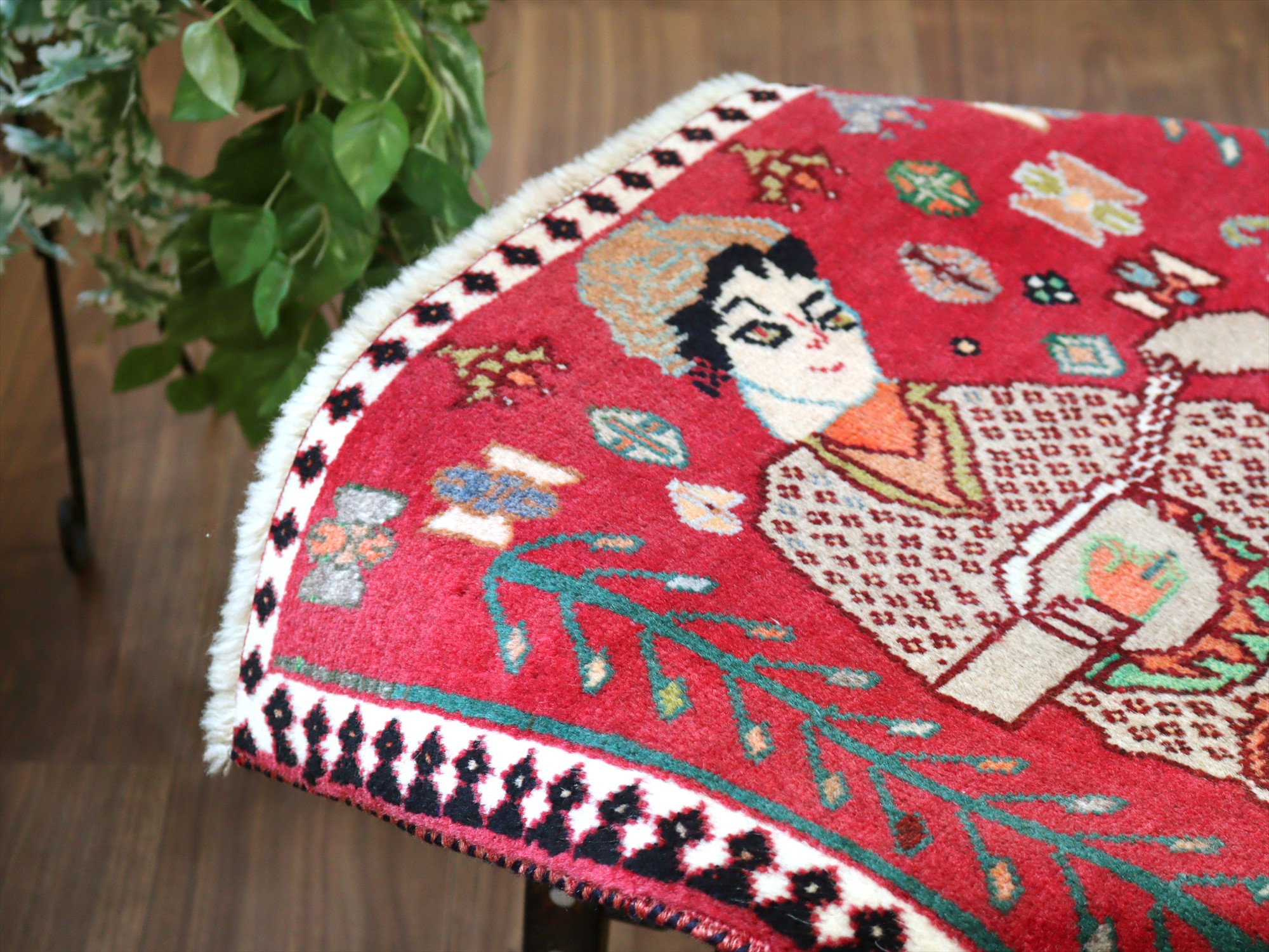 | 楽器(恐らくイランに古くから伝わるセタール)を弾く女性の姿がデザインされた正方形サイズの絨毯です。目の前には壺があります。チップを受け取るためのものでしょうか。そのほかにも、鳥が逆さまに織られたりと想像力を掻き立てるユニークな1枚です。 |