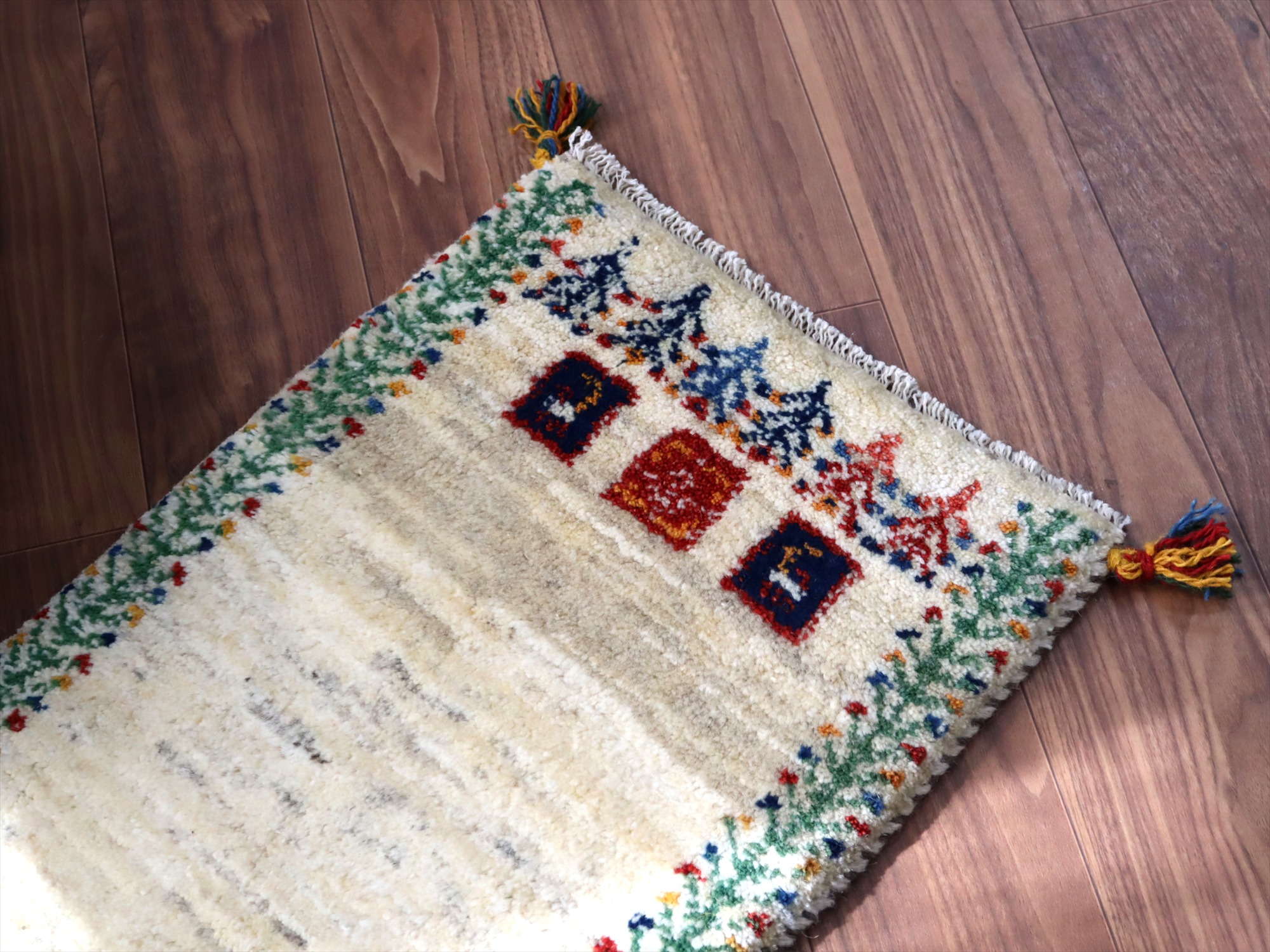 - ギャッベ イラン 手織り ミニランナー 115x43cm ナチュラル羊毛アイボリー タイル柄