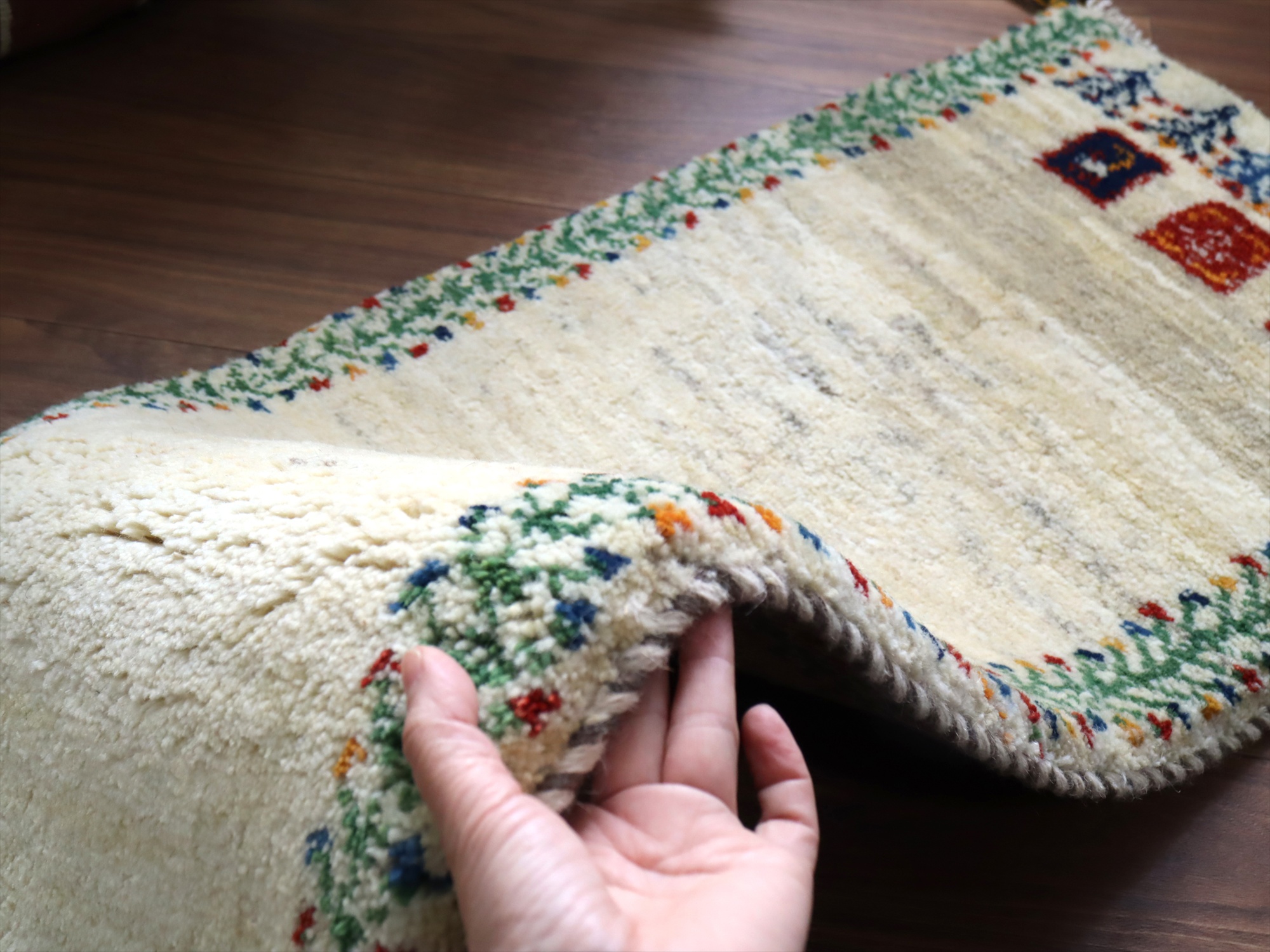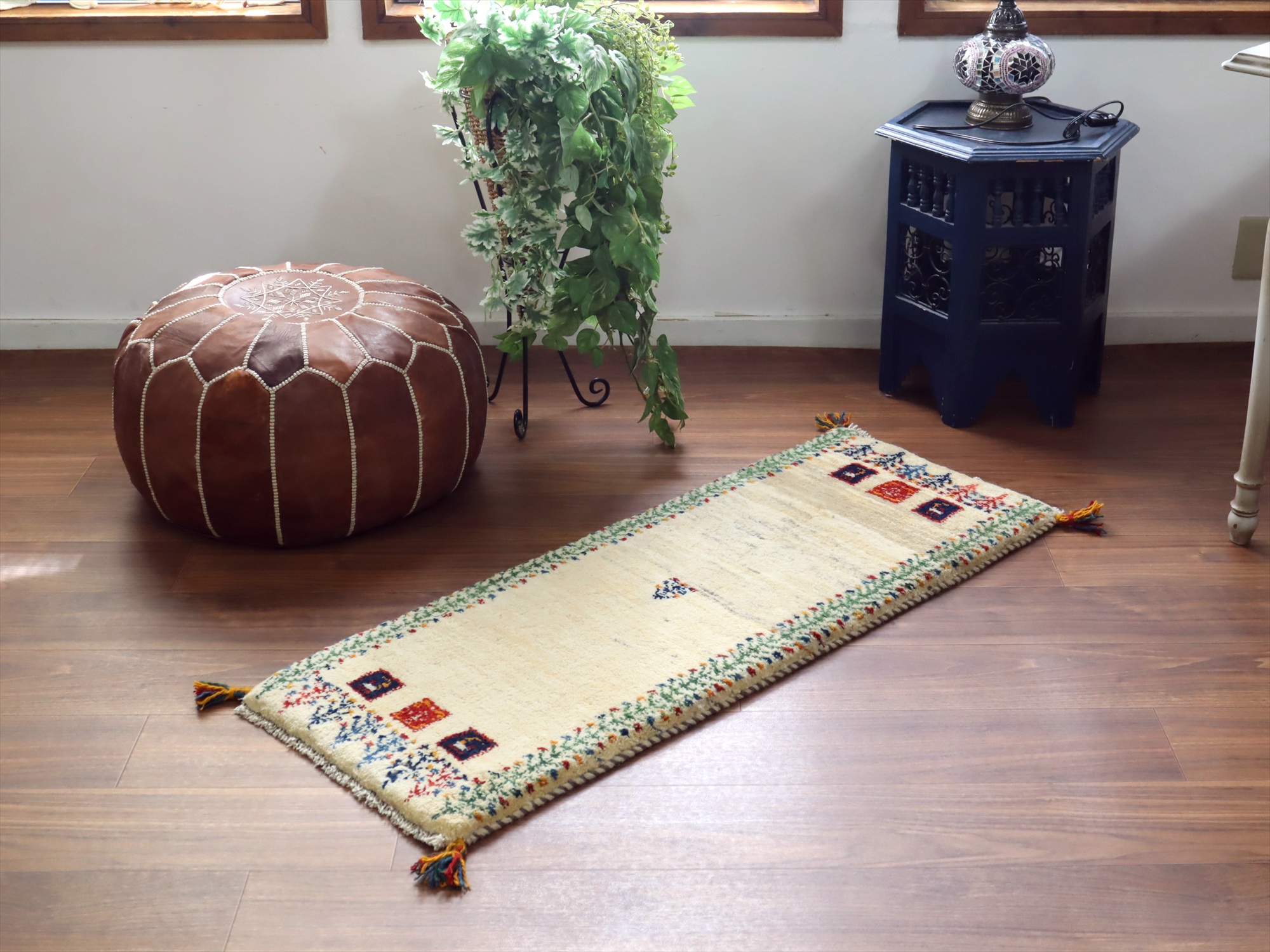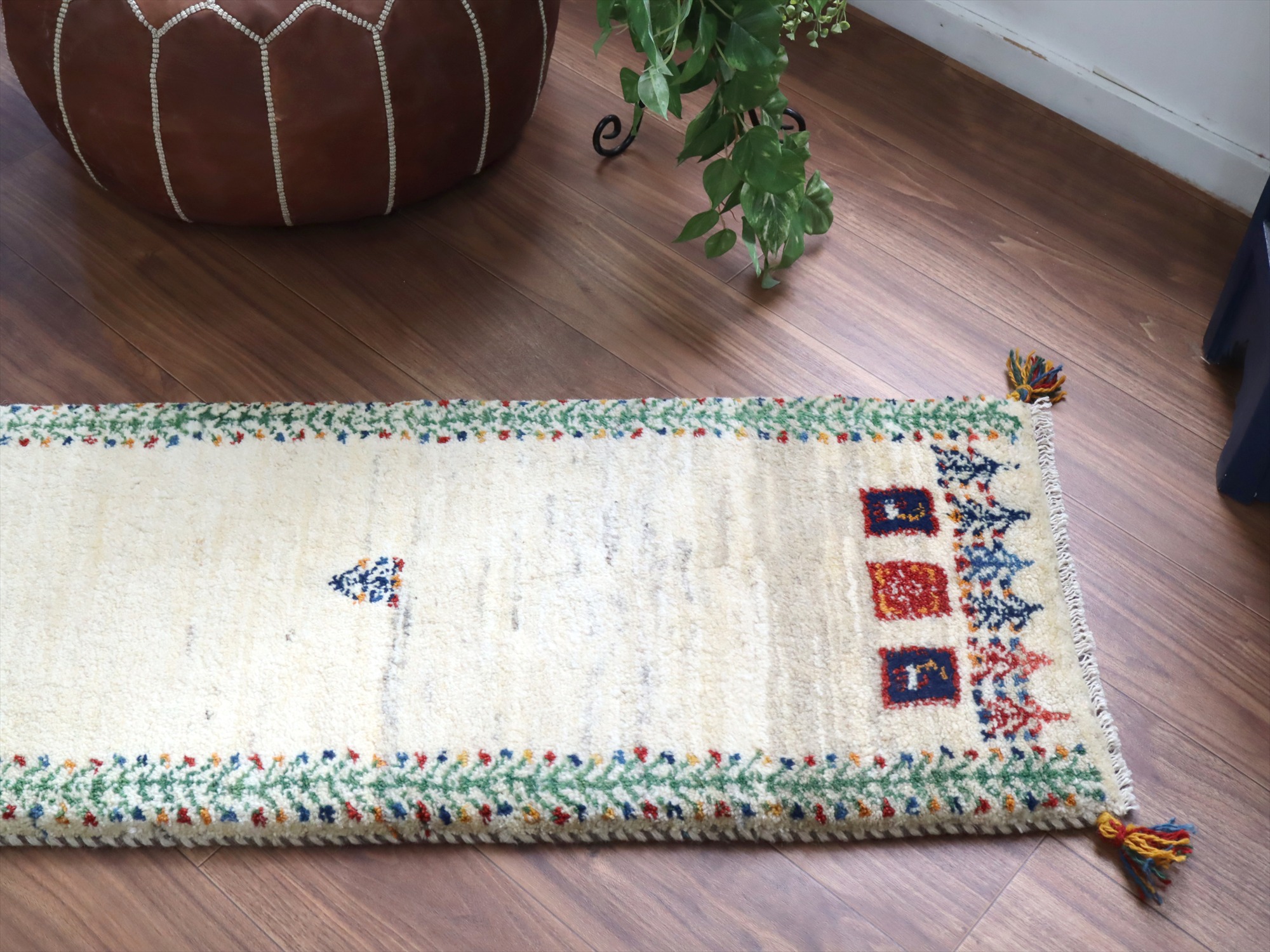 ギャッベ イラン 手織り ミニランナー 115x43cm ナチュラル羊毛アイボリー タイル柄