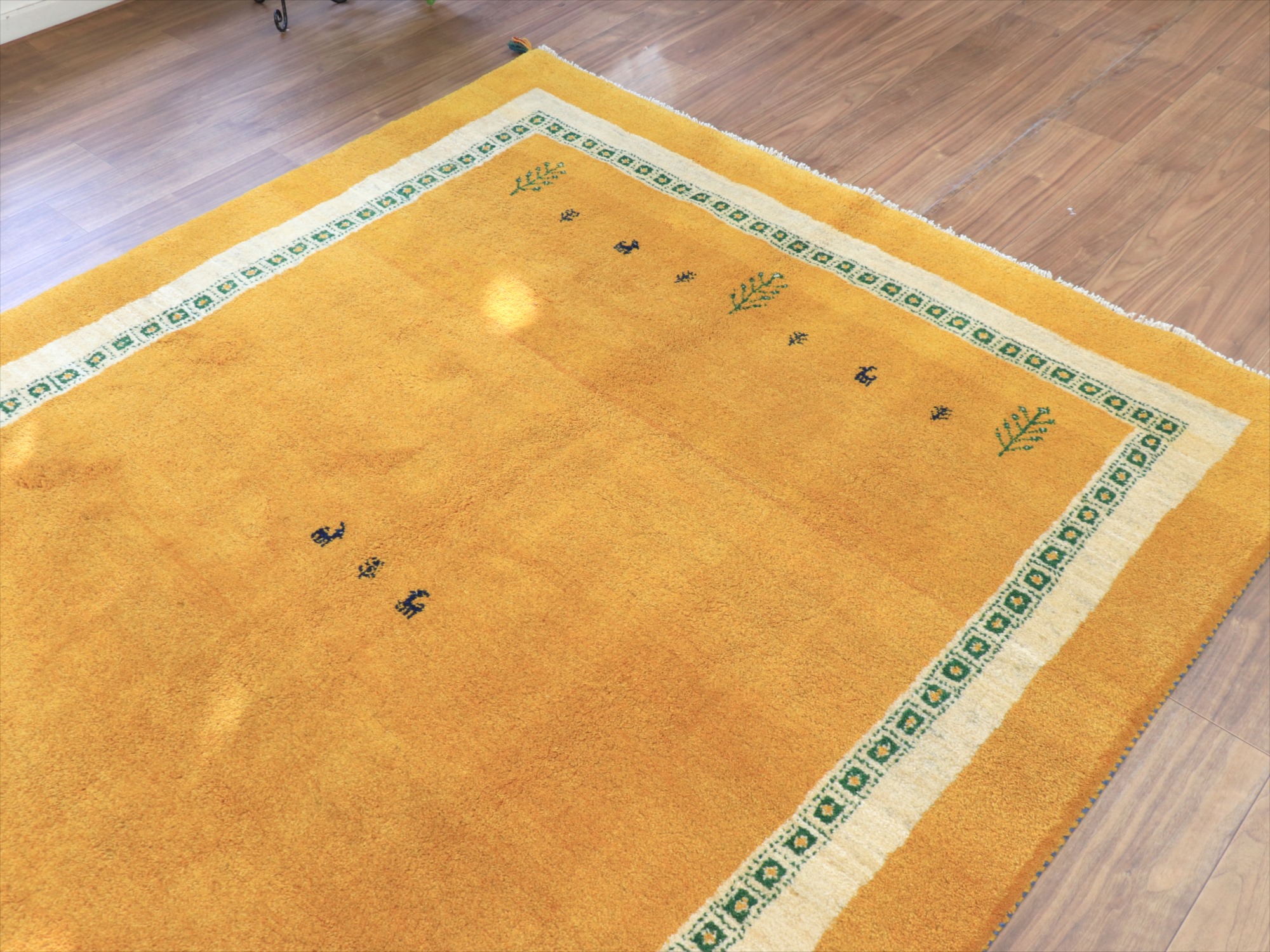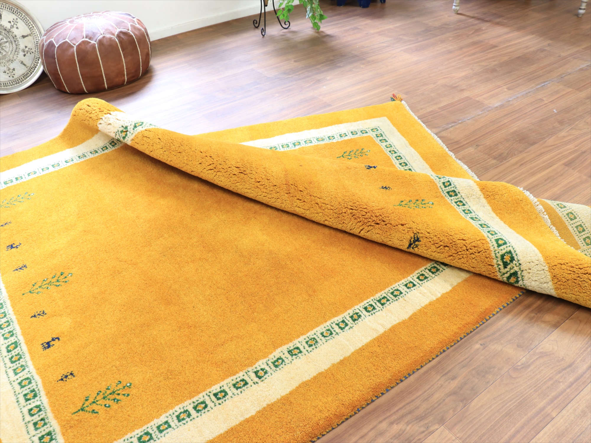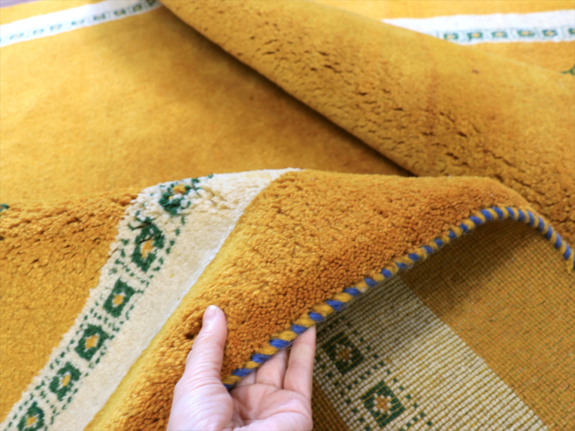 | パイル(毛足)と下地を合わせた厚みは2.5-2.7cmほどある、ボリュームたっぷりの分厚い織り。踏んでみると弾力があり、ギャベならではのふかふか感が楽しめます。 |