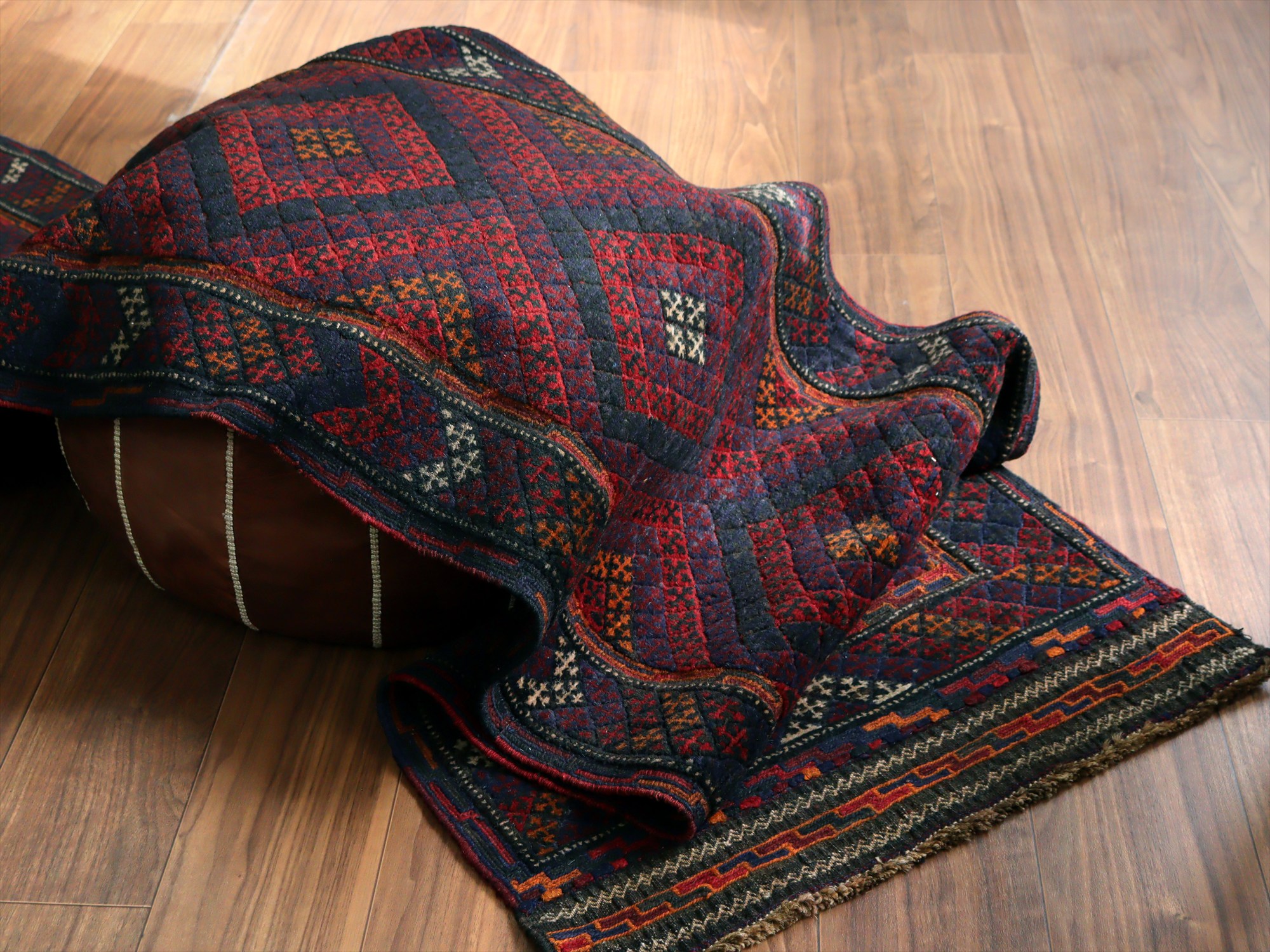 | ベース地はスマック織りでしっかりとした織り地です。モチーフ部分はパイル(毛足)のある織りで、表面には立体感があります。 |