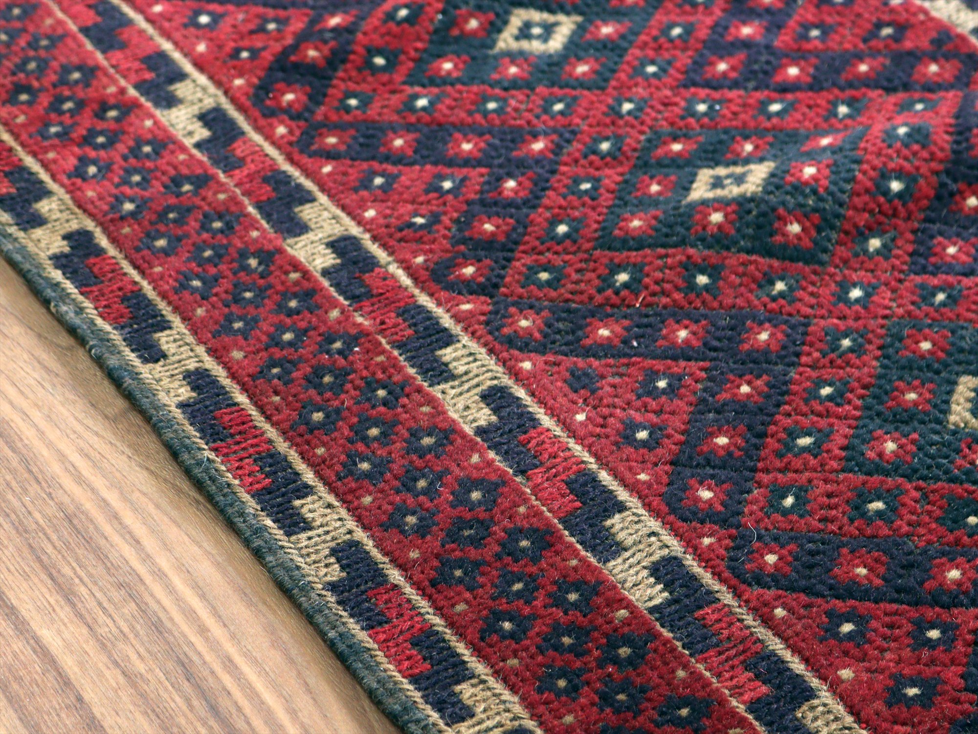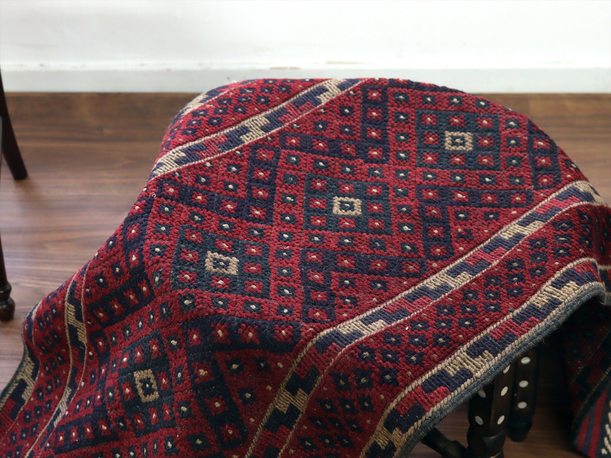 | アフガニスタン東部、イランと国境を接するエリアの緻密な織りのキリムです。細かい織り目のスマック織りをベースに、立体感のあるカーペット織りでモチーフをレリーフのように織り込んだ1枚。 |