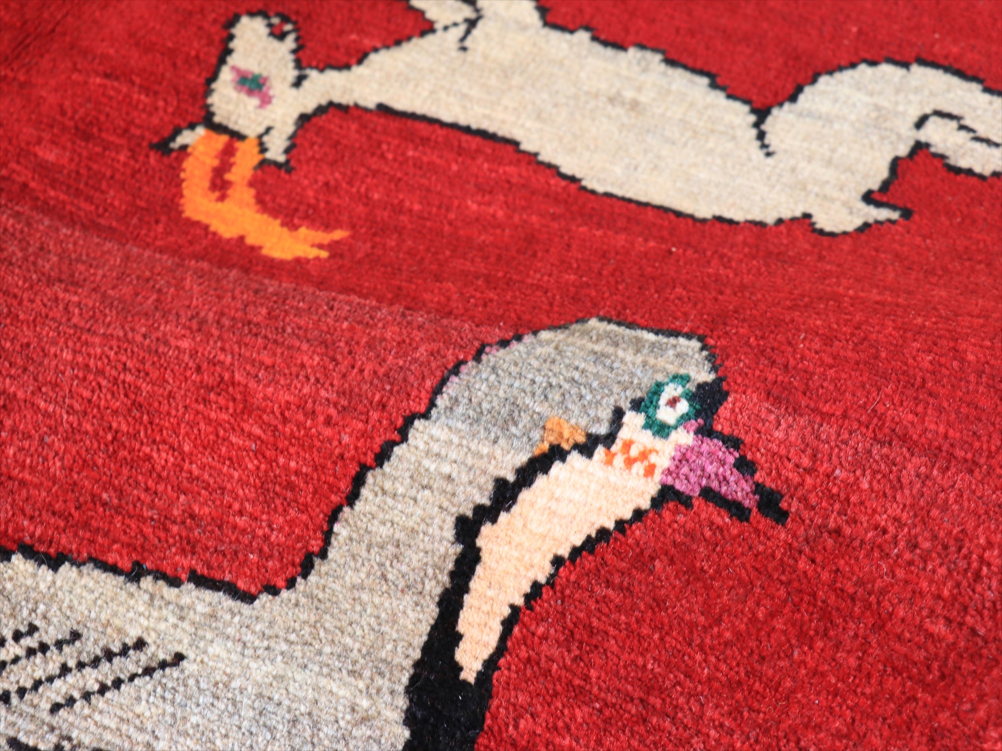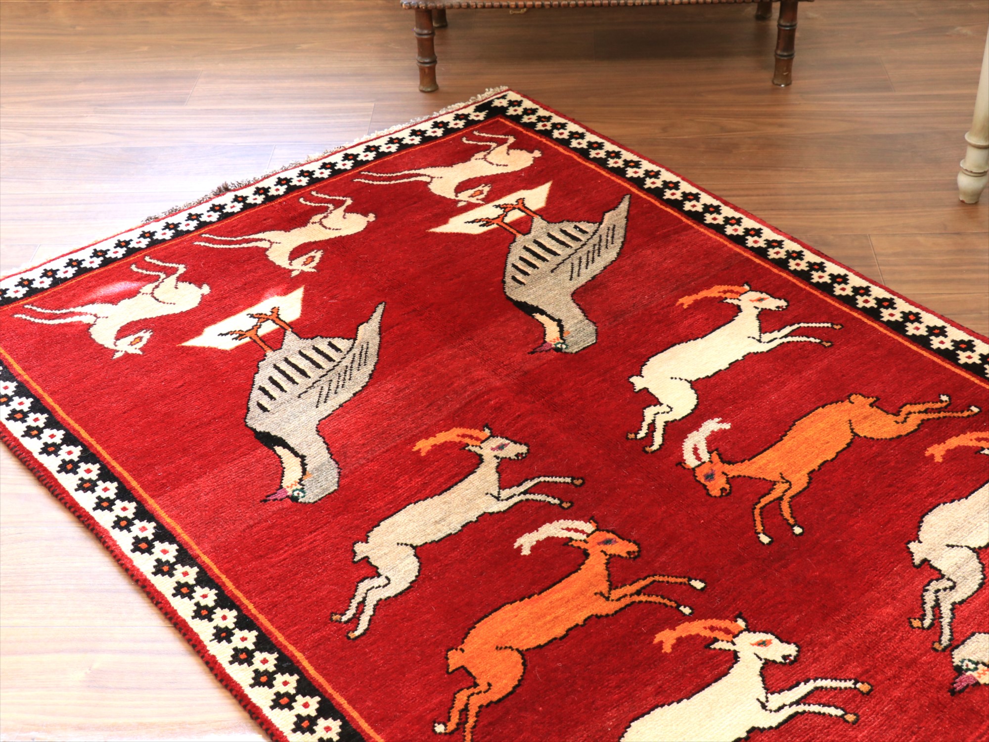| 縦方向に配置されたレイアウトがユニーク。レッドをベースに、デザインの異なる鹿と鳥がたくさんならんでいます。鹿は家畜ではありませんが、森の中から親子仲良く現れる鹿は、家庭円満の象徴とも言われ、カシュカイ族のラグにはたびたび登場するモチーフです。 |