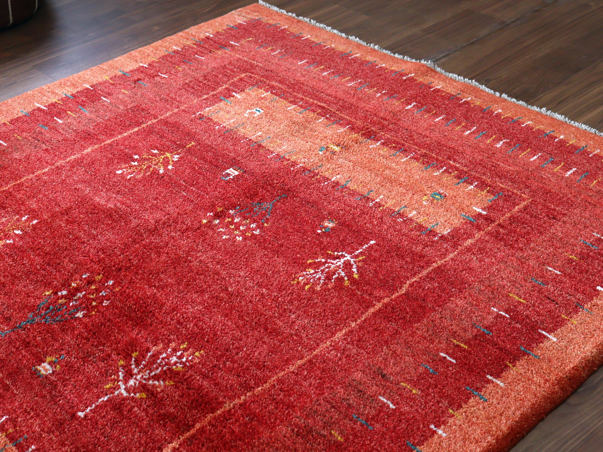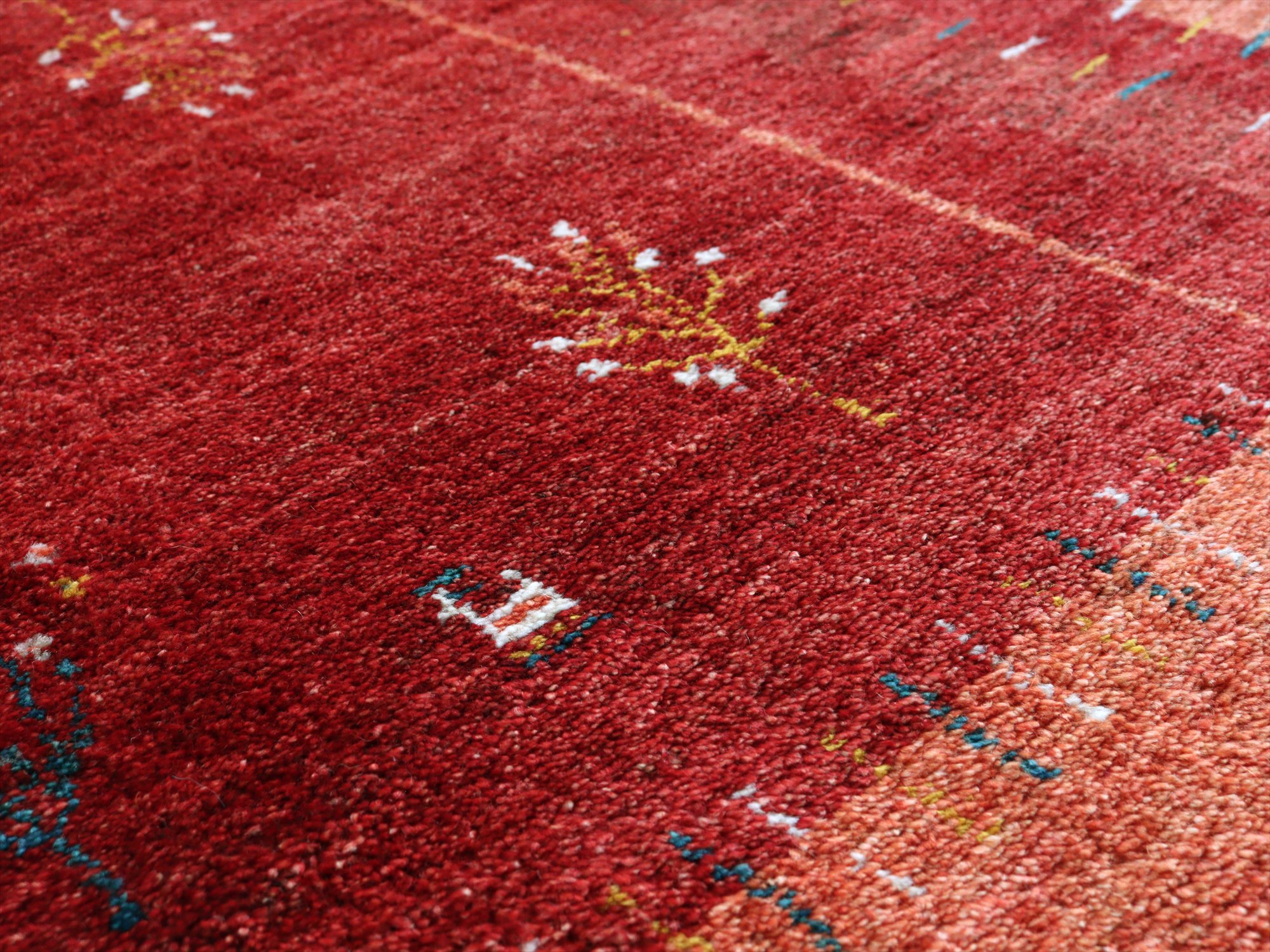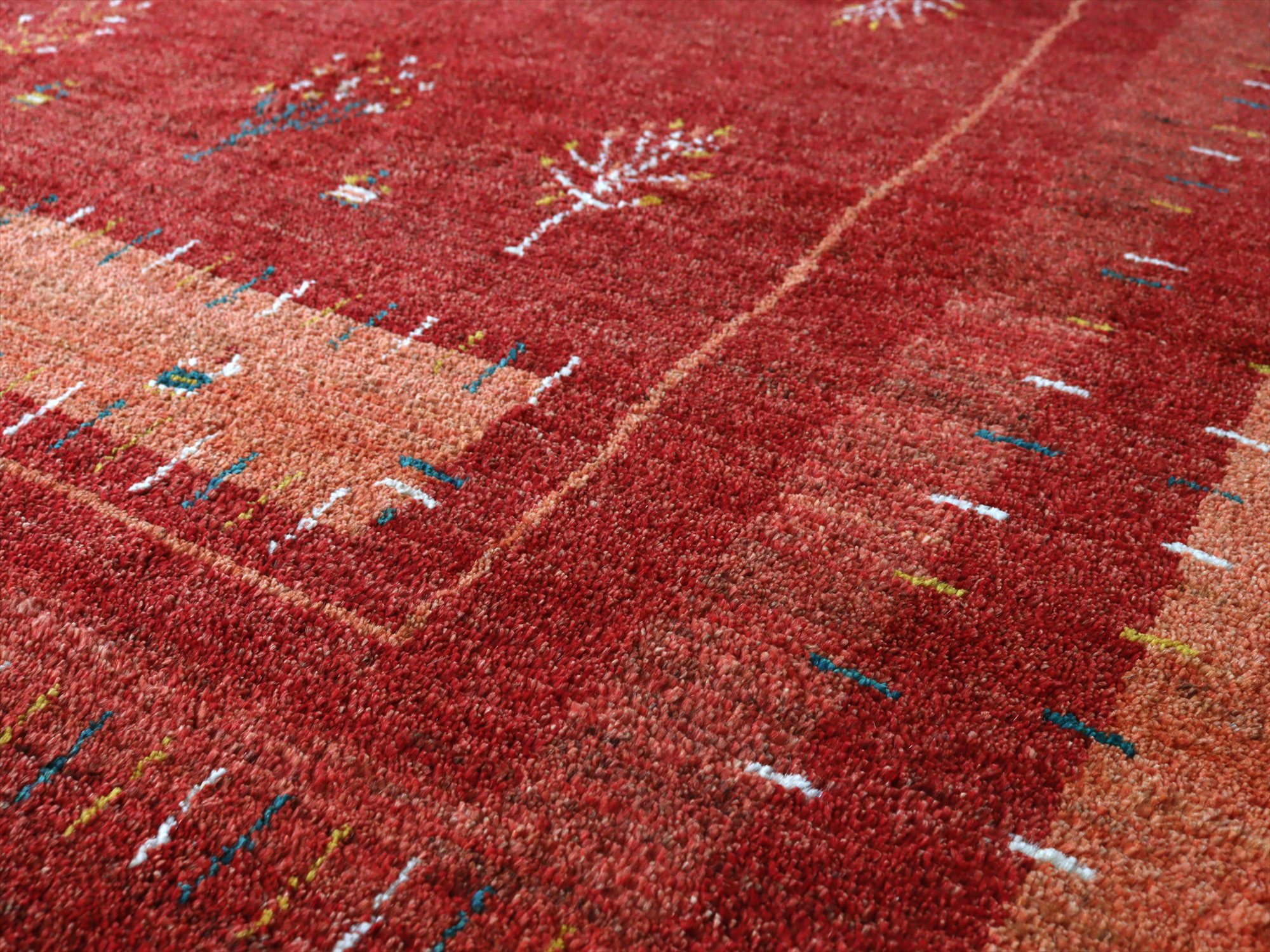 | 濃淡のあるレッドの色合いを活かして織られたギャッベ。樹々や羊たちが織られ、遊牧民の生活の風景を思い起こさせるような素朴な雰囲気の1枚です。 |
