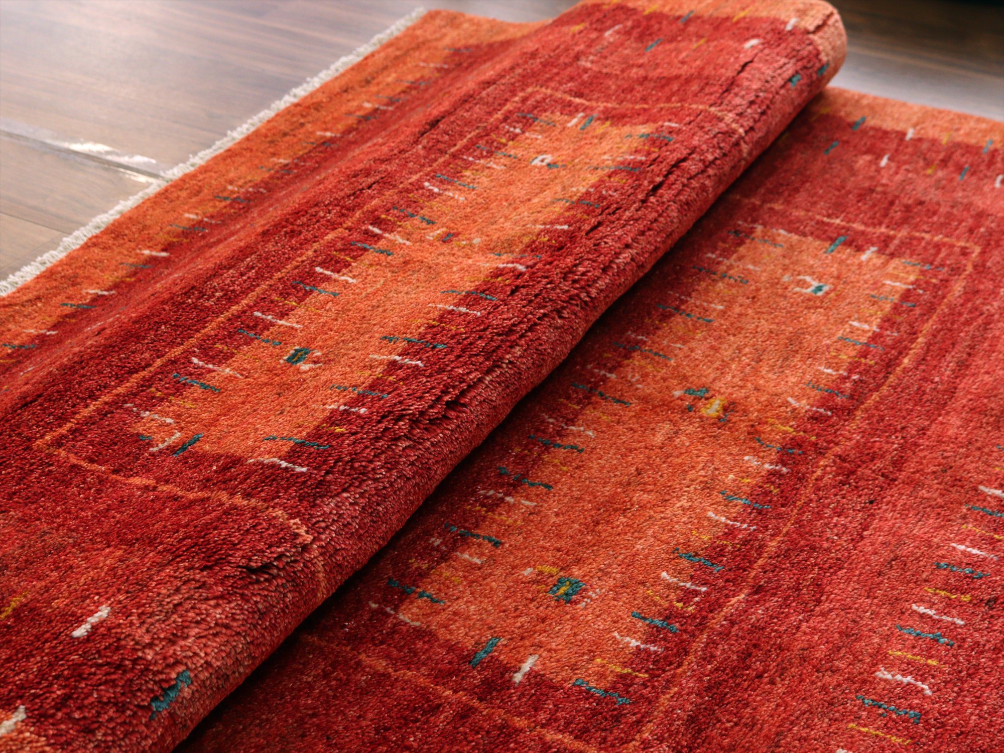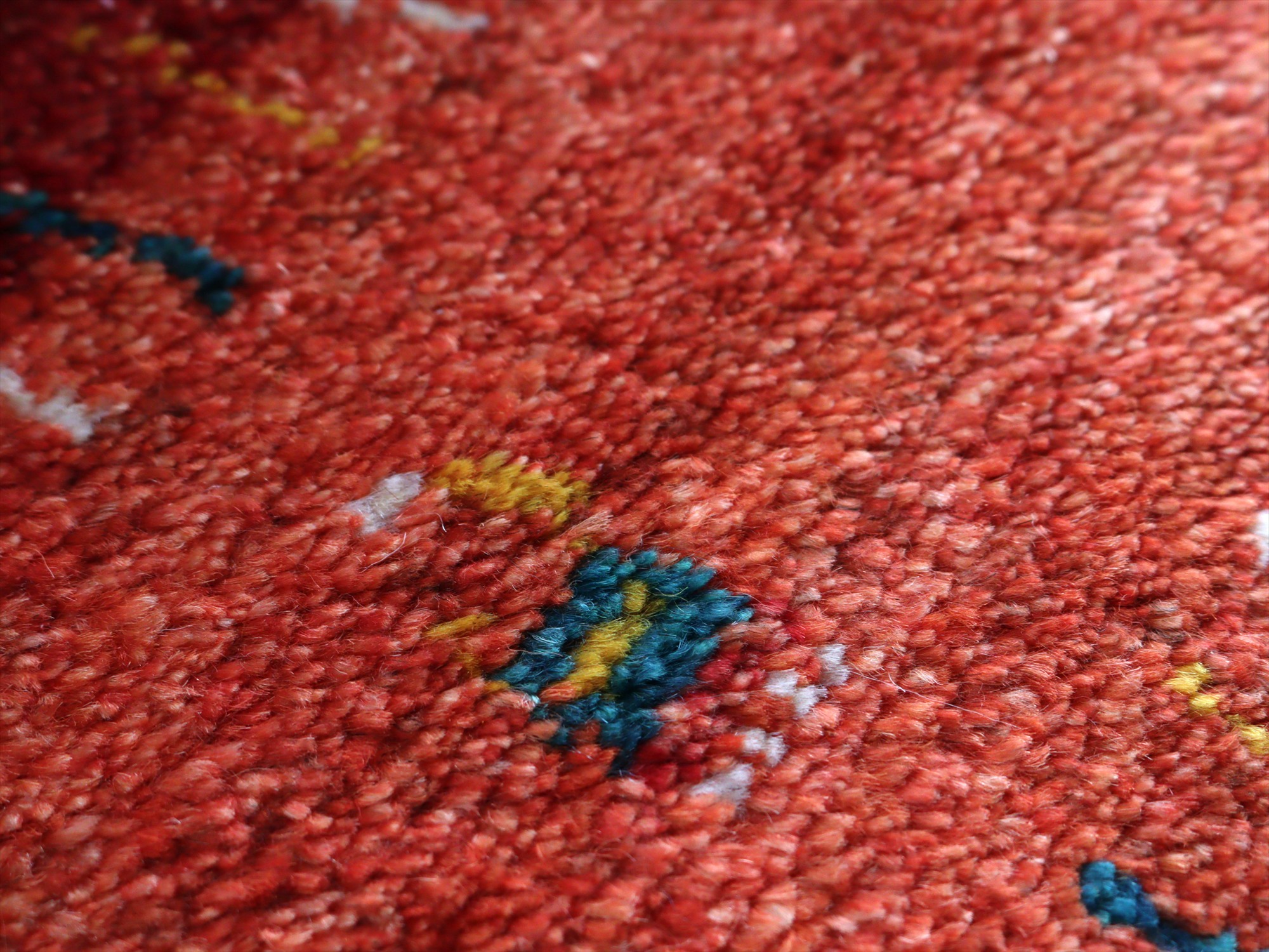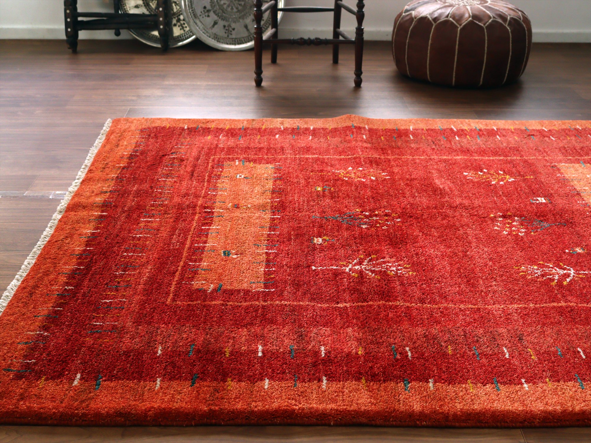 | 濃淡のあるレッドの色合いを活かして織られたギャッベ。樹々や羊たちが織られ、遊牧民の生活の風景を思い起こさせるような素朴な雰囲気の1枚です。 |