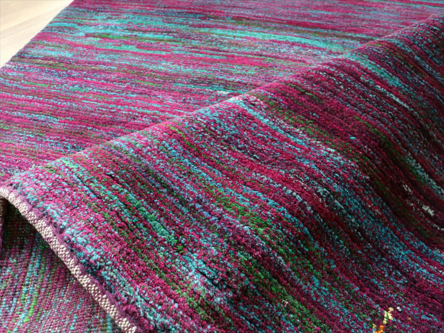 | 発色のよい紫と青をランダムにストライプ状に重ねた抽象画のようなデザイン。細かく見ると、グリーンやアイボリーなども散りばめられて、複雑で深みのある色使いです。かなり個性的で存在感があります。まさに世界で一枚のラグですね。 |