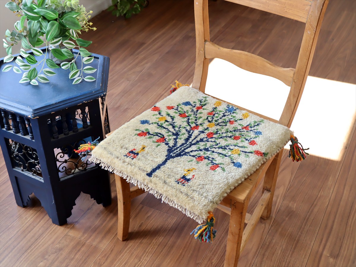 - ギャッベ イラン産手織り 座布団サイズ43×40cm ナチュラルアイボリー カラフルなザクロの樹と動物