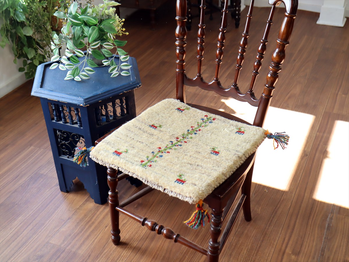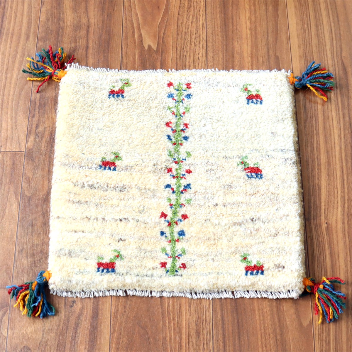 ギャッベ イラン産手織り 座布団サイズ39×40cm ナチュラルアイボリー 連なる生命の樹と動物