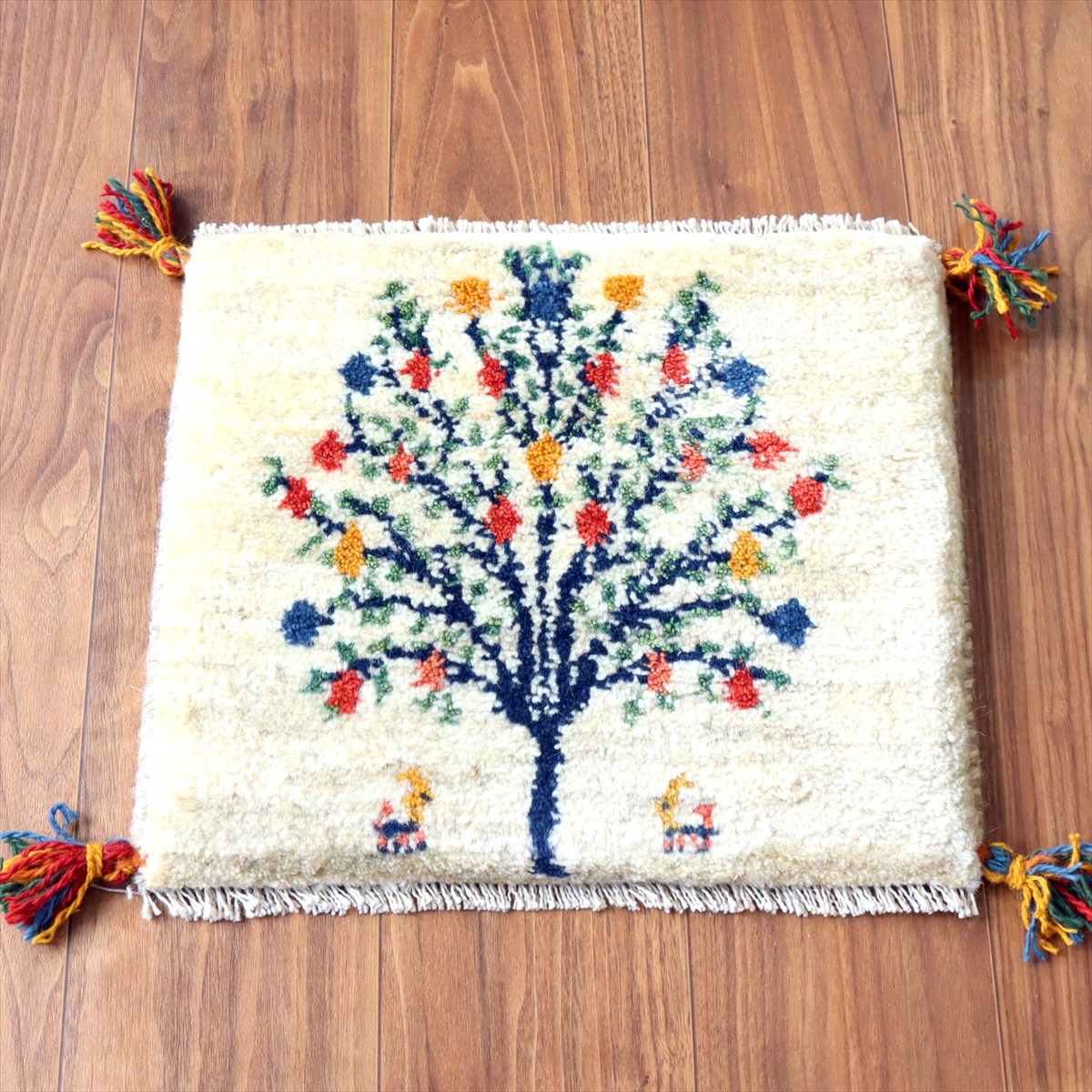 ギャッベ イラン産手織り 座布団サイズ38×43cm ナチュラルアイボリー カラフルなザクロの樹と動物