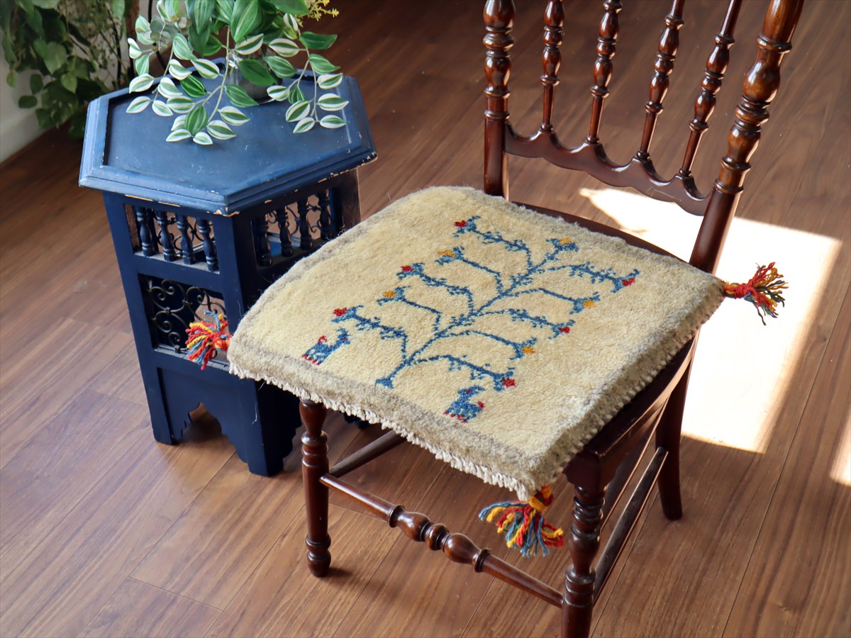 - ギャッベ イラン産手織り 座布団サイズ41×44cm ナチュラルアイボリー 生命の樹と動物