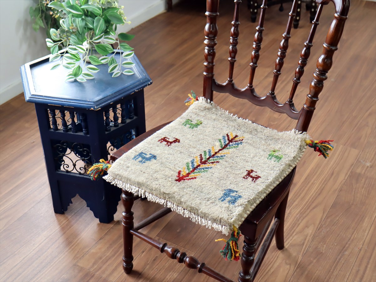 ギャッベ イラン産手織り 座布団サイズ41×38cm ナチュラルアイボリー 生命の樹と動物
