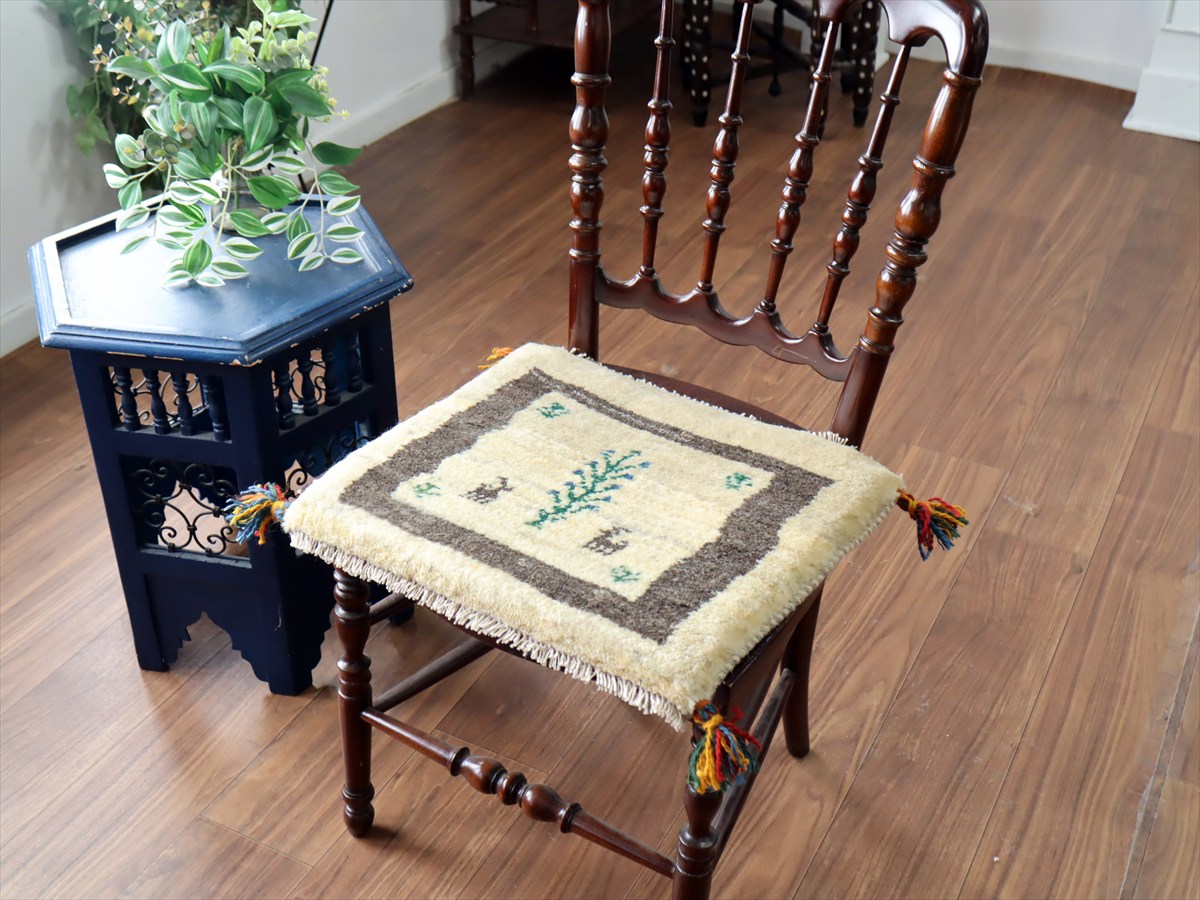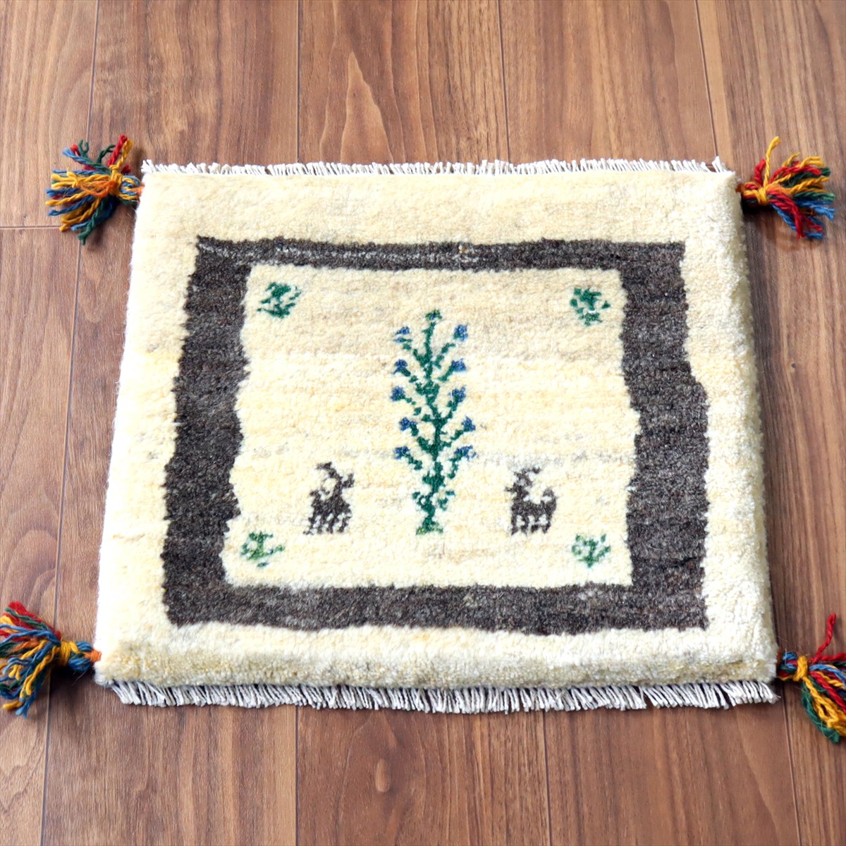 ギャッベ イラン産手織り 座布団サイズ38×43cm ナチュラルアイボリー 生命の樹と動物