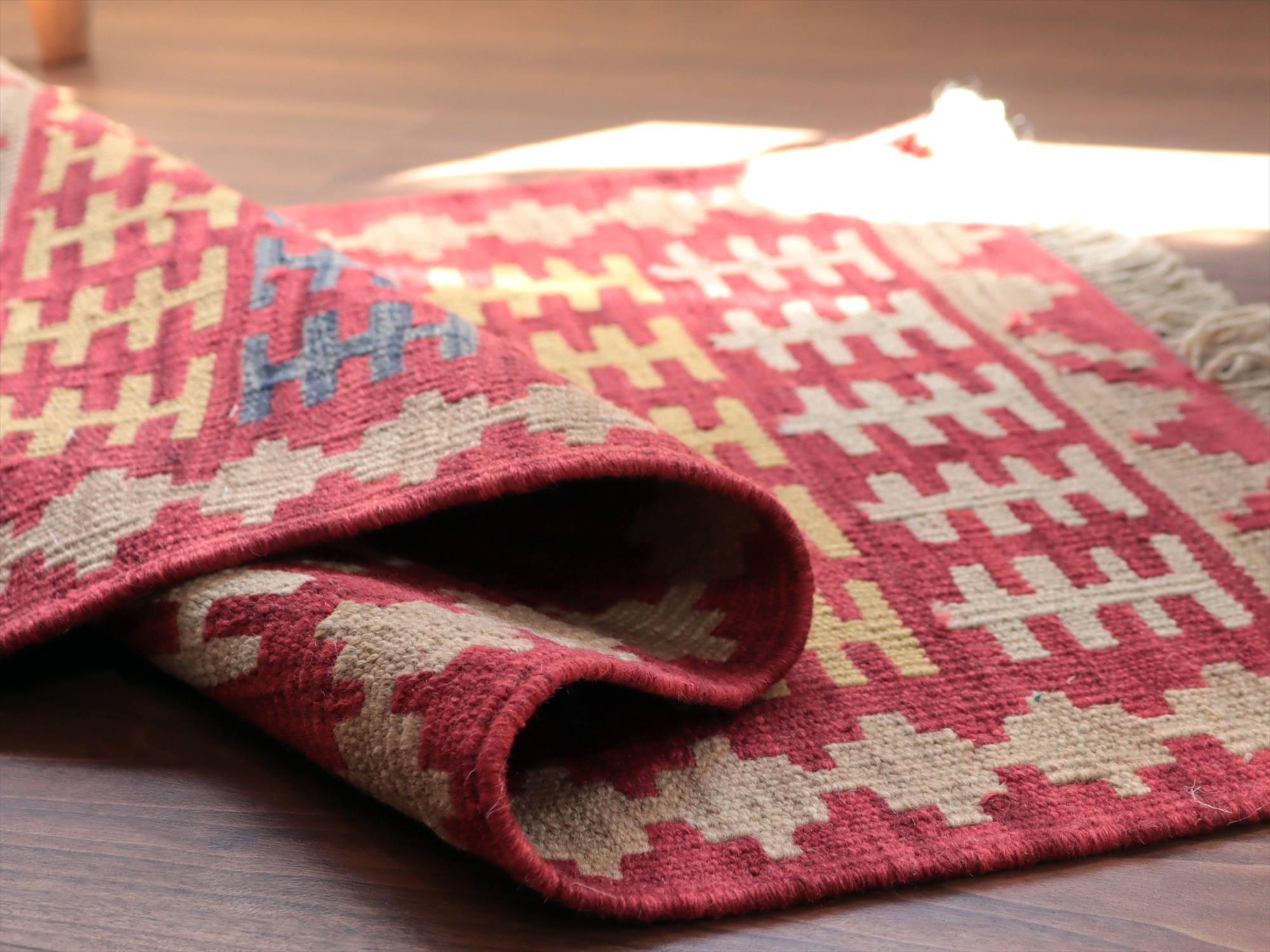 | 6-7mm程度の厚みがあり、パイル(毛足)がない平織りの敷物で表面は少しザラっとした肌ざわりです。織り手の自由なアイデアでデザインされていますので、左右対象でなかったり、モチーフが少しずれていたりということもありますが、世界で一枚だけの作品ですからその点はご了承ください。 |