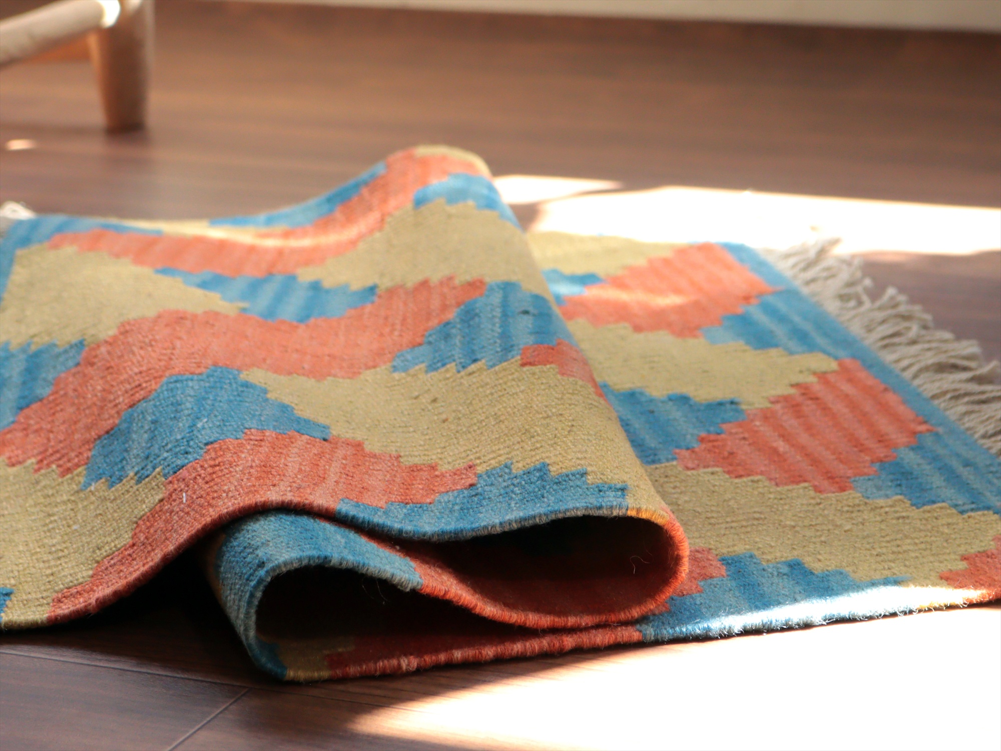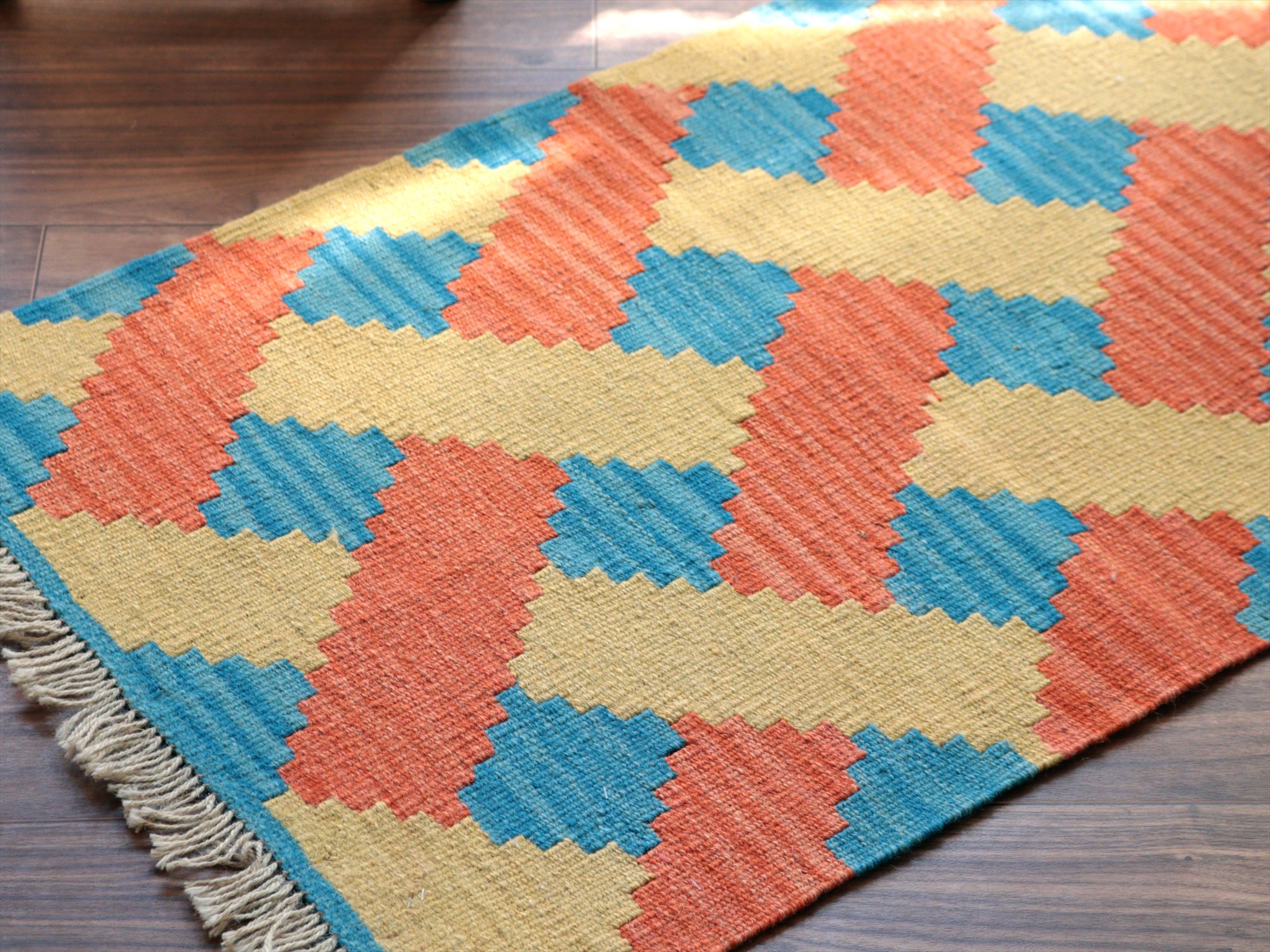 | 6-7mm程度の厚みがあり、パイル(毛足)がない平織りの敷物で表面は少しザラっとした肌ざわりです。織り手の自由なアイデアでデザインされていますので、左右対象でなかったり、モチーフが少しずれていたりということもありますが、世界で一枚だけの作品ですからその点はご了承ください。 |