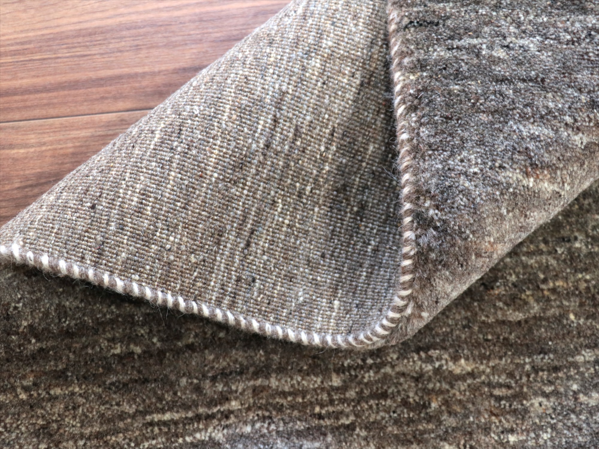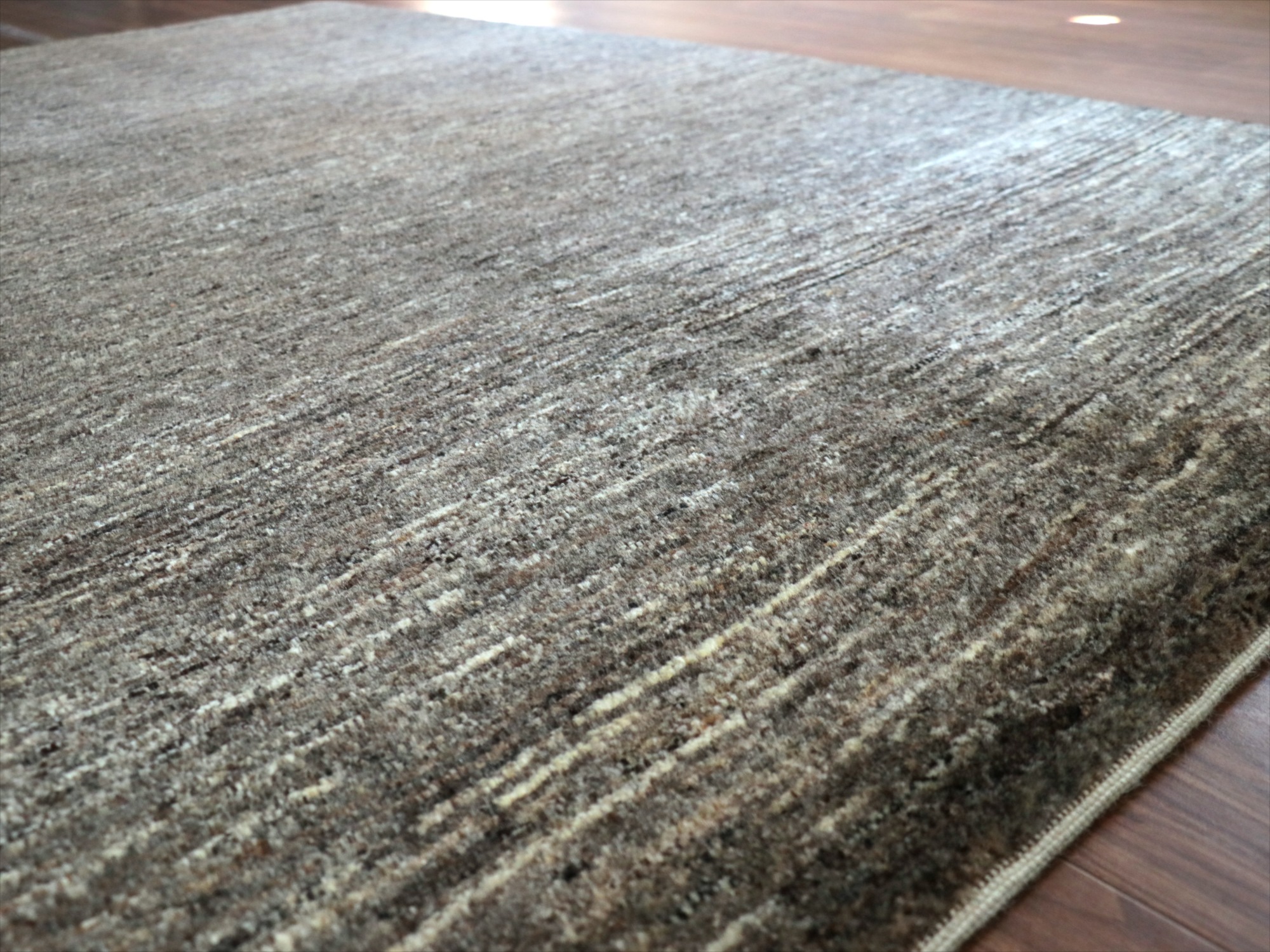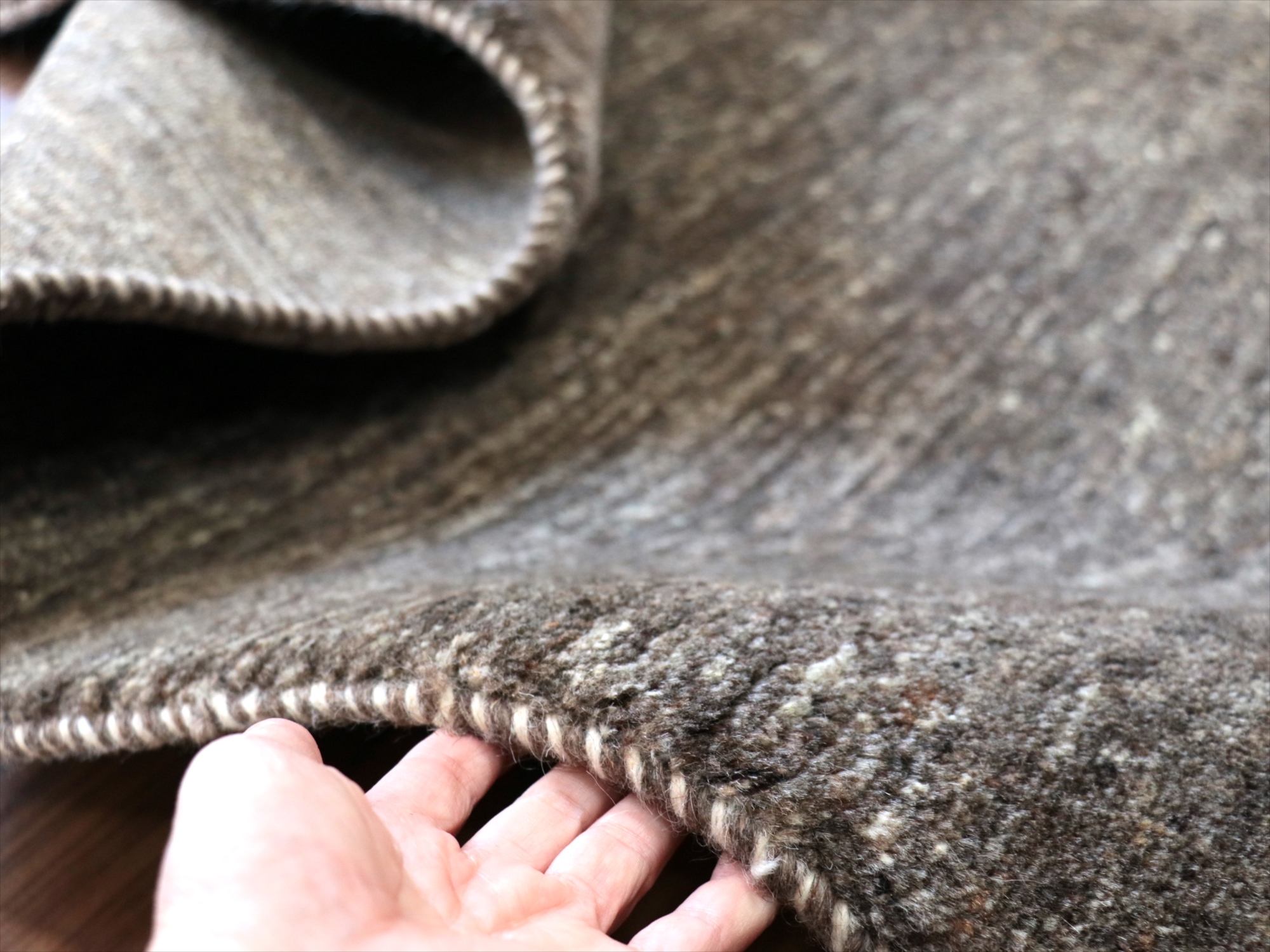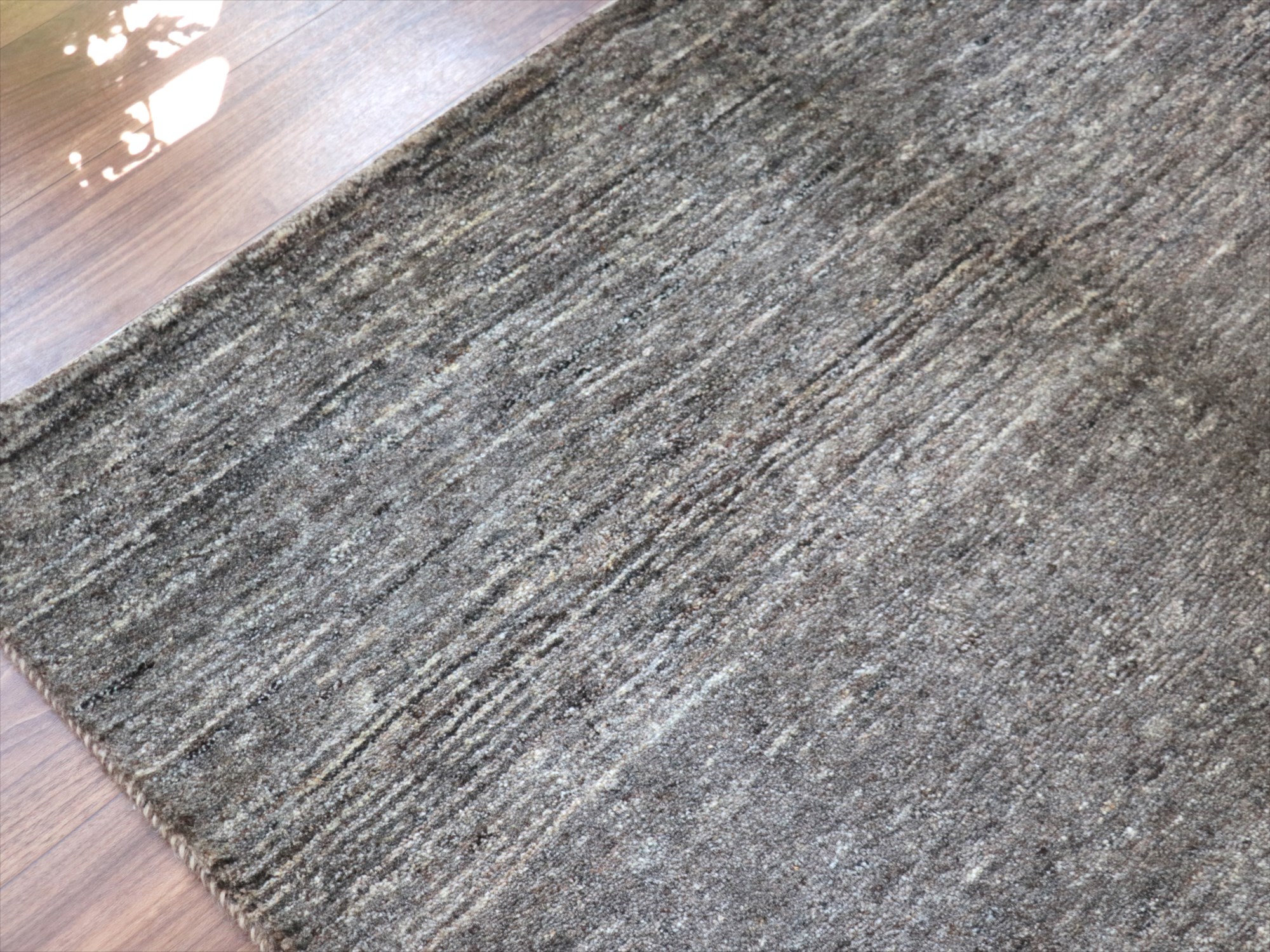 | 染められていない羊毛を使って織られたシンプルな無地のギャッベ。天然のウールの色合いの自然なグラデーションがよく出ています。遠目からみるとグレーですが、全体にブラウン系の色、濃淡の違うグレー、どころどころに明るめのグレーがストライプ状に重なっていて、クレヨンで塗りつぶしたような雰囲気。 |