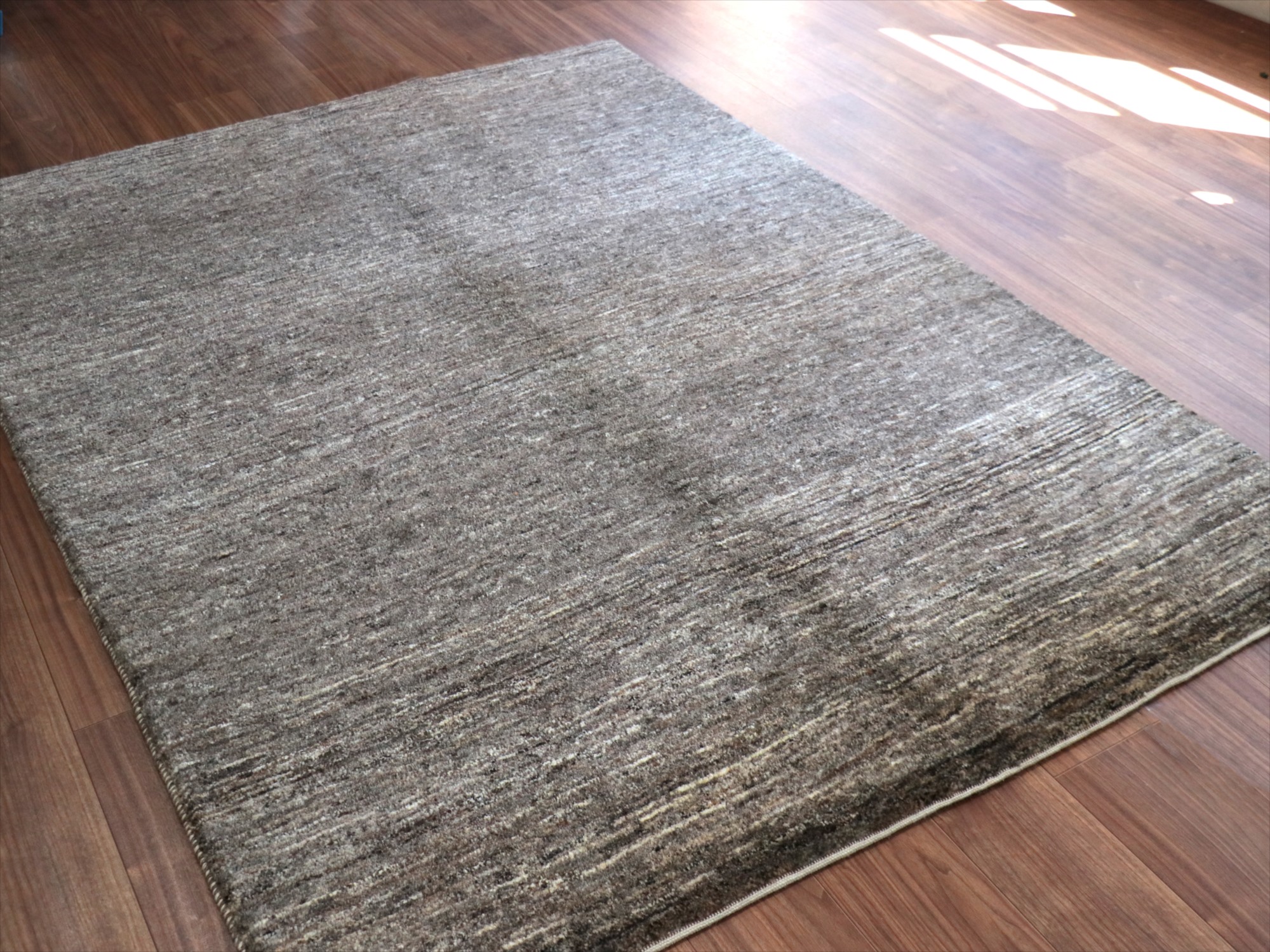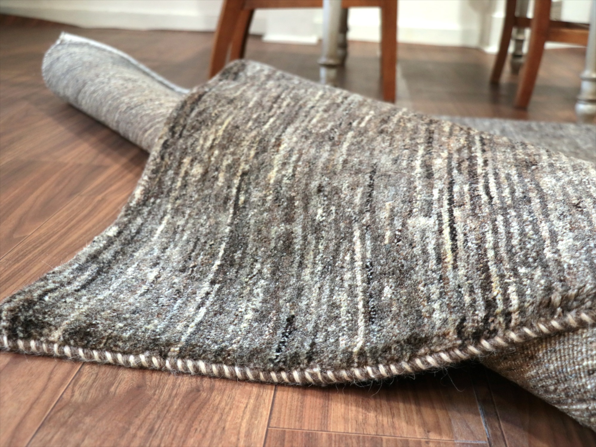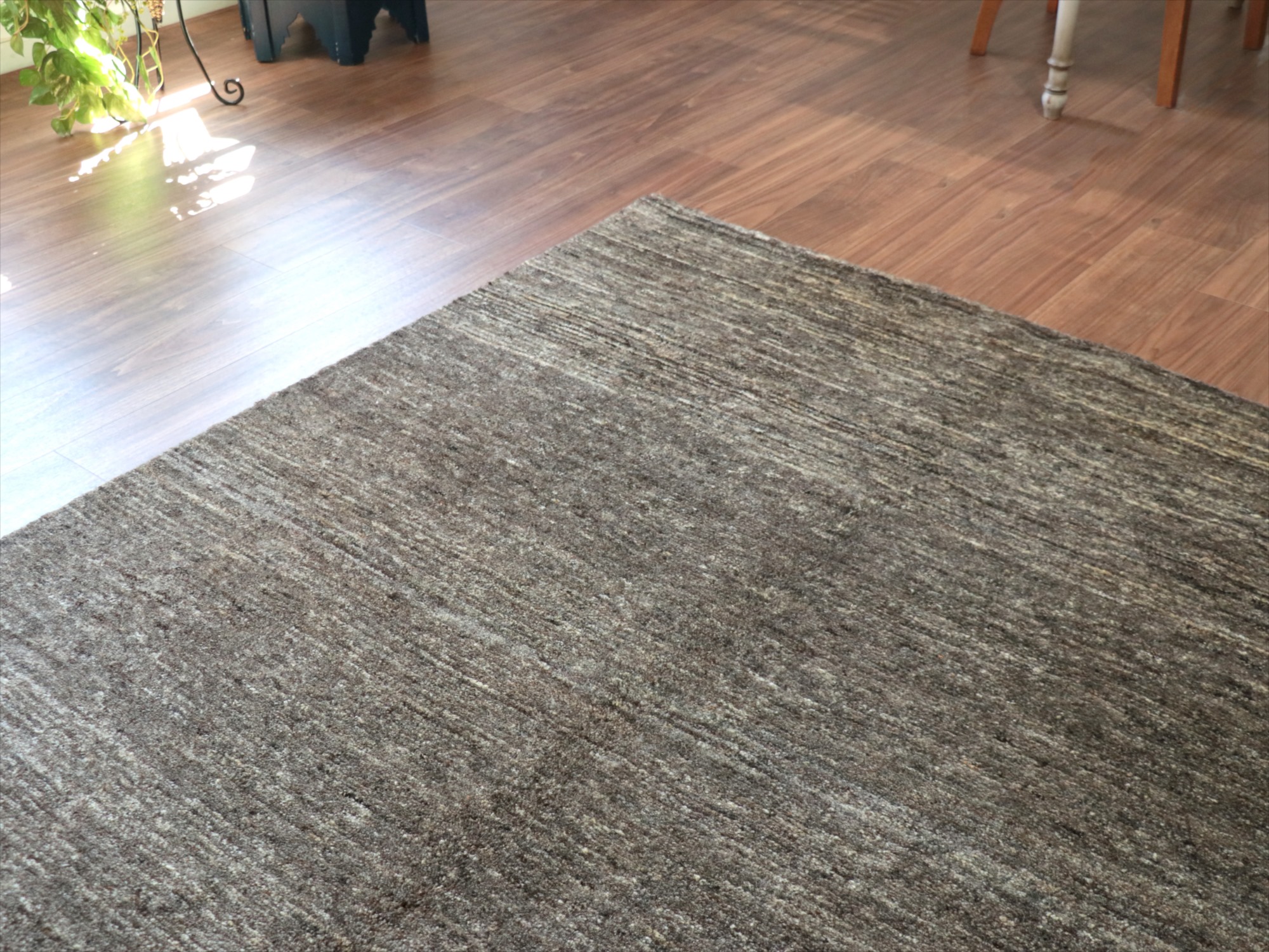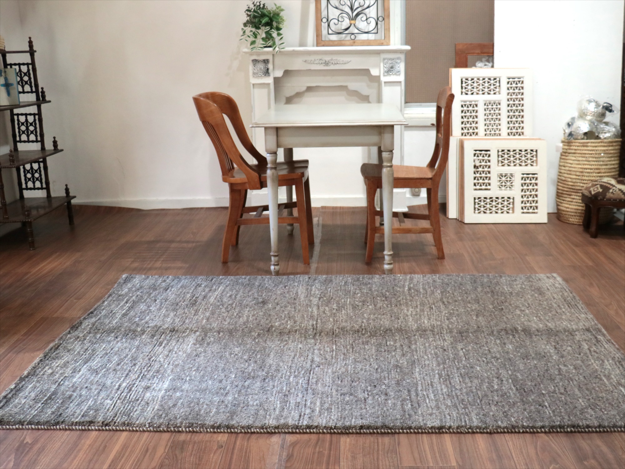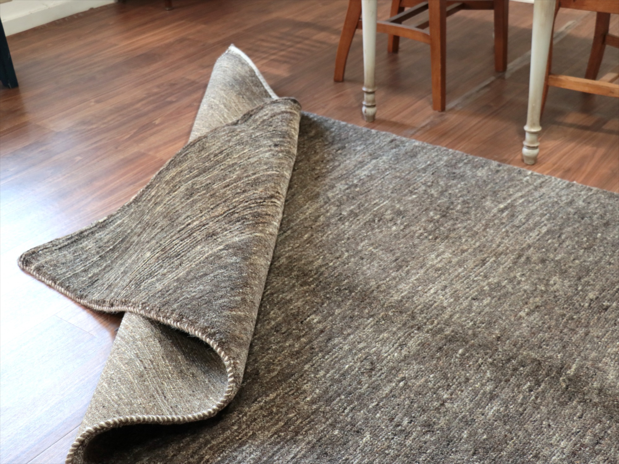 | 染められていない羊毛を使って織られたシンプルな無地のギャッベ。天然のウールの色合いの自然なグラデーションがよく出ています。遠目からみるとグレーですが、全体にブラウン系の色、濃淡の違うグレー、どころどころに明るめのグレーがストライプ状に重なっていて、クレヨンで塗りつぶしたような雰囲気。 |