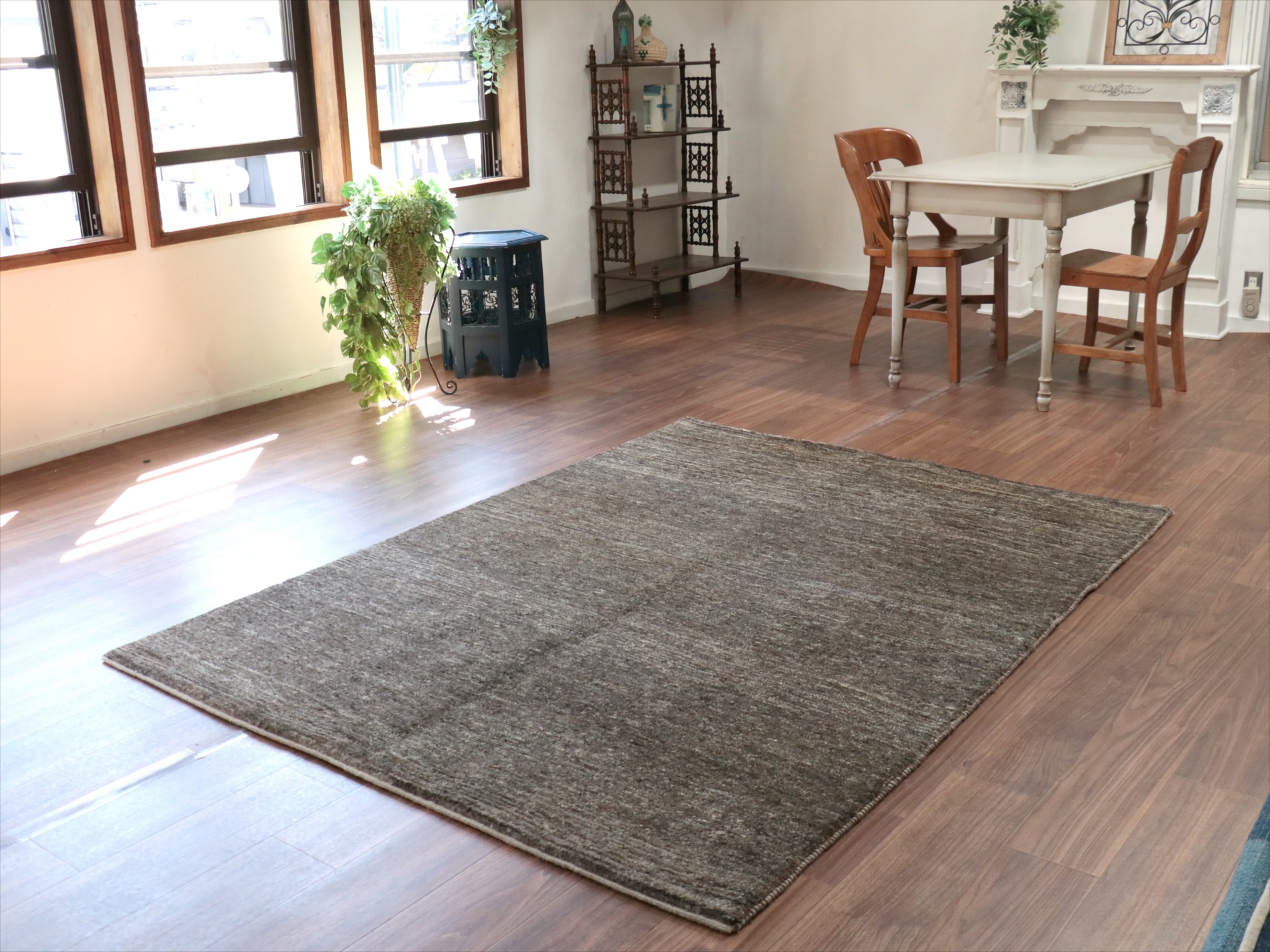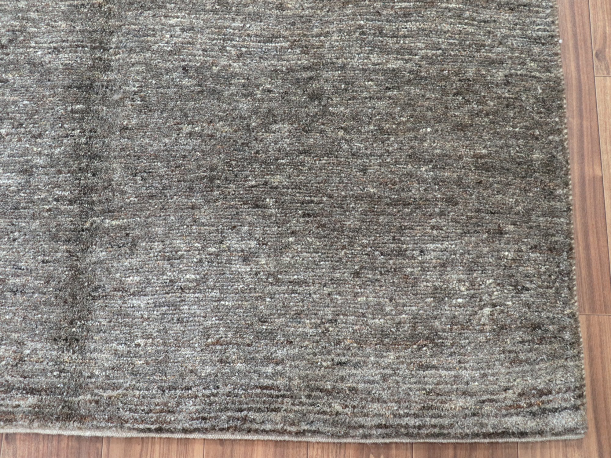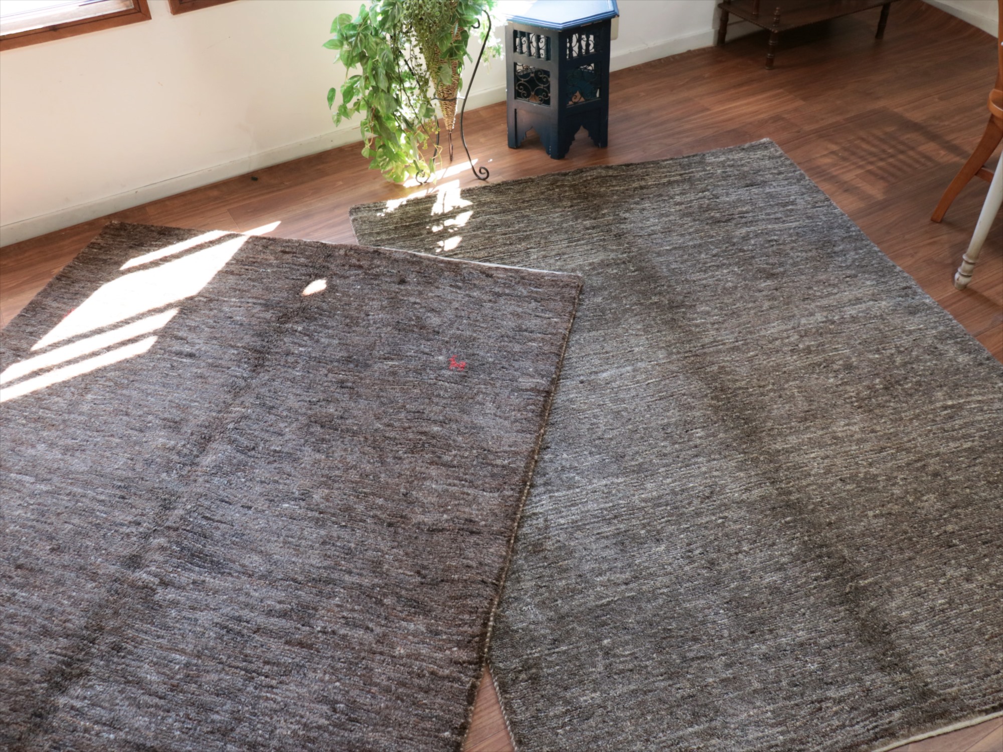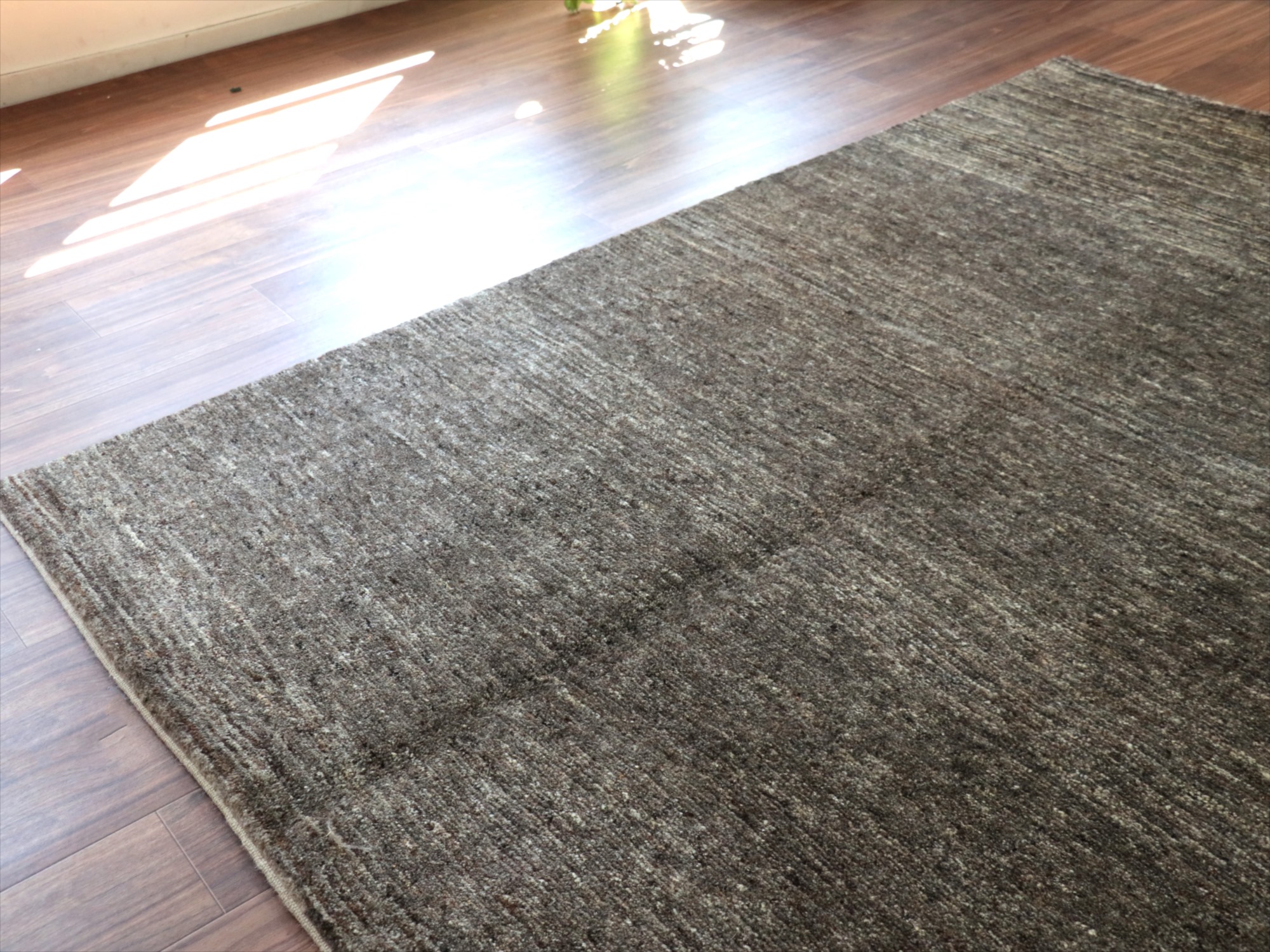 | 染められていない羊毛を使って織られたシンプルな無地のギャッベ。天然のウールの色合いの自然なグラデーションがよく出ています。遠目からみるとグレーですが、全体にブラウン系の色、濃淡の違うグレー、どころどころに明るめのグレーがストライプ状に重なっていて、クレヨンで塗りつぶしたような雰囲気。 |