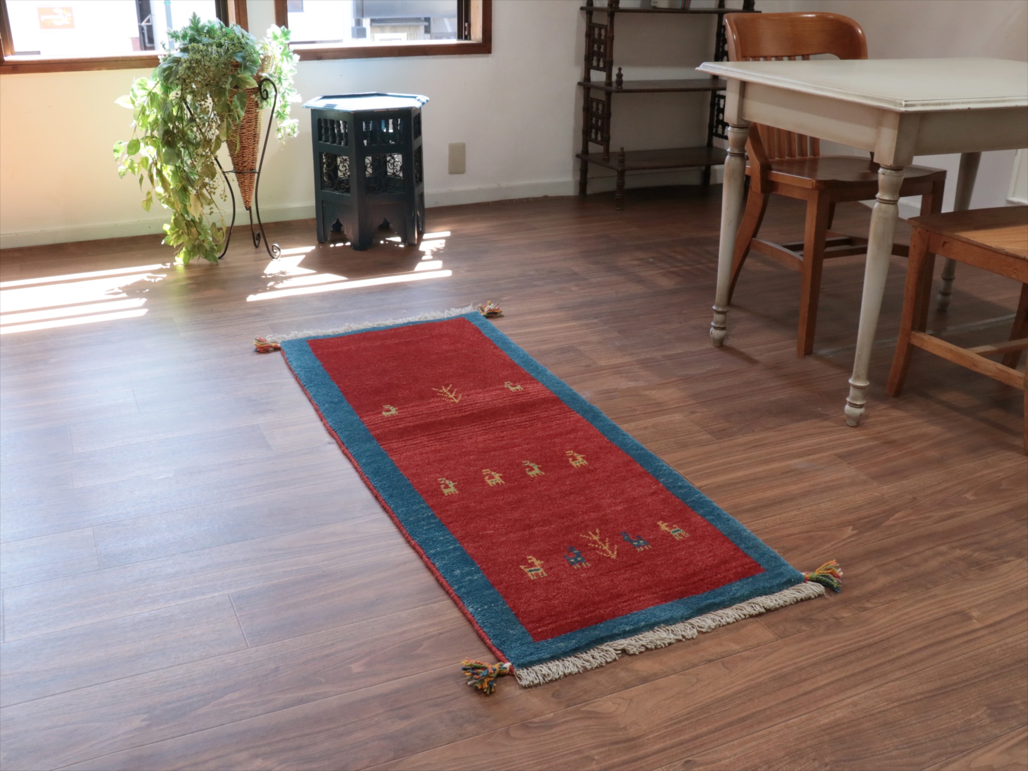 | このギャッベは、織られた年代は定かではありませんが、2000年代に織られたもので、販売されずに残っていたデッドストックです。色使いやモチーフの大きさ、デザインのバラツキなど、現代の洗練されたギャッベとは一味違う昔ながらの素朴な雰囲気が漂います。 額縁のようなボーダーのあるデザインは(特にランナーは)、2020年代にはいってからはあまり見かけなりましたので、新鮮な感じを受けます。これぞギャッベというデザインです。 |