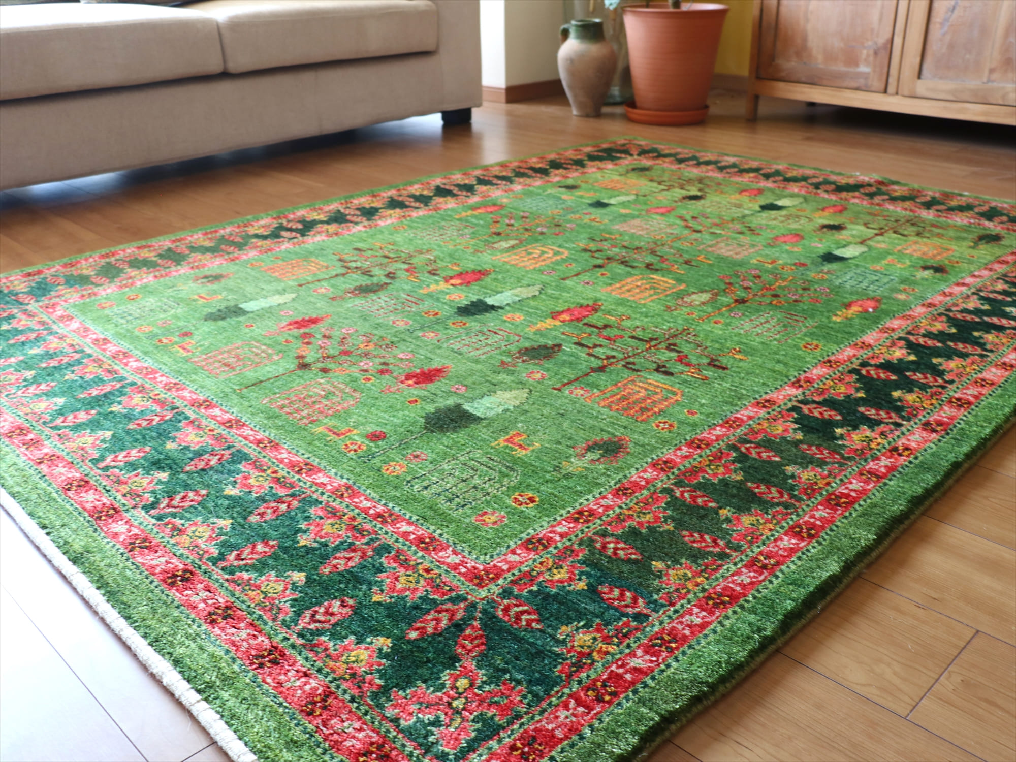 ギャッベ/Luribaft 最高級の織り207×156cmルリバフ・細かな織りの伝統柄リビングサイズグリーン・糸杉