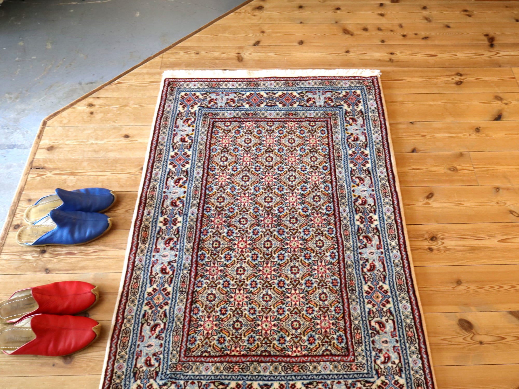 | アイボリー色をベースに、オレンジやグリーンで細かな連続模様が織り込まれたムード産の手織り絨毯。イラン東部からアフガニスタンにも一般に見られるヘラート文様で、小さな花びらの形はマヒ(魚)と表現されることもあります。モチーフの一部にはシルクの糸が使われ、光の当たり方によってはキラッと光って見えます。 このピースは、周囲のボーダー部分に水色が使われて、遠くから全体を見るとグレーっぽく見えます。 |