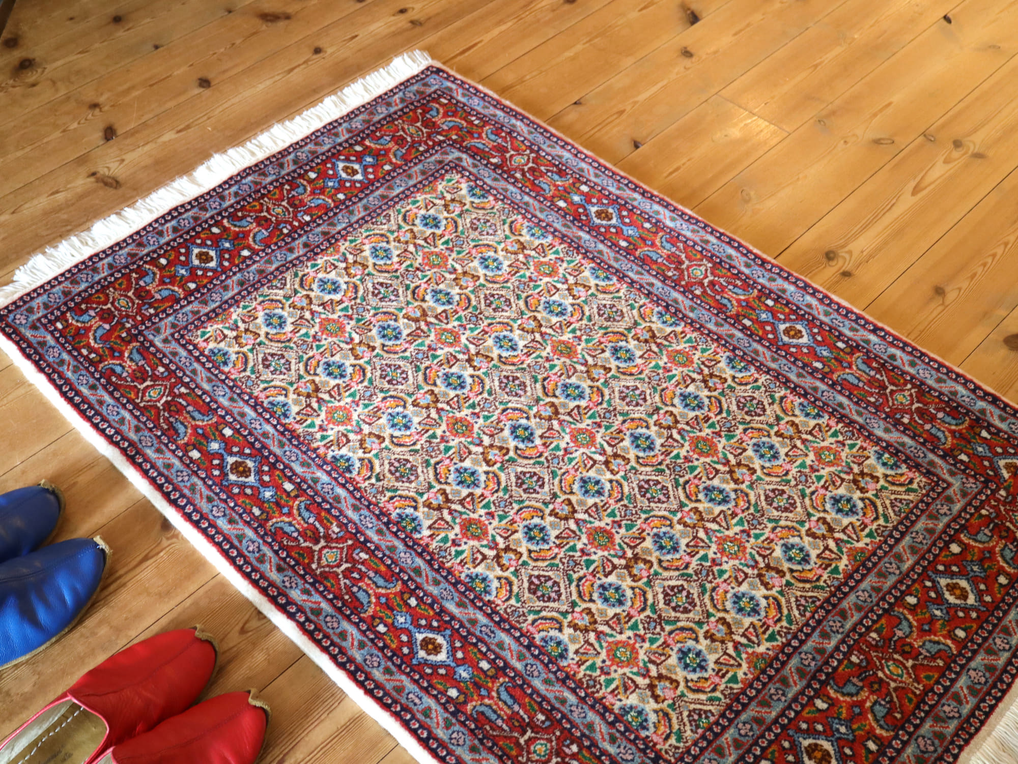 | クリーム色がかったアイボリーをベースに、オレンジやグリーンで細かな連続模様が織り込まれたムード産の手織り絨毯。イラン東部からアフガニスタンにも一般に見られるヘラート文様で、小さな花びらの形はマヒ(魚)と表現されることもあります。 この一枚は、赤と青の鮮やかなボーダーが美しく、バランスの取れたデザイン。モチーフの一部にはシルクの糸が使われ、光の当たり方によってはキラッと光って見えます。 |