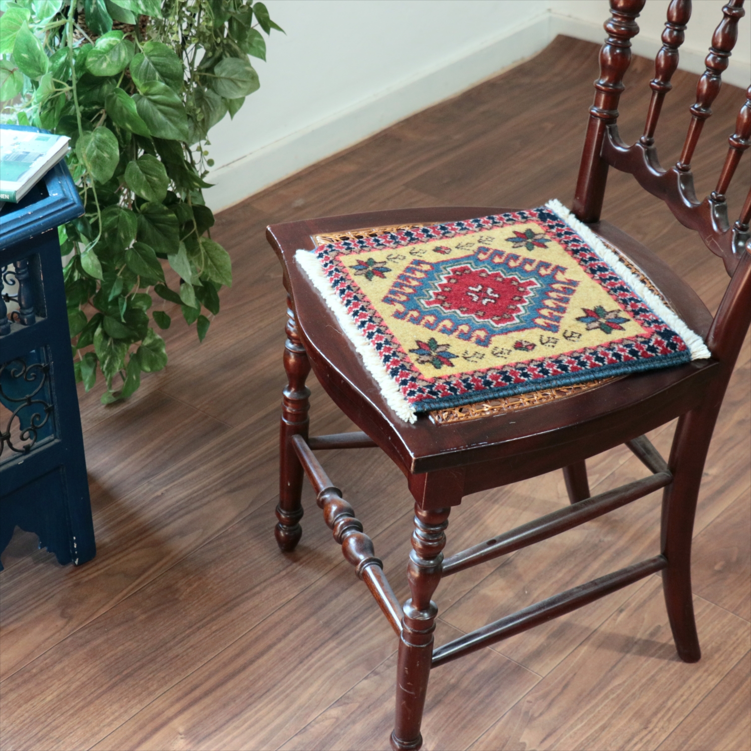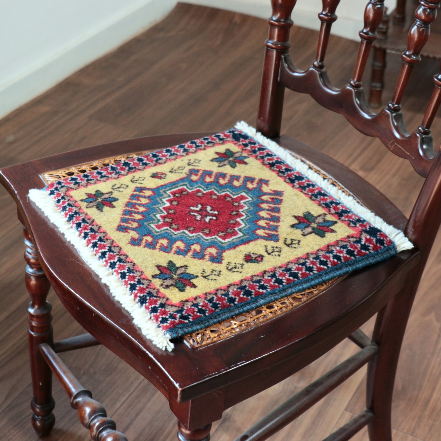 | 30cm角のミニサイズのラグ。小さいながらも、織りはしっかりしていて本格的です。多少ゆがみが気になりますが、ゆがみも含めて素朴な感じをお楽しみいただければと思います。 |
