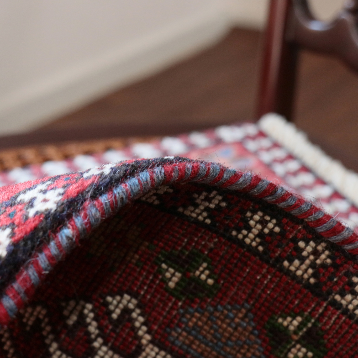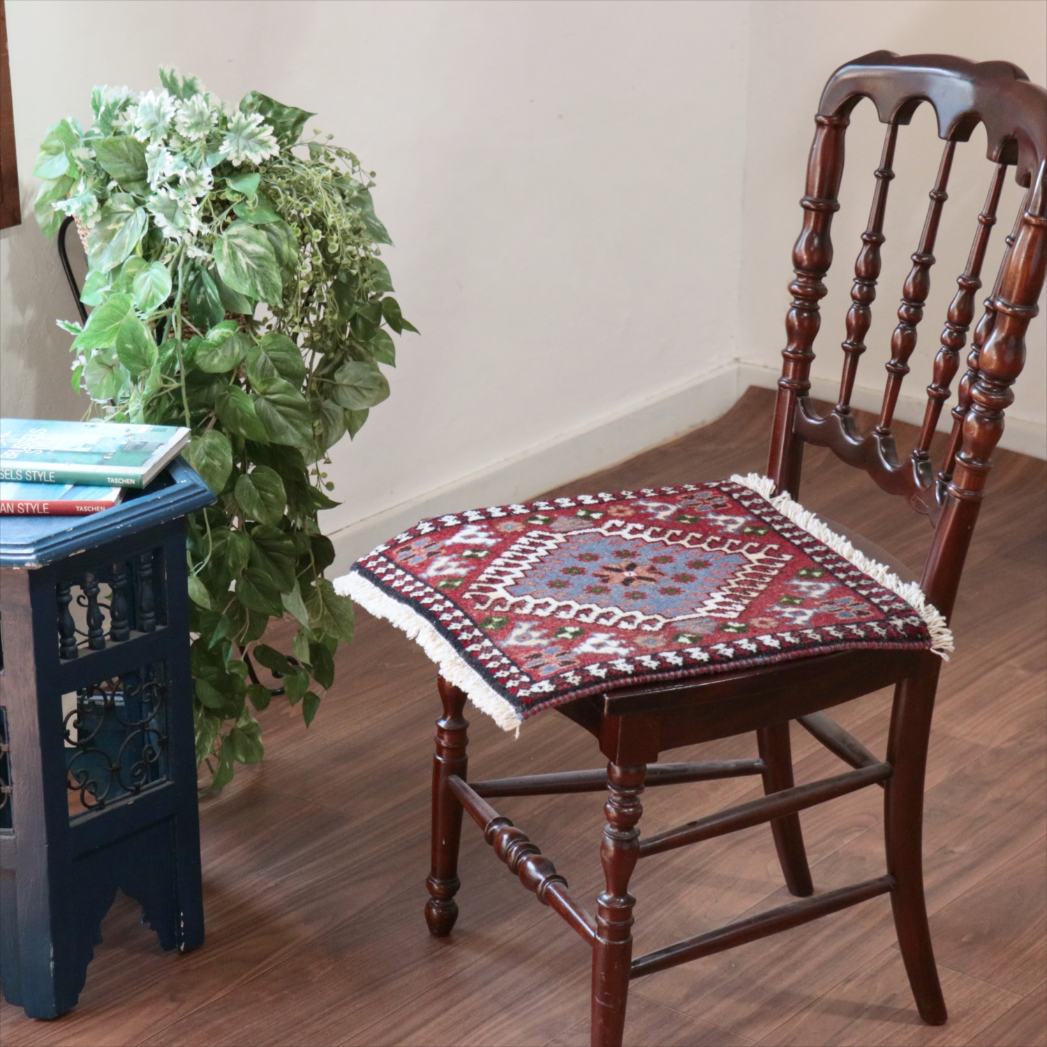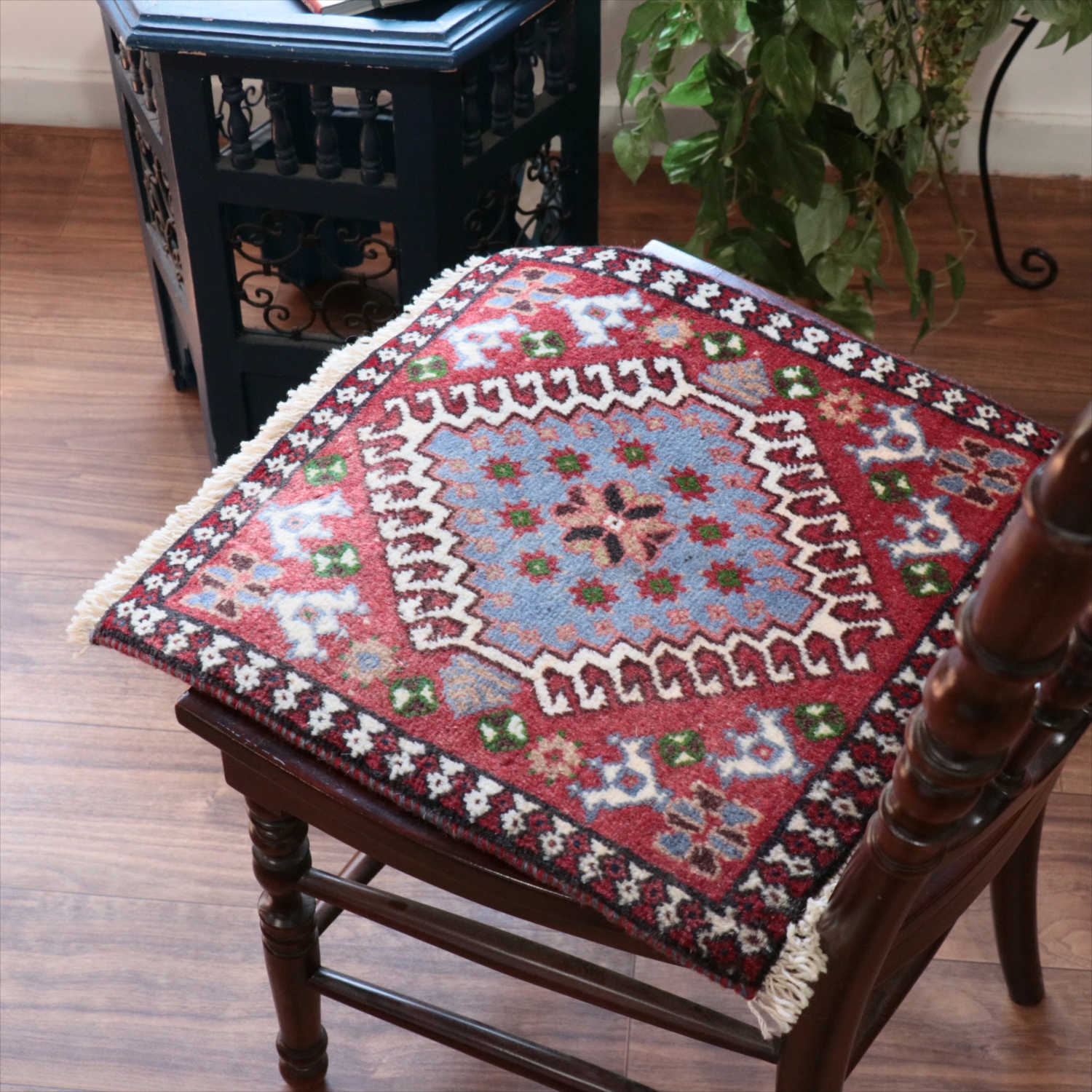 | 40cm角のミニサイズのラグ。小さいながらも、織りはしっかりしていて本格的です。多少ゆがみが気になりますが、ゆがみも含めて素朴な感じをお楽しみいただければと思います。 |