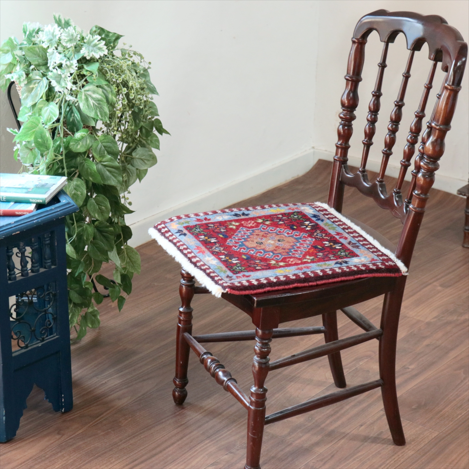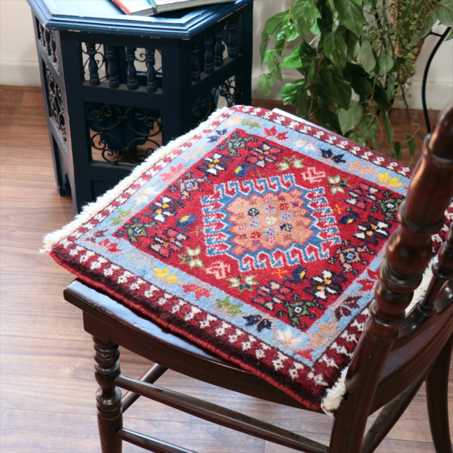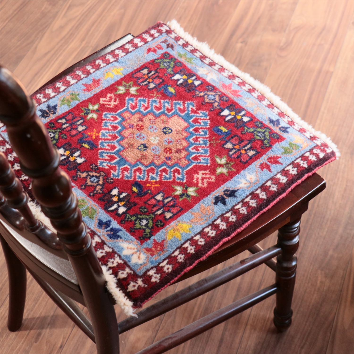 | 40cm角のミニサイズのラグ。小さいながらも、織りはしっかりしていて本格的です。多少ゆがみが気になりますが、ゆがみも含めて素朴な感じをお楽しみいただければと思います。 |