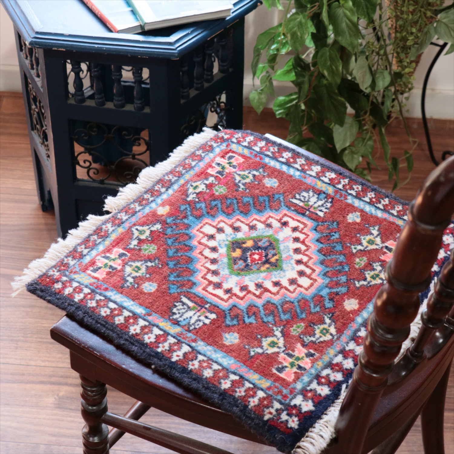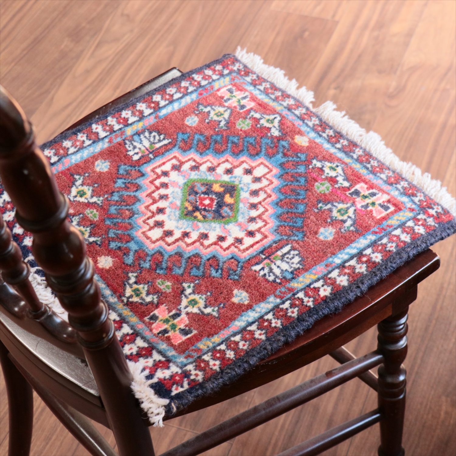 | 40cm角のミニサイズのラグ。小さいながらも、織りはしっかりしていて本格的です。多少ゆがみが気になりますが、ゆがみも含めて素朴な感じをお楽しみいただければと思います。 |