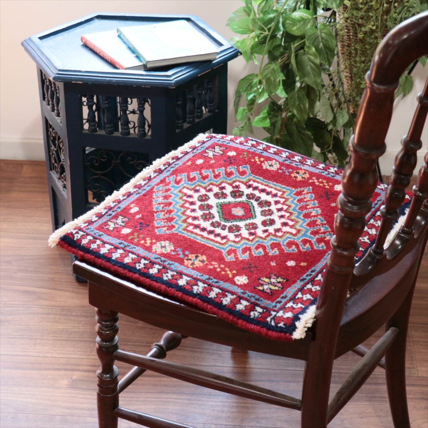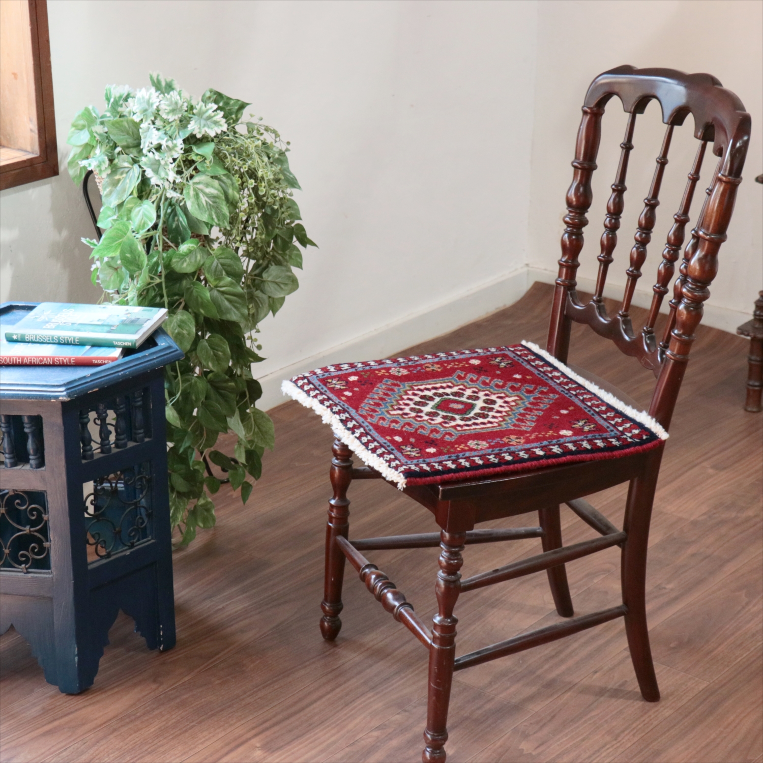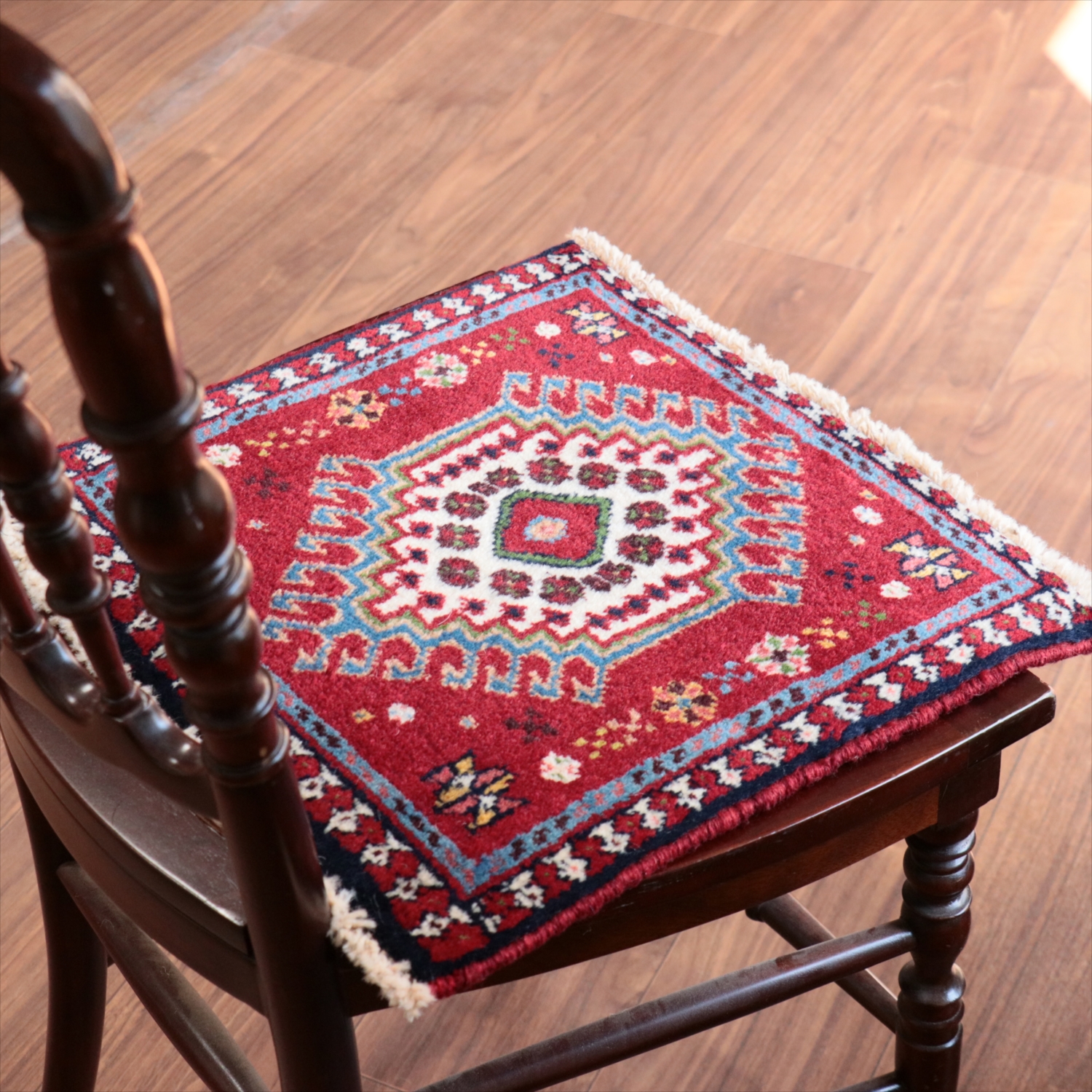 | 40cm角のミニサイズのラグ。小さいながらも、織りはしっかりしていて本格的です。多少ゆがみが気になりますが、ゆがみも含めて素朴な感じをお楽しみいただければと思います。 |