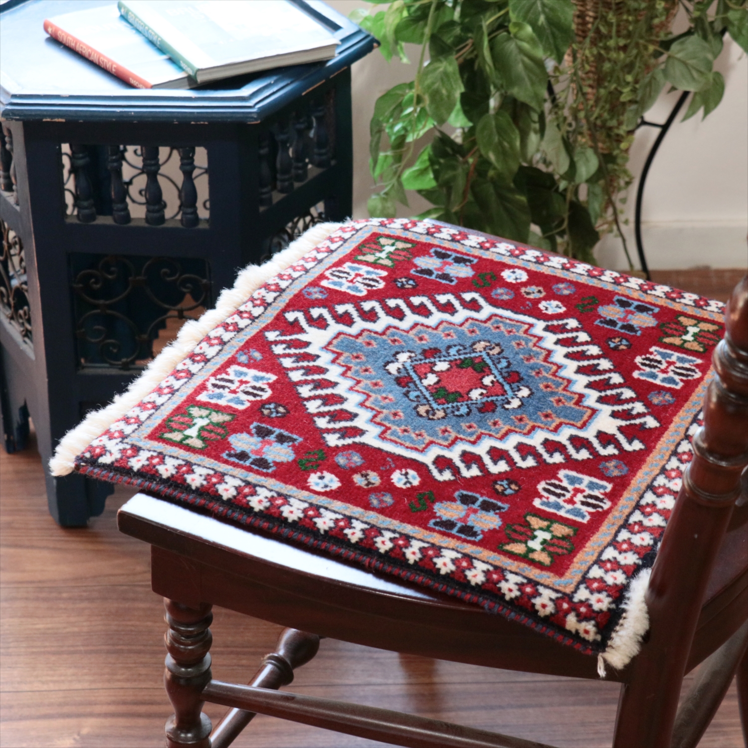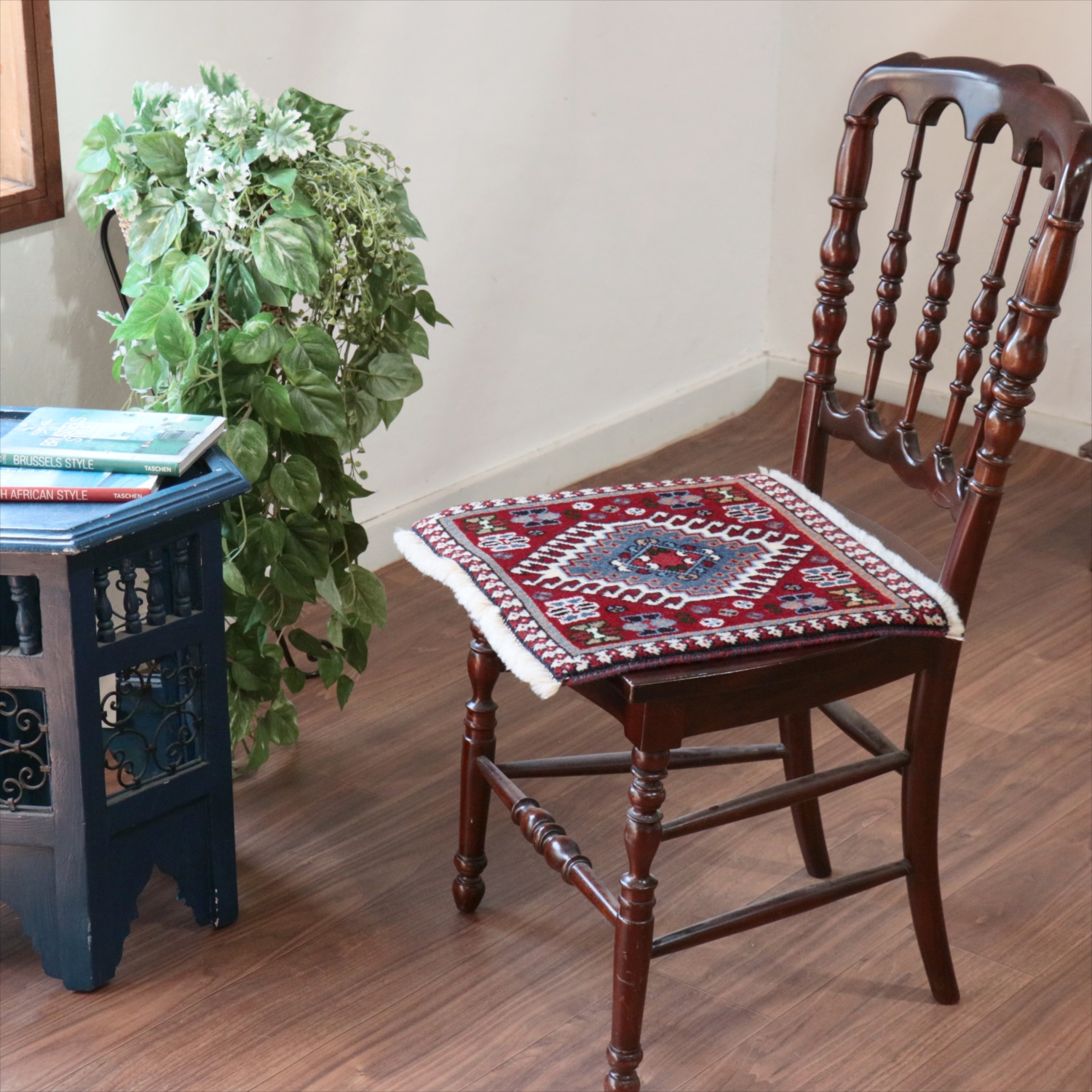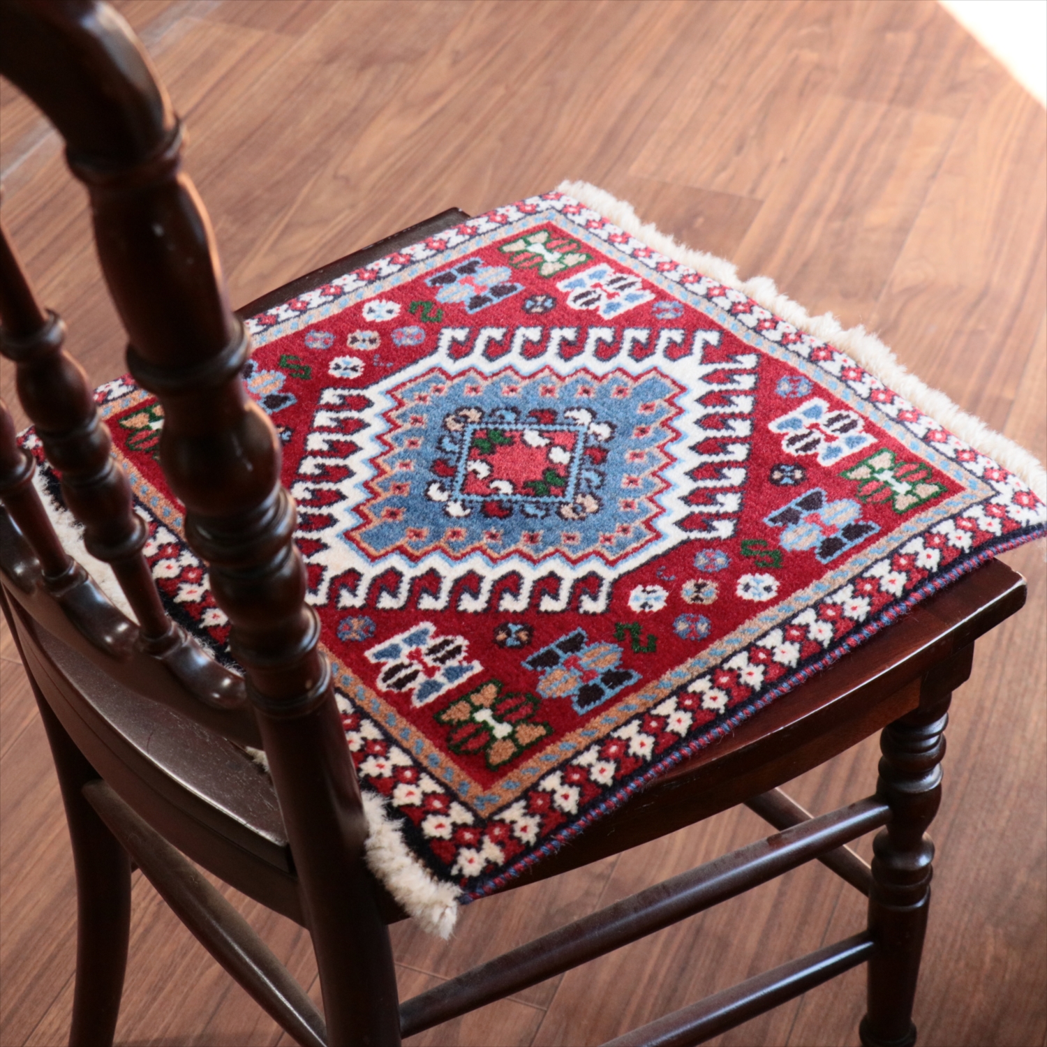 | 40cm角のミニサイズのラグ。小さいながらも、織りはしっかりしていて本格的です。多少ゆがみが気になりますが、ゆがみも含めて素朴な感じをお楽しみいただければと思います。 |