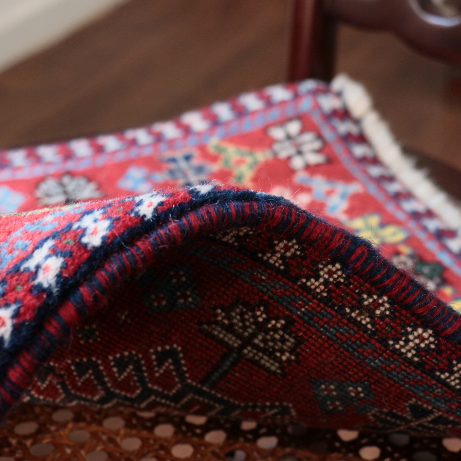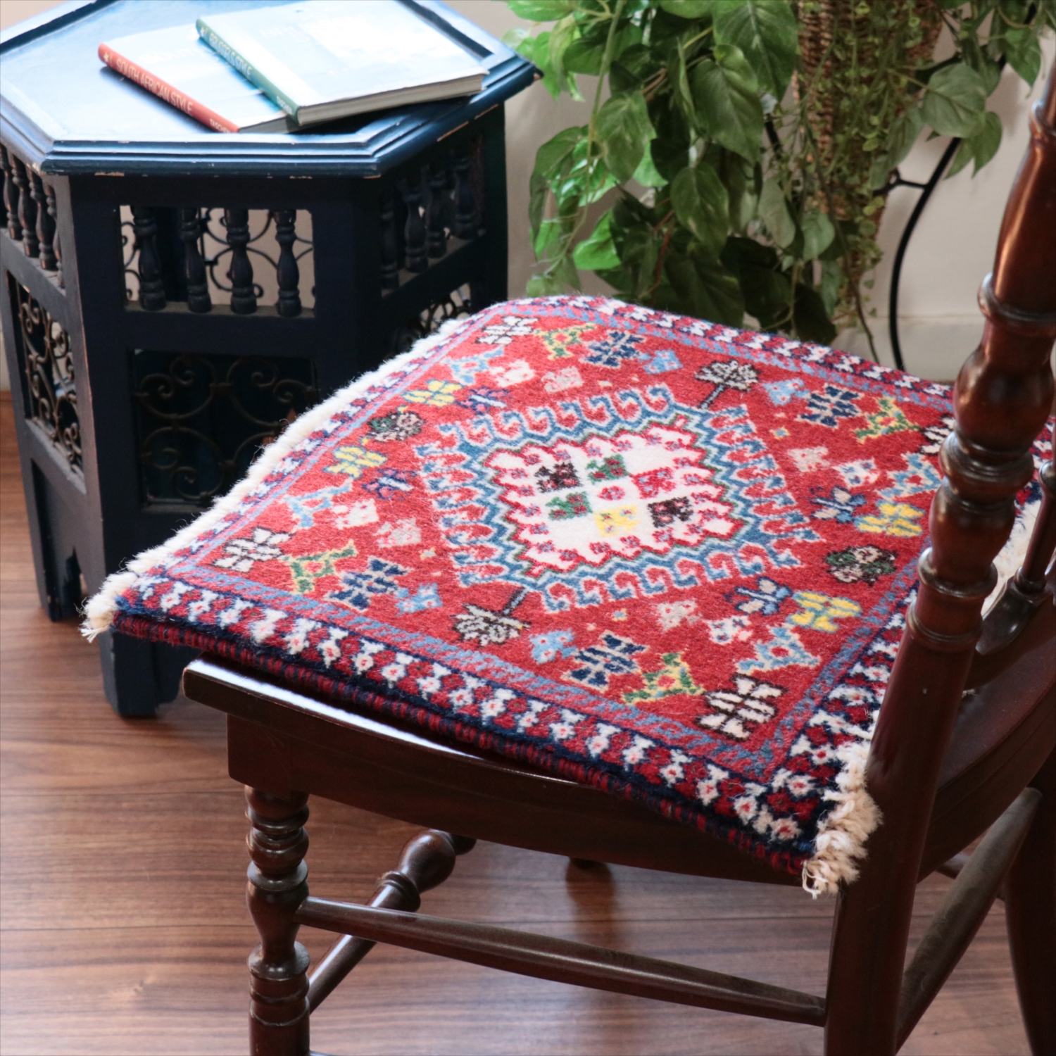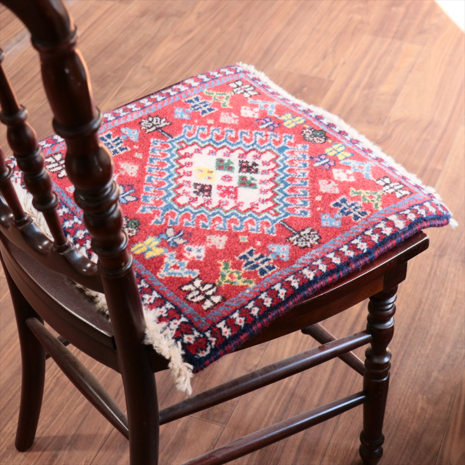 | 40cm角のミニサイズのラグ。小さいながらも、織りはしっかりしていて本格的です。多少ゆがみが気になりますが、ゆがみも含めて素朴な感じをお楽しみいただければと思います。 |
