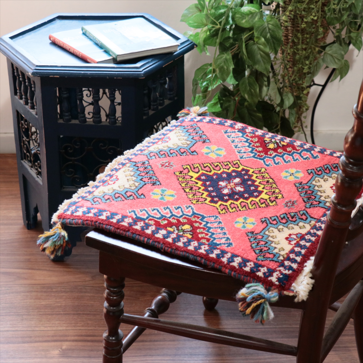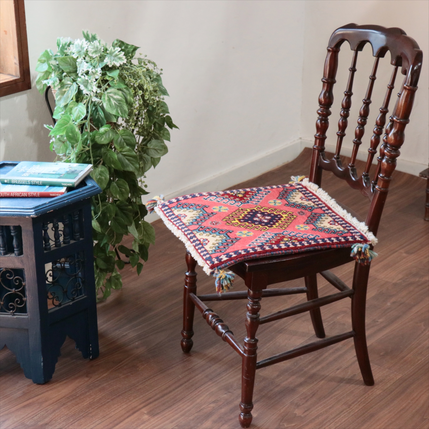 | 40cm角のミニサイズのラグ。小さいながらも、織りはしっかりしていて本格的です。多少ゆがみが気になりますが、ゆがみも含めて素朴な感じをお楽しみいただければと思います。 |