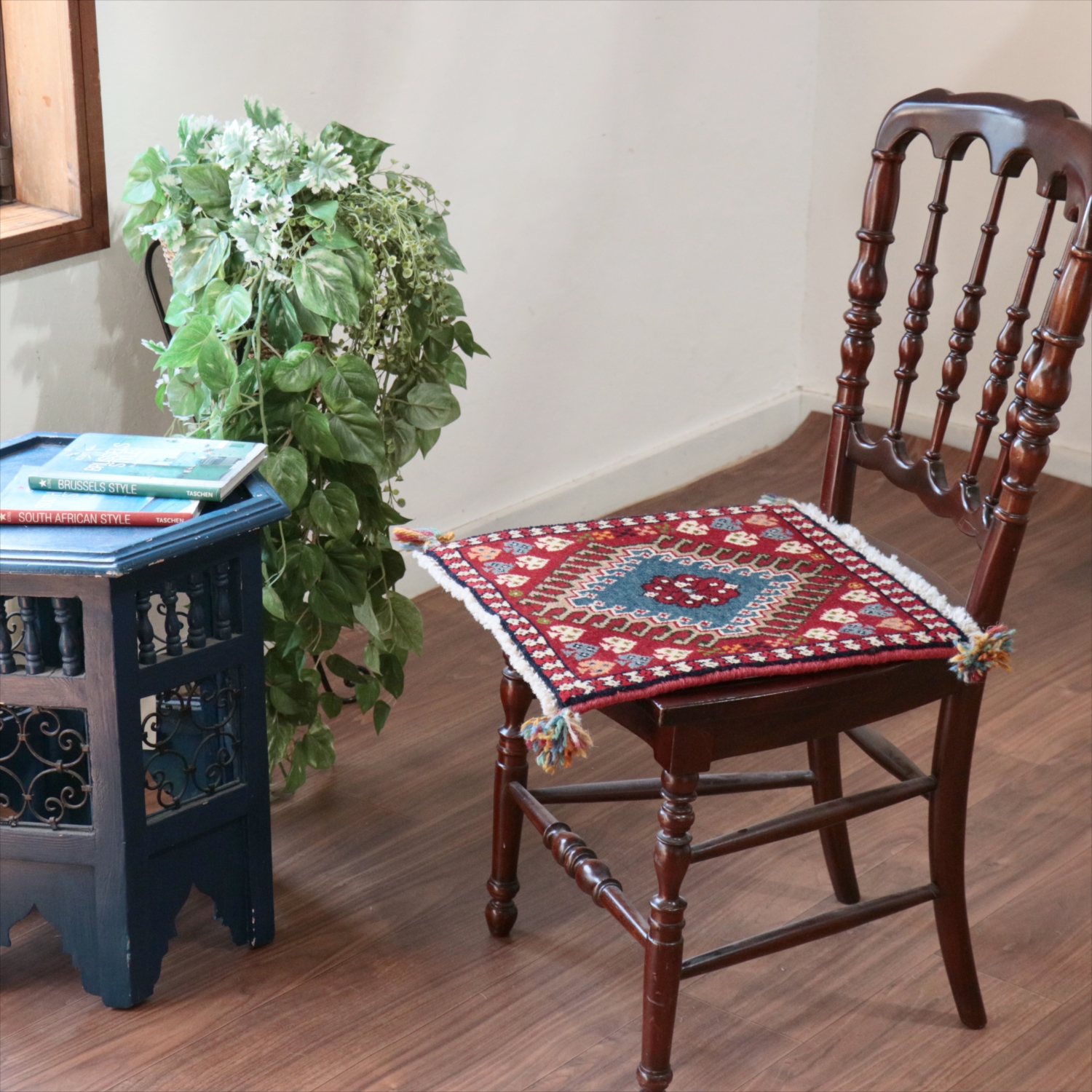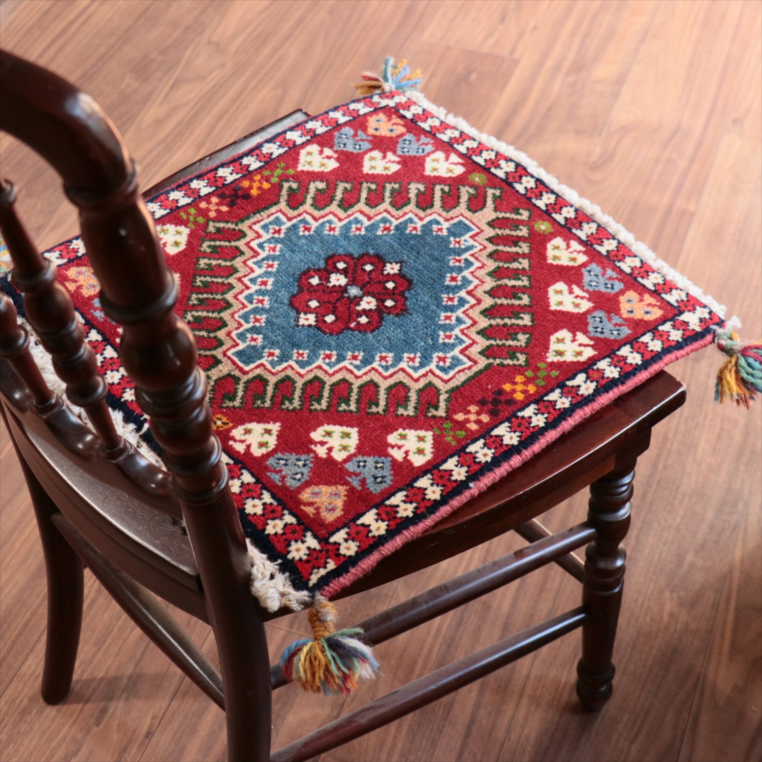| 40cm角のミニサイズのラグ。小さいながらも、織りはしっかりしていて本格的です。多少ゆがみが気になりますが、ゆがみも含めて素朴な感じをお楽しみいただければと思います。 |