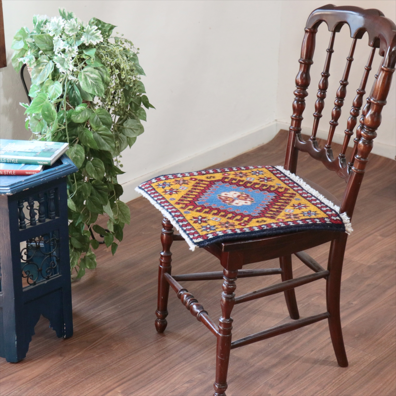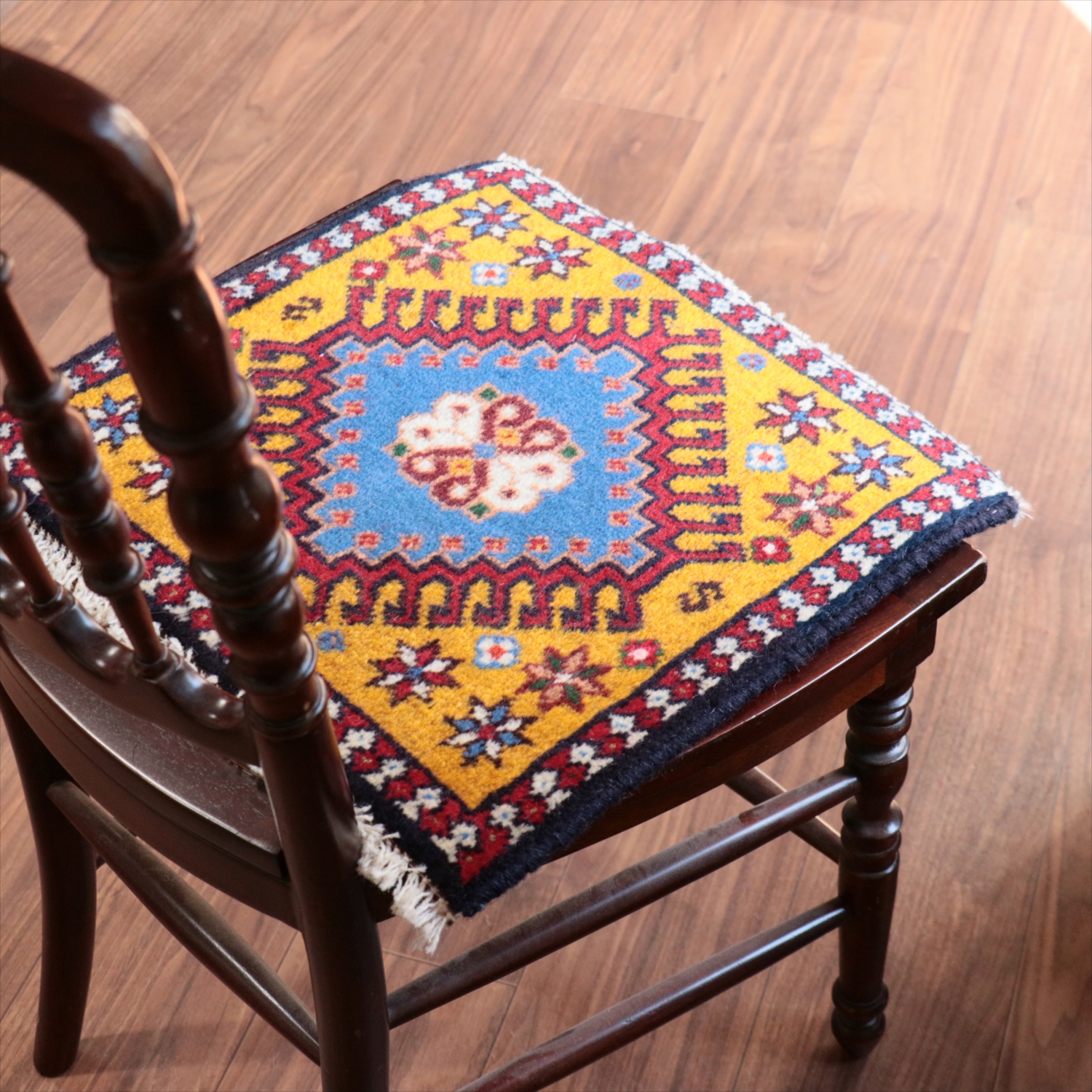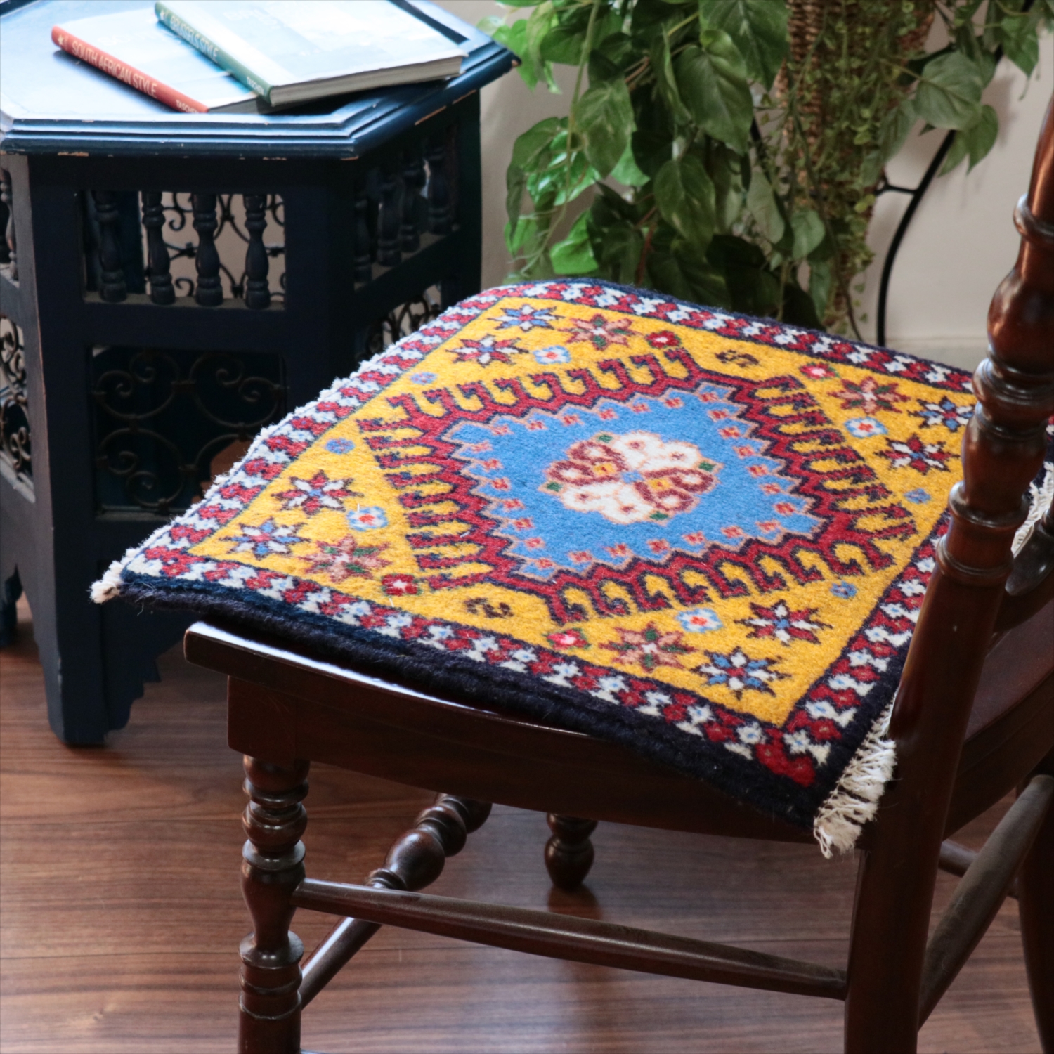 | 40cm角のミニサイズのラグ。小さいながらも、織りはしっかりしていて本格的です。多少ゆがみが気になりますが、ゆがみも含めて素朴な感じをお楽しみいただければと思います。 |