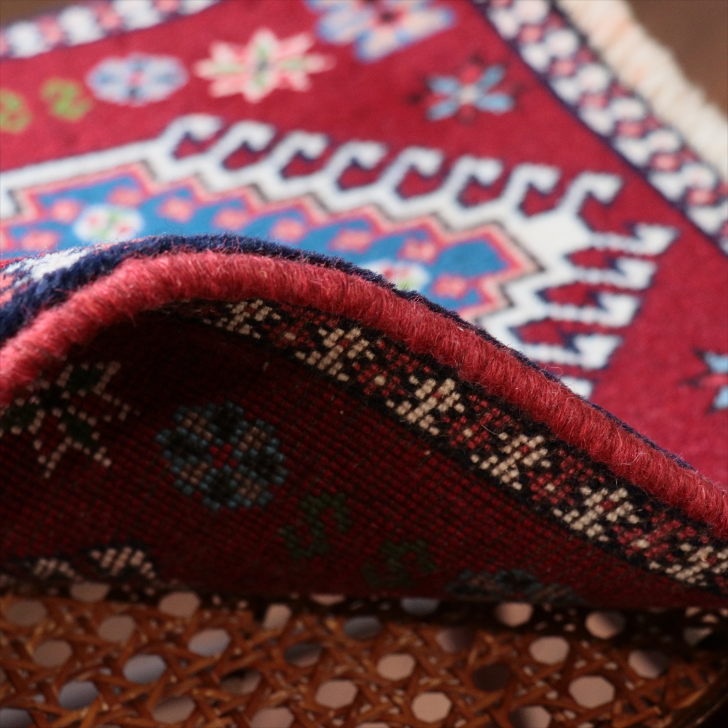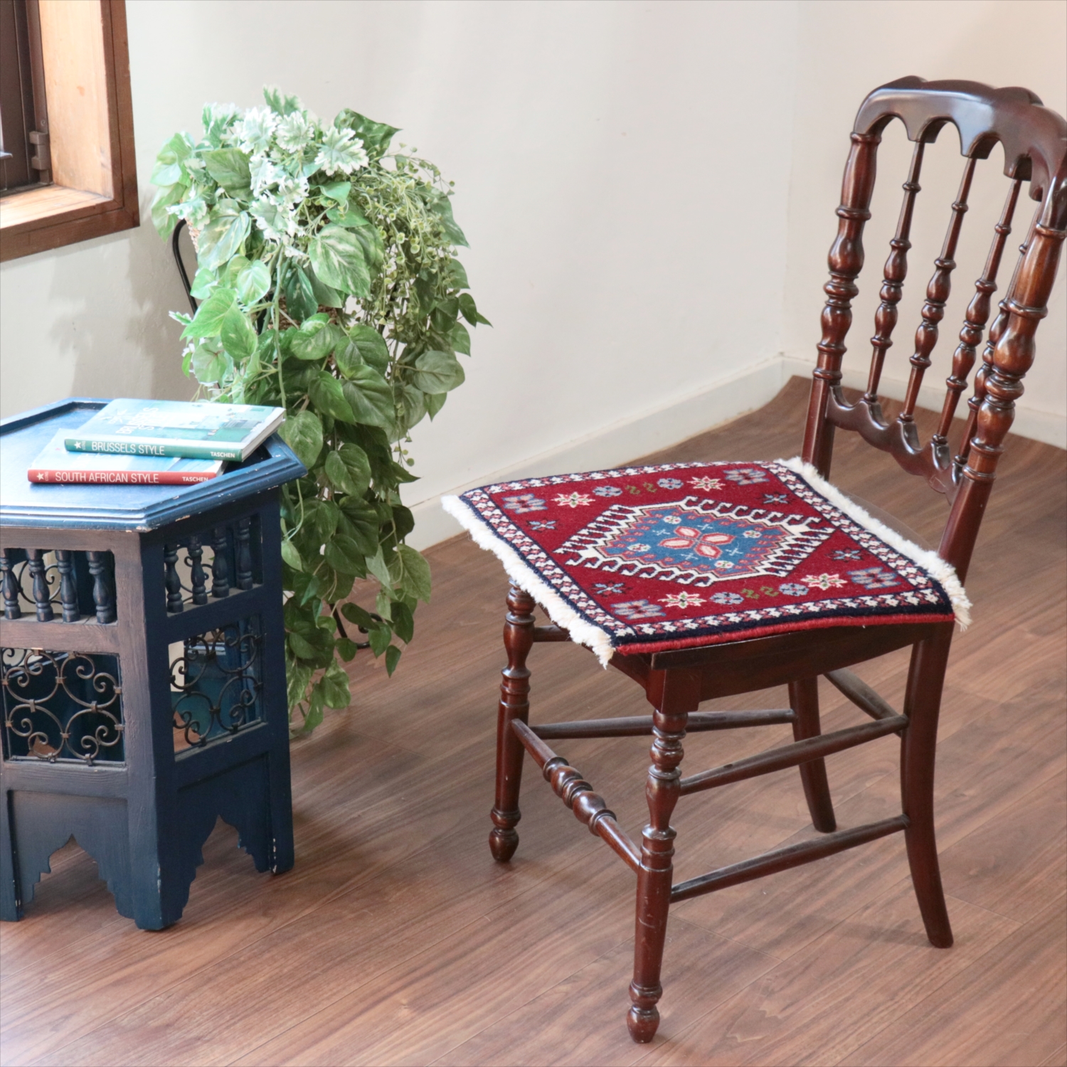 | 40cm角のミニサイズのラグ。小さいながらも、織りはしっかりしていて本格的です。多少ゆがみが気になりますが、ゆがみも含めて素朴な感じをお楽しみいただければと思います。 |